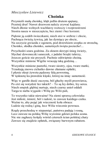 Mieczysław Lisiewicz Choinka Przynieśli małą choinkę, kłąb jedlin drutem spętany, Przetnij drut! Nawet drzewom należy zrywać kajdany. Niech dłonie wolnych wachlarzy roztoczy i rozprzestrzeni Siostra nasza w nieszczęściu, bez ziemi i bez korzeni. Pięknie ją ozdób świeczkami, niech stoi w srebrze i złocie, Pachnąca świeżą żywicą, jak las dymiący po słocie, Na szczycie gwiazda z ogonem, pod drzewkiem szopka ze strzechą, Choinko, słodka choinko, samotnych święta pociecho!... Przychodzi szara godzina. Za oknem skrzypi śnieg świeży, Słychać dzwoneczki saneczek, z jadalni brzęki talerzy, Jeszcze goście nie przyszli. Pachnie odświętnie choiną. Wszystkie minione Wigilie wracają taką godziną… Wszystkie minione pasterki, twarz siostry, ojca, twarz matki, Trzaskają znowu cichutko dawno złamane opłatki, I płynie okręt żywota pędzony falą powrotną, W tęsknotę ku prawdzie klęski, której na imię: samotność. Więc w gardle dusić zaczyna, ból głuchy myśli przewierca, Po cóż się wstydzić łez takich? – To są łzy dobre, łzy serca. Niech smętek głębiej nurtuje, niech czarny anioł oddali Targa te nieba wygasłe i Wilię po Wilii pali, To wszystko takie nieważne! Na ziemi sprawą człowieka Jest miłość, śmierć, ból i radość, to zawsze każdego czeka. Ważne to, aby pojąć jak wieczność koła obraca: Ludzie się rodzą i giną, lecz Wilia wiecznie powraca. Rządy przechodzą w niepamięć, państwa padają i rosną, Lecz zawsze na polską Wilię wyrośnie gdzieś polska sosna. Nic nie zagłuszy kolędy wśród czterech ścian polskiej chaty Zawsze się znajdzie opłatek, związany barwnym rabatem. 4 KRESOWE STANICE Spójrz oknem! Choć tu na szybach mróz palm wzorzystych nie kuje I tylko beton na drodze, jak czarna rzeka faluje, Choć pusto, obco i cudzo – w kącie pokoju choina, Gdzie zaś to drzewko maleńkie, tam Polska, dom i rodzina Więc otrzyj te łzy niewczesne, już błyszczy gwiazdka na Wschodzie Już ziemskie truchleją moce, Bóg Wszechmogący się rodzi. Wznieś rękę, o Boże Dziecię, błogosław Ojczyznę miłą I w tej najgorszej potrzebie, wspieraj Jej siłę Swą siłą. Winieta powyżej autorstwa Pawła Moskwy Mieczysław Lisiewicz – lotnik, pisarz, poeta. Urodził się 28 stycznia 1887 r. we Lwowie. Oficer lotnictwa – obserwator w 6 pułku lotniczym we Lwowie. Studia prawnicze na Uniwersytecie Jana Kazimierza. Dziennikarz, literat i kierownik lwowskich teatrów miejskich. Autor wielu książek (m.in. Kroniki Naroczańskie, Gdzie goręcej biją serca, Z pamiętnych dni. Wspomnienia adiutanta), sztuk scenicznych i wierszy, przeznaczonych również dla młodzieży. Na emigracji wojennej – oficer do zleceń MSW (Paryż), adiutant sztabowy gen. Władysława Sikorskiego, a następnie w dowództwie Polskich Sił Powietrznych w Wielkiej Brytanii. Zmarł 2 września 1975 r. w Londynie. Pozostawił ogromny dorobek pisarski, wzbogacający polską literaturę. Ostatni wiersz Mieczysława Lisiewicza „Śmierć ptaka” zamieściliśmy w Nr 2/2010 (49) KRESOWYCH STANIC w lipcu 2010 r. (M.M. – m.in. na podstawie Antologii Poezji i Prozy Lotniczej II wyd. Polska Fundacja Kulturalna, Londyn 1988, z której pochodzi również zamieszczony powyżej wiersz). KRESOWE STANICE 5