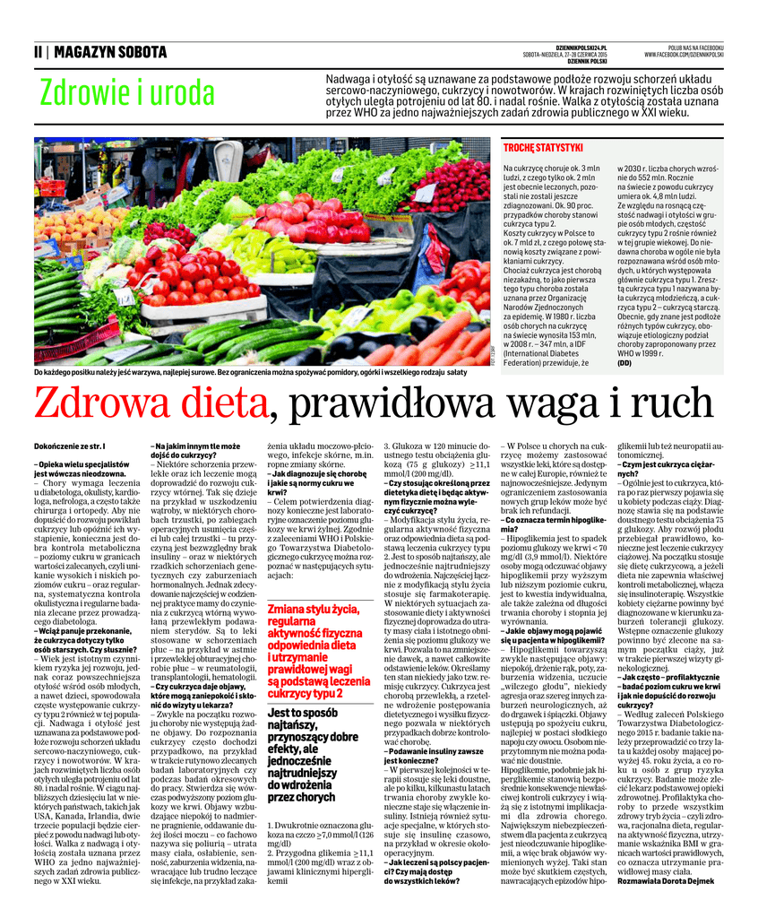 SOBOTA SOBOTA II | MAGAZYN A2 | MAGAZYN Zdrowie i uroda DZIENNIKPOLSKI24.PL SOBOTA–NIEDZIELA, 27–28 CZERWCA 2015 DZIENNIK POLSKI POLUB NAS NA FACEBOOKU WWW.FACEBOOK.COM/DZIENNIKPOLSKI Nadwaga i otyłość są uznawane za podstawowe podłoże rozwoju schorzeń układu sercowo-naczyniowego, cukrzycy i nowotworów. W krajach rozwiniętych liczba osób otyłych uległa potrojeniu od lat 80. i nadal rośnie. Walka z otyłością została uznana przez WHO za jedno najważniejszych zadań zdrowia publicznego w XXI wieku. FOT. 123RF TROCHĘ STATYSTYKI Na cukrzycę choruje ok. 3 mln ludzi, z czego tylko ok. 2 mln jest obecnie leczonych, pozostali nie zostali jeszcze zdiagnozowani. Ok. 90 proc. przypadków choroby stanowi cukrzyca typu 2. Koszty cukrzycy w Polsce to ok. 7 mld zł, z czego połowę stanowią koszty związane z powikłaniami cukrzycy. Chociaż cukrzyca jest chorobą niezakaźną, to jako pierwsza tego typu choroba została uznana przez Organizację Narodów Zjednoczonych za epidemię. W 1980 r. liczba osób chorych na cukrzycę na świecie wynosiła 153 mln, w 2008 r. – 347 mln, a IDF (International Diabetes Federation) przewiduje, że w 2030 r. liczba chorych wzrośnie do 552 mln. Rocznie na świecie z powodu cukrzycy umiera ok. 4,8 mln ludzi. Ze względu na rosnącą częstość nadwagi i otyłości w grupie osób młodych, częstość cukrzycy typu 2 rośnie również w tej grupie wiekowej. Do niedawna choroba w ogóle nie była rozpoznawana wśród osób młodych, u których występowała głównie cukrzyca typu 1. Zresztą cukrzyca typu 1 nazywana była cukrzycą młodzieńczą, a cukrzyca typu 2 – cukrzycą starczą. Obecnie, gdy znane jest podłoże różnych typów cukrzycy, obowiązuje etiologiczny podział choroby zaproponowany przez WHO w 1999 r. (DD) Do każdego posiłku należy jeść warzywa, najlepiej surowe. Bez ograniczenia można spożywać pomidory, ogórki i wszelkiego rodzaju sałaty Zdrowa dieta, prawidłowa waga i ruch Dokończenie ze str. I – Opieka wielu specjalistów jest wówczas nieodzowna. – Chory wymaga leczenia u diabetologa, okulisty, kardiologa, nefrologa, a często także chirurga i ortopedy. Aby nie dopuścić do rozwoju powikłań cukrzycy lub opóźnić ich wystąpienie, konieczna jest dobra kontrola metaboliczna – poziomy cukru w granicach wartości zalecanych, czyli unikanie wysokich i niskich poziomów cukru – oraz regularna, systematyczna kontrola okulistyczna i regularne badania zlecane przez prowadzącego diabetologa. – Wciąż panuje przekonanie, że cukrzyca dotyczy tylko osób starszych. Czy słusznie? – Wiek jest istotnym czynnikiem ryzyka jej rozwoju, jednak coraz powszechniejsza otyłość wśród osób młodych, a nawet dzieci, spowodowała częste występowanie cukrzycy typu 2 również w tej populacji. Nadwaga i otyłość jest uznawana za podstawowe podłoże rozwoju schorzeń układu sercowo-naczyniowego, cukrzycy i nowotworów. W krajach rozwiniętych liczba osób otyłych uległa potrojeniu od lat 80. i nadal rośnie. W ciągu najbliższych dziesięciu lat w niektórych państwach, takich jak USA, Kanada, Irlandia, dwie trzecie populacji będzie cierpieć z powodu nadwagi lub otyłości. Walka z nadwagą i otyłością została uznana przez WHO za jedno najważniejszych zadań zdrowia publicznego w XXI wieku. – Na jakim innym tle może dojść do cukrzycy? – Niektóre schorzenia przewlekłe oraz ich leczenie mogą doprowadzić do rozwoju cukrzycy wtórnej. Tak się dzieje na przykład w uszkodzeniu wątroby, w niektórych chorobach trzustki, po zabiegach operacyjnych usunięcia części lub całej trzustki – tu przyczyną jest bezwzględny brak insuliny – oraz w niektórych rzadkich schorzeniach genetycznych czy zaburzeniach hormonalnych. Jednak zdecydowanie najczęściej w codziennej praktyce mamy do czynienia z cukrzycą wtórną wywołaną przewlekłym podawaniem sterydów. Są to leki stosowane w schorzeniach płuc – na przykład w astmie i przewlekłej obturacyjnej chorobie płuc – w reumatologii, transplantologii, hematologii. – Czy cukrzyca daje objawy, które mogą zaniepokoić i skłonić do wizyty u lekarza? – Zwykle na początku rozwoju choroby nie występują żadne objawy. Do rozpoznania cukrzycy często dochodzi przypadkowo, na przykład w trakcie rutynowo zlecanych badań laboratoryjnych czy podczas badań okresowych do pracy. Stwierdza się wówczas podwyższony poziom glukozy we krwi. Objawy wzbudzające niepokój to nadmierne pragnienie, oddawanie dużej ilości moczu – co fachowo nazywa się poliurią – utrata masy ciała, osłabienie, senność, zaburzenia widzenia, nawracające lub trudno leczące się infekcje, na przykład zaka- żenia układu moczowo-płciowego, infekcje skórne, m.in. ropne zmiany skórne. – Jak diagnozuje się chorobę i jakie są normy cukru we krwi? – Celem potwierdzenia diagnozy konieczne jest laboratoryjne oznaczenie poziomu glukozy we krwi żylnej. Zgodnie z zaleceniami WHO i Polskiego Towarzystwa Diabetologicznego cukrzycę można rozpoznać w następujących sytuacjach: Zmiana stylu życia, regularna aktywność fizyczna odpowiednia dieta i utrzymanie prawidłowej wagi są podstawą leczenia cukrzycy typu 2 Jest to sposób najtańszy, przynoszący dobre efekty, ale jednocześnie najtrudniejszy do wdrożenia przez chorych 1. Dwukrotnie oznaczona glukoza na czczo > _ 7,0 mmol/l (126 mg/dl) 2. Przygodna glikemia > _ 11,1 mmol/l (200 mg/dl) wraz z objawami klinicznymi hiperglikemii 3. Glukoza w 120 minucie doustnego testu obciążenia glukozą (75 g glukozy) > _ 11,1 mmol/l (200 mg/dl). – Czy stosując określoną przez dietetyka dietę i będąc aktywnym fizycznie można wyleczyć cukrzycę? – Modyfikacja stylu życia, regularna aktywność fizyczna oraz odpowiednia dieta są podstawą leczenia cukrzycy typu 2. Jest to sposób najtańszy, ale jednocześnie najtrudniejszy do wdrożenia. Najczęściej łącznie z modyfikacją stylu życ
