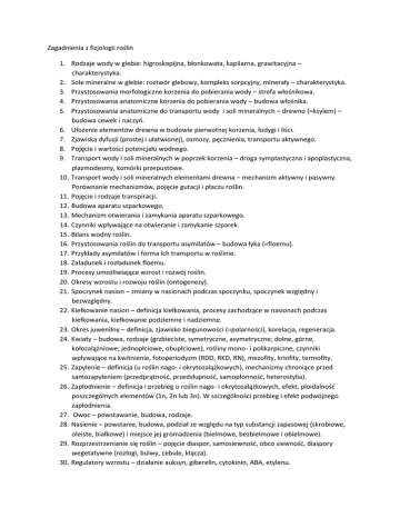 Zagadnienia z fizjologii roślin 1. Rodzaje wody w glebie: higroskopijna, błonkowata, kapilarna, grawitacyjna – charakterystyka. 2. Sole mineralne w glebie: roztwór glebowy, kompleks sorpcyjny, minerały – charakterystyka. 3. Przystosowania morfologiczne korzenia do pobierania wody – strefa włośnikowa. 4. Przystosowania anatomiczne korzenia do pobierania wody – budowa włośnika. 5. Przystosowania anatomiczne do transportu wody i soli mineralnych – drewno (=ksylem) – budowa cewek i naczyo. 6. Ułożenie elementów drewna w budowie pierwotnej korzenia, łodygi i liści. 7. Zjawiska dyfuzji (prostej i ułatwionej), osmozy, pęcznienia, transportu aktywnego. 8. Pojęcie i wartości potencjału wodnego. 9. Transport wody i soli mineralnych w poprzek korzenia – droga symplastyczna i apoplastyczna, plazmodesmy, komórki przepustowe. 10. Transport wody i soli mineralnych elementami drewna – mechanizm aktywny i pasywny. Porównanie mechanizmów, pojęcie gutacji i płaczu roślin. 11. Pojęcie i rodzaje transpiracji. 12. Budowa aparatu szparkowego. 13. Mechanizm otwierania i zamykania aparatu szparkowego. 14. Czynniki wpływające na otwieranie i zamykanie szparek. 15. Bilans wodny roślin. 16. Przystosowania roślin do transportu asymilatów – budowa łyka (=floemu). 17. Przykłady asymilatów i forma ich transportu w roślinie. 18. Załadunek i rozładunek floemu. 19. Procesy umożliwiające wzrost i rozwój roślin. 20. Okresy wzrostu i rozwoju roślin (ontogenezy). 21. Spoczynek nasion – zmiany w nasionach podczas spoczynku, spoczynek względny i bezwzględny. 22. Kiełkowanie nasion – definicja kiełkowania, procesy zachodzące w nasionach podczas kiełkowania, kiełkowanie podziemne i nadziemne. 23. Okres juwenilny – definicja, zjawisko biegunowości (=polarności), korelacja, regeneracja. 24. Kwiaty – budowa, rodzaje (grzbieciste, symetryczne, asymetryczne; dolne, górne, kołozalążniowe; jednopłciowe, obupłciowe), rośliny mono- i polikarpiczne, czynniki wpływające na kwitnienie, fotoperiodyzm (RDD, RKD, RN), mezofity, kriofity, termofity. 25. Zapylenie – definicja (u roślin nago- i okrytozalążkowych), mechanizmy chroniące przed samozapyleniem (przedprątnośd, przedsłupnośd, samopłonnośd, heterostylia). 26. Zapłodnienie – definicja i przebieg u roślin nago- i okrytozalążkowych, efekt, ploidalnośd poszczególnych elementów (1n, 2n lub 3n). W szczególności przebieg i efekt podwójnego zapłodnienia. 27. Owoc – powstawanie, budowa, rodzaje. 28. Nasienie – powstanie, budowa, podział ze względu na typ substancji zapasowej (skrobiowe, oleiste, białkowe) i miejsce jej gromadzenia (bielmowe, bezbielmowe i obielmowe). 29. Rozprzestrzenianie się roślin – pojęcie diaspor, samosiewnośd, obco siewnośd, diaspory wegetatywne (rozłogi, bulwy, cebule, kłącza). 30. Regulatory wzrostu – działanie auksyn, giberelin, cytokinin, ABA, etylenu. 31. Doświadczenie z koleoptylem kukurydzy – problem badawczy, hipoteza, obserwacje, wnioski. 32. Ruchy roślin – definicja taksji, tropizmów, nastii, mechanizm wzrostowy i turgorowy wzrostu, przykłady tropizmów i nastii.