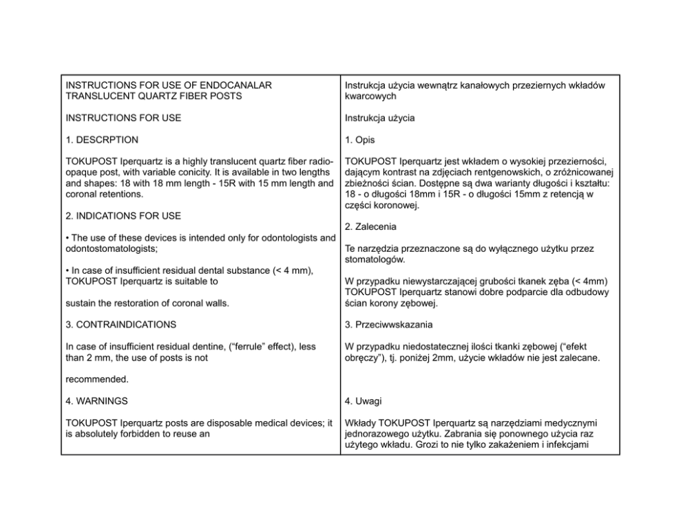 INSTRUCTIONS FOR USE OF ENDOCANALAR TRANSLUCENT QUARTZ FIBER POSTS Instrukcja użycia wewnątrz kanałowych przeziernych wkładów kwarcowych INSTRUCTIONS FOR USE Instrukcja użycia 1. DESCRPTION 1. Opis TOKUPOST Iperquartz is a highly translucent quartz fiber radioopaque post, with variable conicity. It is available in two lengths and shapes: 18 with 18 mm length - 15R with 15 mm length and coronal retentions. TOKUPOST Iperquartz jest wkładem o wysokiej przezierności, dającym kontrast na zdjęciach rentgenowskich, o zróżnicowanej zbieżności ścian. Dostępne są dwa warianty długości i kształtu: 18 - o długości 18mm i 15R - o długości 15mm z retencją w części koronowej. 2. INDICATIONS FOR USE 2. Zalecenia • The use of these devices is intended only for odontologists and odontostomatologists; Te narzędzia przeznaczone są do wyłącznego użytku przez stomatologów. • In case of insufficient residual dental substance (< 4 mm), TOKUPOST Iperquartz is suitable to W przypadku niewystarczającej grubości tkanek zęba (< 4mm) TOKUPOST Iperquartz stanowi dobre podparcie dla odbudowy sustain the restoration of coronal walls. ścian korony zębowej. 3. CONTRAINDICATIONS 3. Przeciwwskazania In case of insufficient residual dentine, (“ferrule” effect), less than 2 mm, the use of posts is not W przypadku niedostatecznej ilości tkanki zębowej (“efekt obręczy”), tj. poniżej 2mm, użycie wkładów nie jest zalecane. recommended. 4. WARNINGS 4. Uwagi TOKUPOST Iperquartz posts are disposable medical devices; it is absolutely forbidden to reuse an Wkłady TOKUPOST Iperquartz są narzędziami medycznymi jednorazowego użytku. Zabrania się ponownego użycia raz użytego wkładu. Grozi to nie tylko zakażeniem i infekcjami already used post. This would entail not only serious risks of bacterial contamination and infections transmission, but also of the collapse of the post already subject to previous physicalmechanical stress. bakteryjnymi, ale również grozi złamaniem wkładu, który był uprzednio poddany mechanicznym obciążeniom. 5. PRECAUTIONS 5. Środki ostrożności It is recommended to clean the post with alcohol before placing it into the canal, in order to Przed umieszczeniem wkładu w kanale, zaleca się oczyszczenie wkładu przy pomocy alkoholu, w celu “odtłuszczenia” na wypadek gdyby został zabrudzony. Wkład TOKUPOST Iperquartz jest silanizowanowany. W razie potrzeby, należy przycinać wkład poza jamą ustną (TOKUPOST 18). “degrease” it if it has been decontaminated. The TOKUPOST Iperquartz post is silanized. If necessary cut the post outside the oral cavity (TOKUPOST 18) 6. UNWANTED REACTIONS 6. Skutki uboczne Based on literature available to date, no unwanted reactions are known. W oparciu o aktualne piśmiennictwo, nie są znane skutki uboczne. 7. DISPOSAL OF THE DEVICE 7. Utylizacja The devices to be disposed must be treated as per the applicable regulations (law decree 152/2006 and following modifications and additions), and as per the waste treatment regulation of local entities. Lacking different specific instructions, dispose of the device as special hospital Narzędzia należy utylizować zgodnie z obowiązującymi przepisami (zarządzenie 152/2006 z późniejszymi zmianami) oraz zgodnie z lokalnymi przepisami dotyczącymi utylizacji odpadów. W przypadku braku bardziej szczegółowych wymagań, należy utylizować te urządzenia jak odpady medyczne. waste. 8. SAFETY AND LIABILITY 8. Bezpieczeństwo i odpowiedzialność Tokuyama Dental accepts no liability or claim for damages due Tokuyama Dental nie przyjmuje na siebie odpowiedzialności ani to: nie przyjmuje roszczeń wynikających z: • use of instruments not belonging to the system and which might compromise its operation; - użycia komponentów nie należacych do systemu, które mogą utrudniać jego funkcjonowanie; • non compliance with the instructions for use. - nie stosowania się do instrukcji użytkowania. ! The user is liable for using materials for uses different from the ones specified in ! Odpowiedzialność za użycie niezgodne z instrukcją ponosi użtkownik. the instructions for use. STEP BY STEP USE PROTOCOL: STEPS FROM ROOT CANAL PREPARATION TO CORE PROCEDURA UŻYCIA KROK-PO-KROKU: ETAPY OD PRZYGOTOWANIA KANAŁU DO ODBUDOWY ZRĘBU KORONOWEGO. BUILD-UP RECONSTRUCTION 1. Prepare the root canal as per the known technique; make sure that there is enough space to 1. Należy opracować kanał zgodnie ze stosowaną technologią, dbając przy tym o pozostawienie wystarczającej ilości miejsca na wkład. place the endodontic post; 2. Tokuyama Dental recommends to use a rubber dam before treating the tooth; 3. Carry out the initial removal of gutta-percha with the usual instruments, complete the canal 2. Tokuyama Dental zaleca użycie koferdamu przed opracowaniem zęba. 3. Należy przeprowadzić wstępne usunięcie gutaperki za pomocą zwykłych urządzeń. Należy dokończyć poszerzanie kanału wiertłem do kanałów. widening with a reamer; 4. Select the TOKUPOST post based on clinical evaluations and with the help of the X ray to select the type and the most appropriate size among the available shapes, depending on the 4. Dobór właściwego wkładu TOKUPOST należy wykonać na podstawie klinicznej oceny oraz w oparciu o zdjęcie rentgenowskie, aby dostosować kształt, typ i wielkość wkładu do anatomii zęba. tooth anatomy; 5. Determine the length of the coronal build-up, which must be about 1/3 of the final length of the post. Remove the root canal filling leaving the gutta-percha seal untouched on the apical third (3-5 mm) obtaining in this way a space to house 2/3 of the post length; in case of curved 5. Należy określić długość odbudowy zrębu koronowego, która powinna stanowić 1/3 długości wkładu. Należy usunąć wypełnienie kanału, pozostawiając gutaperkę nienaruszoną na jednej trzeciej dowierzchołkowej korzenia (3-5mm), tak by powstała p