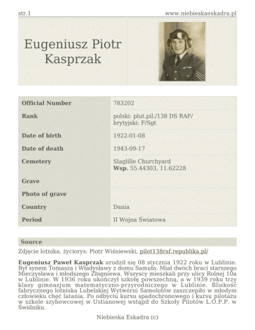 str.1 www.niebieskaeskadra.pl Eugeniusz Piotr Kasprzak Official Number 783202 Rank polski: plut.pil./138 DS RAF/ brytyjski: F/Sgt Date of birth 1922-01-08 Date of death 1943-09-17 Cemetery Slaglille Churchyard Wsp. 55.44303, 11.62228 Grave Photo of grave Country Dania Period II Wojna Światowa Source Zdjęcie lotnika, życiorys: Piotr Wiśniewski, pilot138raf.republika.pl/ Eugeniusz Paweł Kasprzak urodził się 08 stycznia 1922 roku w Lublinie. Był synem Tomasza i Władysławy z domu Samuła. Miał dwóch braci starszego Mieczysława i młodszego Zbigniewa. Wszyscy mieszkali przy ulicy Rolnej 10a w Lublinie. W 1936 roku ukończył szkołę powszechną, a w 1939 roku trzy klasy gimnazjum matematyczno-przyrodniczego w Lublinie. Bliskość fabrycznego lotniska Lubelskiej Wytwórni Samolotów zaszczepiło w młodym człowieku chęć latania. Po odbyciu kursu spadochronowego i kursu pilotażu w szkole szybowcowej w Ustianowej wstąpił do Szkoły Pilotów L.O.P.P. w Świdniku. Niebieska Eskadra (c) str.2 www.niebieskaeskadra.pl O dalszych losach Eugeniusza Kasprzaka możemy dowiedzieć się z pamiętnika jaki po sobie pozostawił. W ostatnich dniach sierpnia 1939 roku wyjeżdża na szkolenie do Łucka. Fragment pamiętnika: "...Dnia 2 września 1939r. zajechaliśmy na dworzec do Łucka. Pomimo zmęczenia musieliśmy wyładować nasze sprzęty. W czasie pracy już niepokoiły nas swoim brzęczeniem niemieckie bombowce. Ta praca trwała całą noc...". Tu otrzymuje wiadomości o bombardowaniu Lublina 02.IX.1939r. Głównym celem ataku była Lubelska Wytwórnia Samolotów (dawna Plage-Laśkiewicza). Samoloty niemieckie wywołały panikę. Liczbę poległych szacuje się na 38, a kilkadziesiąt zostało rannych. Sam doświadcza tegoż samego dnia 10.IX.1939r. Ewakułują się na lotnisko zapasowe, oddalowe od Łucka o 18 km. W poniedziałek 18.IX.1939r. o godz. 8.45 przekroczył granicę polsko rumuńską w miejscowości Kuty, udając się w głąb tego państwa. Po pięciu dniach podróży zatrzymał się w mieście Babadag. Kolejne przystanki to Niculiţel i wieś Frecăţei. Po dwóch tygodniach przenieśli się do miasta Tulcea. Rozkaz wyjścia i podróż pociągiem do stacji Ceamurlia de Jos, a stamtąd piechotą do Sarighiol de Deal. Dowódcą zostaje mianowany kpt. Maissner, a zastępcą kpt. Śledziejowski. Jest ich 150 z podchorążówką z Warszawy. Małymi gupkami po kilku opuszczają obóz kierując się do Francji. Niestety, chorobę jaką złapał uniemożliwiła mu w tym czasie wyjazd, trafił na trzy tygodnie do szpitala w Babadag. Po rekonwalescencji, zdobyciu cewilnego ubrania, paszportu próbował wyjechać, ale został złapany przez żandarmów wraz z innymi kolegami. Przetranspotrowali ich do obozu Sarighiol, następnie do Babadag, a później pociągiem do miasta Făgăraş. Trafili do ciężkiego więziania dla zbrodniarzy (Cytadeli Michała Walecznego), była noc z 5 na 6 grudnia 1939 roku. Fragment pamiętnika: "...Jest nas wszystkich około 400. Śniadanie z wody zabarwionej i z zapachem herbaty. O godz. 9 apel i gimnastyka. Do godz. 11 wolne, od 11 apel. O godz. 12 obiad. Formalnie czysta woda pachnąca mięsem. 1 kg czarnego chleba zmieszanego z kartoflami...". Dnia 03.III.1940r. opuścił mury więzienia i został przetransportowany do obozu w Timişul de Jos. Fragment pamiętnika: "...Timisul, Wtorek, 5-III 40. Rano poszliśmy na śniadanie, które składa się z białej kawy i chleba z marmoladą. Jedzenia ile kto chce. Obiad też z dwóch dań. Kolacja również. Czuję się tu naprawdę jak w raju. Mieszkam w pensjonacie. Dookoła nas otaczają piękne góry. Za kilka tygodni pewnie wyjadę do Francji. Bo z tego obozu wyjeżdżają legalnie...". Kolejny fragment z pamiętnika "...Dnia 9-IV-40r. podpisałem listę do wyjazdu do Francji. Teraz czas i godziny mijają szybko. Zakupiłem potrzebne mi przedmioty i przygotowałem się do wyjazdu...", "...O godzinie 7 wieczór wsiadłem do pociągu, który jechał do Bukaresztu. Tam po kilku minutach postoju i przesiadce do innego wagonu ruszyliśmy w stronę Constanţy. Szczęśliwi i pełni wrażeń zajechaliśmy na godz. 8 rano do portu nad Morzem Czarnym...". Zostali zaokrętowani na statek HMS Transylvania. Dnia 11.IV.1940r. o godz. 10 wieczór opuścił port, udając się w drogę do Francji. Po całonocnej podróży, na rano 12.IV.1940r. zawinęli do Stambułu. Kolejnym przystankiem były Ateny w Grecji. Dnia 14.IV.1940r. po południu opuścili port kierując się w stronę Egiptu do Aleksandrii. Po dłuższym postoju 16.IV.1940r. ruszyli w dalszą drogę do Hajfy w Palestynie. Dnia 18.IV.1940r. wysiedli w Bejrucie w Syrii. Samochodami przewiezionio wszystkich do obozu oddalonego od Bejrutu o 7 km. Fragment pamiętnika: "...Tu też śpię w baraku na pryczy i na macie. Tak samo jak w Făgăraş. Tutaj ma być pobór i przydziały do poszczególnych broni. Podobno z nas wszystkich mają zrobić Niebieska Eskadra (c) str.3 www.niebieskaeskadra.pl piechotę. Od tego uchowaj mnie Boże. Będę się starał abym znalazł się w tej broni co już ją zacząłem...", "...Dzisiaj 26-IV-40r. w piątek przyjechał kapitan z naszej armii i wypytywał się nas kolejno czym jesteśmy, jaka specjalność itp. Mnie powiedział, że wszyscy lotnicy i piloci wyjadą do Francji. Dałby to Bóg...". Dnia 05.V.1940 zostali ponownie zaokrętowani i popłynęli do Hajfy, a rano znowu do Aleksandrii. Fragment pamiętnika "...Dnia 8-V-40r. Już 24 godz. stoimy w porcie Alexandria. Stoimy blisko okrętów wojennych. Coś jest pewnie nie w porządku, kiedy taka potężna flota tutaj się znajduje. Jest kilkanaście pancerników i kontrtorpedowców małych i dużych. Jest dużo łodzi podwodnych. Oraz najprzeróżniejszych jednostek bojowych...", "...O godz. 8 rano wypływamy z portu, płynąc podobno już bezpośrednio do Marsylii. Nie wiem może zawiniemy do Algieru. Teraz dopiero zacznie się porządna huśtawka, kiedy będziemy płyn
