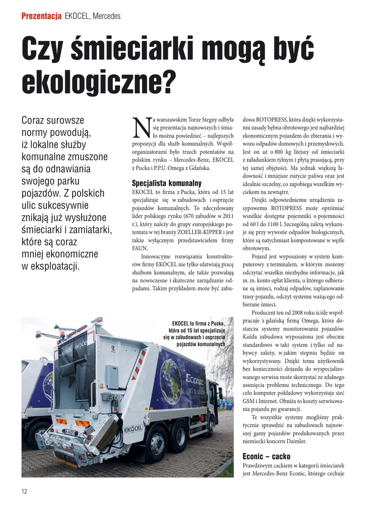 Prezentacja EKOCEL, Mercedes Czy śmieciarki mogą być ekologiczne? Coraz surowsze normy powodują, iż lokalne służby komunalne zmuszone są do odnawiania swojego parku pojazdów. Z polskich ulic sukcesywnie znikają już wysłużone śmieciarki i zamiatarki, które są coraz mniej ekonomiczne w eksploatacji. N a warszawskim Torze Stegny odbyła się prezentacja najnowszych i śmiało można powiedzieć – najlepszych propozycji dla służb komunalnych. Współorganizatorami było trzech potentatów na polskim rynku – Mercedes-Benz, EKOCEL z Pucka i P.P.U. Omega z Gdańska. Specjalista komunalny EKOCEL to firma z Pucka, która od 15 lat specjalizuje się w zabudowach i osprzęcie pojazdów komunalnych. To zdecydowany lider polskiego rynku (670 zabudów w 2011 r.), który należy do grupy europejskiego potentata w tej branży ZOELLER-KIPPER i jest także wyłącznym przedstawicielem firmy FAUN. Innowacyjne rozwiązania konstruktorów firmy EKOCEL nie tylko ułatwiają pracę służbom komunalnym, ale także pozwalają na nowoczesne i skuteczne zarządzanie odpadami. Takim przykładem może być zabu- EKOCEL to firma z Pucka, która od 15 lat specjalizuje się w zabudowach i osprzęcie pojazdów komunalnych dowa ROTOPRESS, która dzięki wykorzystaniu zasady bębna obrotowego jest najbardziej ekonomicznym pojazdem do zbierania i wywozu odpadów domowych i przemysłowych. Jest on aż o 800 kg lżejszy od śmieciarki z załadunkiem tylnym i płytą prasującą, przy tej samej objętości. Ma jednak większą ładowność i mniejsze zużycie paliwa oraz jest idealnie szczelny, co zapobiega wszelkim wyciekom na zewnątrz. Dzięki odpowiedniemu urządzeniu zasypowemu ROTOPRESS może opróżniać wszelkie dostępne pojemniki o pojemności od 60 l do 1100 l. Szczególną zaletą wykazuje się przy wywozie odpadów biologicznych, które są natychmiast kompostowane w węźle obrotowym. Pojazd jest wyposażony w system komputerowy z terminalem, w którym możemy odczytać wszelkie niezbędne informacje, jak m. in. konto opłat klienta, u którego odbierane są śmieci, rodzaj odpadów, zaplanowanie trasy pojazdu, odczyt systemu ważącego odbierane śmieci. Producent ten od 2008 roku ściśle współpracuje z gdańską firmą Omega, która dostarcza systemy monitorowania pojazdów. Każda zabudowa wyposażona jest obecnie standardowo w taki system i tylko od nabywcy zależy, w jakim stopniu będzie on wykorzystywany. Dzięki temu użytkownik bez konieczności dojazdu do wyspecjalizowanego serwisu może skorzystać ze zdalnego usunięcia problemu technicznego. Do tego celu komputer pokładowy wykorzystuje sieć GSM i Internet. Obniża to koszty serwisowania pojazdu po gwarancji. Te wszystkie systemy mogliśmy praktycznie sprawdzić na zabudowach najnowszej gamy pojazdów produkowanych przez niemiecki koncern Daimler. Econic – cacko Prawdziwym cackiem w kategorii śmieciarek jest Mercedes-Benz Econic, którego cechuje 12 Z polskich ulic sukcesywnie znikają już wysłużone śmieciarki i zamiatarki Mercedes-Benz jest w stanie sprostać potrzebom każdego wymagającego klienta z dwusprzegłową skrzynią biegów, która w trybie ECO daje widoczne dla użytkownika oszczędności. Wszystko wskazuje na to, iż polskie służby komunalne w najbliższych latach czeka sukcesywna wymiana sprzętu na nowocześniejszy, bardziej ekonomiczny i bezpieczniejszy. Warto chyba zainwestować, by spełnić coraz bardziej restrykcyjne wymagania gospodarką odpadami. LS nowoczesna kabina z łatwym dostępem do wnętrza (niski stopień) i automatycznymi drzwiami, z modułową koncepcją foteli. Pojazd ma pneumatyczne zawieszenie umożliwiające podniesienie ramy o 200 mm i maksymalne opuszczenie do 60 mm w stosunku do poziomu normalnego. Sterowana elektrohydraulicznie oś pchana lub wleczona ułatwia aktywne kierowanie kołami, zapewniając minimalny promień skrętu. Do napędu zastosowano ekonomiczny i czysty 6-cylindrowy silnik wysokoprężny z technologią SCR BlueTec 5 o mocy od 238 KM do 326 KM, współpracujący z automatyczną skrzynią biegów. Model ten dostępny jest też w wersji z silnikiem CNG lub LNG. Mercedes-Benz jest w stanie sprostać potrzebom każdego wymagającego klienta i stworzyć pojazd specjalistyczny pod jego konkretne potrzeby. Powstają one na bazie modeli Atego (8-16 t), Axor (18-26 t), Actros (18-41 t) i Econic (18-26 t). Najmniejszy w ofercie jest Fuso Canter Mała ciężarówka z japońskim rodowodem, która dostępna jest w europejskiej sieci Mercedesa. Na takim podwoziu powstała zabudowa Micro o pojemności 8 m3. Jest to pojazd bardzo zwrotny, który doskonale nadaje się do odbioru śmieci w małych osiedlach. Może być napędzany silnikiem o mocy od 130 KM do 180 KM, współpracującym 13