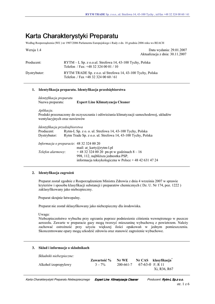 RYTM TRADE Sp. z o.o., ul. Strefowa 14, 43-100 Tychy , tel/fax +48 32 324 00 60 / 61 Karta Charakterystyki Preparatu Według Rozporządzenia (WE ) nr 1907/2006 Parlamentu Europejskiego i Rady z dn. 18 grudnia 2006 roku ws REACH Wersja 1.4 Data wydania: 29.01.2007 Aktualizacja z dnia: 30.11.2007 Producent: RYTM – L Sp. z o.o.ul. Strefowa 14, 43-100 Tychy, Polska Telefon / Fax: +48 32 324 00 01 / 10 Dystrybutor: RYTM TRADE Sp. z o.o. ul Strefowa 14, 43-100 Tychy, Polska Telefon ./ Fax +48 32 324 00 60 / 61 1. Identyfikacja preparatu. Identyfikacja przedsiębiorstwa Identyfikacja preparatu Nazwa preparatu: Expert Line Klimatyzacja Cleaner Aplikacja. Produkt przeznaczony do oczyszczania i odświeżania klimatyzacji samochodowej, układów wentylacyjnych oraz nawiewów Identyfikacja przedsiębiorstwa Producent: Rytm-L Sp. z o. o. ul. Strefowa 14, 43-100 Tychy, Polska Dystrybutor: Rytm Trade Sp. z o.o. ul. Strefowa 14, 43-100 Tychy, Polska Informacja o preparacie: 48 32 324 00 20 mail: [email protected] Telefon alarmowy: + 48 32 324 00 20 pn-pt w godzinach 8 – 16 998, 112, najbliższa jednostka PSP, informacja toksykologiczna w Polsce + 48 42 631 47 24 2. Identyfikacja zagrożeń Preparat został zgodnie z Rozporządzeniem Ministra Zdrowia z dnia 4 września 2007 w sprawie kryteriów i sposobu klasyfikacji substancji i preparatów chemicznych ( Dz. U. Nr 174, poz. 1222 ) zaklasyfikowany jako niebezpieczny. Preparat skrajnie łatwopalny. Preparat nie został sklasyfikowany jako niebezpieczny dla środowiska. Uwaga: Niebezpieczeństwo wybuchu przy ogrzaniu poprzez podniesienie ciśnienia wewnętrznego w puszcze aerozolu. Zawarte w preparacie gazy mogą tworzyć mieszaninę wybuchową z powietrzem. Należy zachować ostrożność przy użyciu większej ilości opakowań w jednym pomieszczeniu. Skoncentrowane opary mogą szkodzić zdrowiu oraz stanowić zagrożenie wybuchowe. 3. Skład i informacje o składnikach Składniki niebezpieczne: Alkohol izopropylowy Karta Charakterystyki Preparatu Niebezpiecznego Zawartość % 3 – 7% Nr WE 200-661-7 klasyfikacja* 67-63-0 F; R 11 Xi, R36, R67 Nr CAS Expert Line Klimatyzacja Cleaner Producent: RytmRytm-L Sp.z o.o. str. 1 z 6 RYTM TRADE Sp. z o.o., ul. Strefowa 14, 43-100 Tychy , tel/fax +48 32 324 00 60 / 61 Eter polioksyetylenowy syntetycznych < 2% alkoholi tłuszczowych Propan/butan/izobutan 1) mieszanina skroplona pod ciśnieniem 10- 50% polimer 68439-46-3 Xi, R36/38 200-827-9 203-448-7 200-857-2 74-98-6 106-97-8 75-28-5 F+, R12 F+, R12 F+, R12 * objaśnienia symboli w pkt.16. Inne informacje 1) Mieszanina z izobutanem zawiera < 0,1% wag buta-1,3-dienu i zgodnie z zasadami klasyfikacji nie jest rakotwórcza i mutagenna 4. Pierwsza pomoc Wdychanie: Kontakt ze skórą: Kontakt z oczami: Spożycie: 5. Wyprowadzić na świeże powietrze, w przypadku trudności z oddychaniem skontaktować się z lekarzem Zdjąć zanieczyszczoną odzież. Zmyć dużą ilością wody. Sprawdzić czy poszkodowany nie nosi szkieł kontaktowych. Przemywać wielokrotnie przez kilka minut dużą ilością czystej wody trzymając szeroko otwarte powieki. Skontaktować się z lekarzem. Nie powodować wymiotów, możliwość zachłyśnięcia się pianą. Przy trwałych dolegliwościach skonsultować się z lekarzem. Postępowanie w przypadku pożaru W przypadku pożaru otoczenia istnieje niebezpieczeństwo wzrostu ciśnienia i rozsadzenia pojemników preparatu. Pojemniki narażone na działanie ognia chłodzić rozpyloną wodą z bezpiecznej odległości. Środki gaśnicze: woda, piana, proszek, CO2 Specjalne zagrożenia: Preparat łatwopalny. Pary są cięższe od powietrza, mogą się utrzymywać przy powierzchni ziemi i przemieszczać przewodami wentylacyjnymi. Oddalone źródła zapłonu mogą stanowić zagrożenie pożarowe. Tworzy mieszaniny wybuchowe z powietrzem. Środki ochrony indywidualnej dla strażaków: Stosować ubranie ognioodporne i indywidualny aparat oddechowy. Inne informacje: Nie dopuścić do przeniknięcia skażonej wody gaśniczej do gruntu, wód gruntowych lub powierzchniowych. 6. Postępowanie w przypadku niezamierzonego uwolnienia do środowiska Ochrona osobista: Nie wdychać par. Stosować odzież ochronną. Usunąć potencjalne źródła zapłonu. Nie palić i unikać iskier. Zapewnić dostęp powietrza do zamkniętych pomieszczeń. Pary rozcieńczyć rozproszonym Ochrona środowiska: Nie wprowadzać do kanalizacji. Zapobiec przedostaniu się do ścieków, wód, gleby. Rozlany preparat zebrać materiałem pochłaniającym ciecze. Zanieczyszczony teren oczyścić (zmyć wodą). Niszczyć puste puszki jak puszki pod ciśnieniem. Metody oczyszczania: Wylany materiał usunąć mechanicznie, resztę zebrać za pomocą substancji absorbującej ciecz (np. mączka drzewna, ziemia okrzemkowa, piasek). Przekazać do likwidacji. Dalsze informacje na temat usuwania odpadów patrz rozdział. 13. 7. Postępowanie z preparatem i jego magazynowanie Karta Charakterystyki Preparatu Niebezpiecznego Expert Line Klimatyzacja Cleaner Producent: RytmRytm-L Sp.z o.o. str. 2 z 6 RYTM TRADE Sp. z o.o., ul. Strefowa 14, 43-100 Tychy , tel/fax +48 32 324 00 60 / 61 Postępowanie z preparatem: : Postępować tak jak w przypadku cieczy łatwopalnych; zapewnić dobrą wentylację pomieszczeń. Nie rozpylać nad otwartym płomieniem lub żarzącym materiałem. Chronić przed źródłami zapłonu – nie palić w czasie rozpylania. Zapobiegać wyładowaniom elektrostatycznym. Magazynowanie: Magazynowanie w dobrze wentylowanym miejscu w oryginalnych zbiornikach. Zalecana temperatura magazynowanie od +5 do +35oC . Przechowywać tak jak preparaty skrajnie łatwopalne, z dala od źródeł ognia i ciepła. Przechowywać w pozycji pionowej w zamkniętych oryginalnych pojemnikach. Pojemnik pod ciśnieniem: chronić przed słońcem i temperaturą pow. +50oC. Chronić przed dziećmi 8. Kontrola narażenia i środki ochrony indywidualnej Właściwy parametr kontroli Preparat zawiera składnik