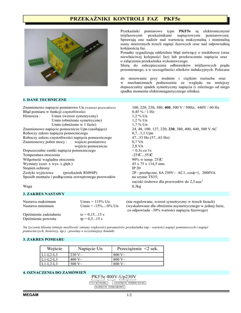 PRZEKAŹNIKI KONTROLI FAZ PKF5e Przekaźniki pomiarowe typu PKF5e są elektronicznymi trójfazowymi przekaźnikami napięciowymi pomiarowymi. Sprawują one nadzór nad wartością maksymalną i minimalną sumy mierzonych trzech napięć fazowych oraz nad odpowiednią kolejnością faz. Ponadto sygnalizują oddzielnie błąd mówiący o niedoborze (oraz niewłaściwej kolejności faz) lub przekroczeniu napięcia oraz o załączeniu przekaźnika wykonawczego. Służą do zabezpieczenia odbiorników trójfazowych prądu przemiennego, a w szczególności silników indukcyjnych. Polecane do stosowania przy średnim i ciężkim rozruchu oraz w mechanizmach podnoszenia ze względu na mniejszy dopuszczalny spadek symetryczny napięcia (i zależnego od niego spadku momentu elektromagnetycznego silnika). 1. DANE TECHNICZNE Znamionowe napięcie pomiarowe Un (wartości przewodowe) Błąd pomiaru w funkcji częstotliwości Histereza : Umax (wzrost symetryczny) Umin (obniżenie symetryczne) Umin (obniżenie w 1 fazie) Znamionowe napięcie pomocnicze Upn (zasilające) Roboczy zakres napięcia pomocniczego Roboczy zakres częstotliwości napięcia pomocniczego Znamionowy pobór mocy : wejście pomiarowe wejście pomocnicze Dopuszczalne zaniki napięcia pomocniczego Temperatura otoczenia Wilgotność względna otoczenia Wymiary (szer. x wys. x głęb.) Stopień ochrony Zestyki wyjściowe (przekaźnik RM94P) Sposób montażu i podłączenia zewnętrznego przewodów 100, 220, 230, 380, 400, 500 V / 50Hz; 440V / 60 Hz 0,45 % / 1 Hz 1,2 % Un 1,2 % Un 1,7 % Un 24, 48, 100, 127, 220, 230, 380, 400, 440, 500 V AC 0,7...1,1 Upn 47...53 Hz (57...63 Hz) 0,7 VA 2,8 VA < 0,3s co 1s -25°C...55°C 90% w temp. 25°C 45 x 75 x 114,5 mm IP 20 2P - przełączne, 8A 250V~ AC1, cosφ=1, 2000VA na szynie TS35; zaciski śrubowe dla przewodów do 2,5 mm 2 0,3kg Waga 2. ZAKRES NASTAWY Nastawa maksimum Nastawa minimum Umax = 115% Un Umin = -15%...-0% Un Opóźnienie zadziałania Opóźnienie powrotu tz = 0,15...15 s tp = 0,5...15 s (nie regulowane, wzrost symetryczny w trzech fazach) (wyskalowane dla obniżenia asymetrycznego w jednej fazie, co odpowiada –30% wartości napięcia fazowego) Na życzenie klienta istnieje możliwość zmiany większości parametrów przekaźnika (np.: wartości napięć pomiarowych i napięć pomocniczych, histerezy, itp.) - prosimy o wcześniejszy kontakt. 3. ZAKRES POMIARU Wejście L1-L2-L3 L1-L2-L3 L1-L2-L3 Napięcie Un 230 V~ 400 V~ 500 V~ Przeciążenie <2 sek. 800 V~ 800 V~ 800 V~ 4. OZNACZENIA DO ZAMÓWIEŃ MEGAM 1/2 5. DIAGRAM FUNKCJI 6. OPIS FUNKCJI Przekaźnik służy do nadzorowania sieci trójfazowej bez przewodu zerowego i wyskalowany jest dla napięć przewodowych. Przy prawidłowych parametrach napięcia mierzonego przekaźnik jest w stanie zadziałania (czynnym) - świeci zielony wskaźnik LED. Gdy suma trzech napięć fazowych przekracza próg Umax (nie regulowany) lub jest poniżej nastawionego progu Umin (wyskalowanego dla obniżenia asymetrycznego napięcia w jednej fazie), wtedy zaświeca się odpowiedni czerwony wskaźnik LED. Gdy stan ten utrzymuje się przez okres dłuższy od nastawionego czasu zadziałania tz, przekaźnik wykonawczy powraca do położenia spoczynkowego i gaśnie zielony wskaźnik LED. Dopiero, gdy suma mierzonych napięć fazowych jest ponownie pomiędzy nastawionymi progami (w paśmie zawężonym o wartość histerezy), gasną czerwone wskaźniki LED, a po okresie dłuższym od nastawionego czasu powrotu tp przekaźnik wykonawczy przechodzi do położenia pracy. Niewłaściwa kolejność faz sygnalizowana jest świeceniem czerwonego wskaźnika Umin (czasy tz i tp pozostają te same). Zasada pomiaru przekaźnika PKF5e umożliwia wykrycie : • asymetrii napięcia ,tj. gdy napięcie w jednej z faz spadnie poniżej nastawionej wartości Umin • asymetrii napięcia ,tj. gdy napięcie w dwóch fazach spadnie poniżej nastawionej wartości (Un+Umin)/2 • symetrycznego spadku napięcia w trzech fazach ,tj. gdy napięcie w trzech fazach spadnie poniżej nastawionej wartości (2Un+Umin)/3 7. SCHEMATY APLIKACYJNE Dla napięcia pomocniczego Up=230V Un=3~400 V Dla napięcia pomocniczego Up=400V Un=3~400 V 230V~ 230V~ N L2 Un L3 I> 10 Up 11 3 2 1 I> I> I> I> L1 PKF 5e 6 5 4 I> PKF 5e 10 Up 11 N L1 L2 Un L3 6 5 4 3 2 1 stop M250 (0,1...0,16 A) stosować w razie konieczności dobezpieczenia przewodów pomiarowych stop M250 (0,1...0,16 A) stosować w razie konieczności dobezpieczenia przewodów pomiarowych brak start fazy M brak start fazy M N N 8. RYSUNEK MONTAŻOWY maj 2007 PRZEDSIĘBIORSTWO USŁUGOWO-PRODUKCYJNE M MEGAM Spółka z o.o. internet: www.megam.com.pl e-mail: [email protected] MEGAM 2/2 R 80-557 Gdańsk ul. Narwicka 1 tel. (058) 342-24-69 fax. (058) 343-18-66 tel.kom. 0601 61-03-59