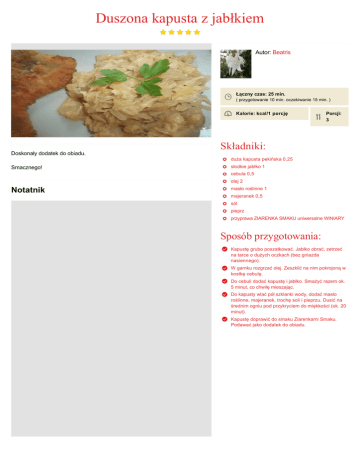 Duszona kapusta z jabłkiem Autor: Beatris Łączny czas: 25 min. ( przygotowanie 10 min. oczekiwanie 15 min. ) Kalorie: kcal/1 porcję Doskonały dodatek do obiadu. Porcji: 3 Składniki: duża kapusta pekińska 0,25 Smacznego! słodkie jabłko 1 cebula 0,5 olej 2 Notatnik masło roślinne 1 majeranek 0,5 sól pieprz przyprawa ZIARENKA SMAKU uniwersalne WINIARY Sposób przygotowania: Kapustę grubo poszatkować. Jabłko obrać, zetrzeć na tarce o dużych oczkach (bez gniazda nasiennego). W garnku rozgrzać olej. Zeszklić na nim pokrojoną w kostkę cebulę. Do cebuli dodać kapustę i jabłko. Smażyć razem ok. 5 minut, co chwilę mieszając. Do kapusty wlać pół szklanki wody, dodać masło roślinne, majeranek, trochę soli i pieprzu. Dusić na średnim ogniu pod przykryciem do miękkości (ok. 20 minut). Kapustę doprawić do smaku Ziarenkami Smaku. Podawać jako dodatek do obiadu.