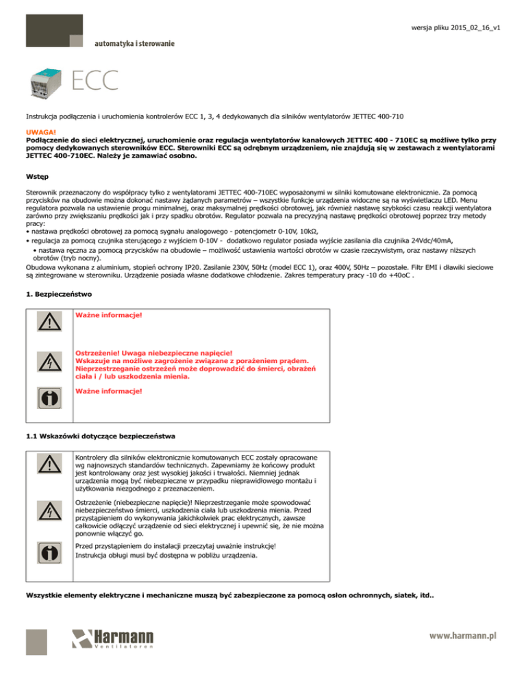 wersja pliku 2015_02_16_v1 Instrukcja podłączenia i uruchomienia kontrolerów ECC 1, 3, 4 dedykowanych dla silników wentylatorów JETTEC 400-710 UWAGA! Podłączenie do sieci elektrycznej, uruchomienie oraz regulacja wentylatorów kanałowych JETTEC 400 - 710EC są możliwe tylko przy pomocy dedykowanych sterowników ECC. Sterowniki ECC są odrębnym urządzeniem, nie znajdują się w zestawach z wentylatorami JETTEC 400-710EC. Należy je zamawiać osobno. Wstęp Sterownik przeznaczony do współpracy tylko z wentylatorami JETTEC 400-710EC wyposażonymi w silniki komutowane elektronicznie. Za pomocą przycisków na obudowie można dokonać nastawy żądanych parametrów – wszystkie funkcje urządzenia widoczne są na wyświetlaczu LED. Menu regulatora pozwala na ustawienie progu minimalnej, oraz maksymalnej prędkości obrotowej, jak również nastawę szybkości czasu reakcji wentylatora zarówno przy zwiększaniu prędkości jak i przy spadku obrotów. Regulator pozwala na precyzyjną nastawę prędkości obrotowej poprzez trzy metody pracy: • nastawa prędkości obrotowej za pomocą sygnału analogowego - potencjometr 0-10V, 10kΩ, • regulacja za pomocą czujnika sterującego z wyjściem 0-10V - dodatkowo regulator posiada wyjście zasilania dla czujnika 24Vdc/40mA, • nastawa ręczna za pomocą przycisków na obudowie – możliwość ustawienia wartości obrotów w czasie rzeczywistym, oraz nastawy niższych obrotów (tryb nocny). Obudowa wykonana z aluminium, stopień ochrony IP20. Zasilanie 230V, 50Hz (model ECC 1), oraz 400V, 50Hz – pozostałe. Filtr EMI i dławiki sieciowe są zintegrowane w sterowniku. Urządzenie posiada własne dodatkowe chłodzenie. Zakres temperatury pracy -10 do +40oC . 1. Bezpieczeństwo Ważne informacje! Ostrzeżenie! Uwaga niebezpieczne napięcie! Wskazuje na możliwe zagrożenie związane z porażeniem prądem. Nieprzestrzeganie ostrzeżeń może doprowadzić do śmierci, obrażeń ciała i / lub uszkodzenia mienia. Ważne informacje! 1.1 Wskazówki dotyczące bezpieczeństwa Kontrolery dla silników elektronicznie komutowanych ECC zostały opracowane wg najnowszych standardów technicznych. Zapewniamy że końcowy produkt jest kontrolowany oraz jest wysokiej jakości i trwałości. Niemniej jednak urządzenia mogą być niebezpieczne w przypadku nieprawidłowego montażu i użytkowania niezgodnego z przeznaczeniem. Ostrzeżenie (niebezpieczne napięcie)! Nieprzestrzeganie może spowodować niebezpieczeństwo śmierci, uszkodzenia ciała lub uszkodzenia mienia. Przed przystąpieniem do wykonywania jakichkolwiek prac elektrycznych, zawsze całkowicie odłączyć urządzenie od sieci elektrycznej i upewnić się, że nie można ponownie włączyć go. Przed przystąpieniem do instalacji przeczytaj uważnie instrukcję! Instrukcja obługi musi być dostępna w pobliżu urządzenia. Wszystkie elementy elektryczne i mechaniczne muszą być zabezpieczone za pomocą osłon ochronnych, siatek, itd.. wersja pliku 2015_02_16_v1 Podłączenia elektrycznego może dokonać tylko wykwalifikowany personel (osoba ze stosownymi uprawnieniami elektrycznymi). Instrukcja obługi musi być dostępna w pobliżu urządzenia. Urządzenie musi zostać zainstalowane zgodnie z lokalnymi normami i przepisami. 2 . Dane techniczne Rys.1 Wyjście ECC 1 ECC 3 ECC 4 Prąd In [A] 3x4,5 3x4,5 3x6,7 Napięcie [V] 3~230 3~400 3~400 1,2 2,2 3,2 Moc [Kw] Moc maks.[kW] Wejście 1,3 2,4 3,6 1~230V +5% -10% 3~400V +5% -10% 3~400V +5% -10% 50/60 50/60 50/60 1,4 2,5 3,5 Prąd znam. [A] 7,7 3x4,1 3x5,8 Maks. Moc wej. [kW] 1,5 3 4,2 Maks prąd wej. [A] 9 3x4,9 3x6,9 Przekrój przewodów [mm] 1,5 1,5 1,5 -10 do +40 st.C -10 do +40 st.C Napięcie zasilania fz [Hz] Znamionowa moc wej. [kW] Wejście Temperatura otoczenia -10 do +40 st.C Stopień ochrony IP20 Chłodzenie Wymuszone / Konwekcja Pozycja montażu 3. pionowo pionowo pionowo Instalacja Instalację należy przeprowadzić w pomieszczeniach suchych i przewiewnych, na gładkiej powierzchni, w pozycji pionowej, listwą zaciskową w dół (rys.3). Zapewnić swobodną przestrzeń wokół urządzenia w celu wymiany ciepła – po prawej/lewej stronie zachować odległość 50mm, od góry/od spodu zachować odległość 100mm (rys. 2). Nie zakrywać urządzenia! Urządzenie ECC nie może być narażone na działanie wody, wilgoci, pyłów, związków toksycznych, silnie żrących oraz w atmosferze zagrożonej wybuchem. (Rys.2 odległości minimalne) (Rys.3 Montaż) wersja pliku 2015_02_16_v1 3.1. Dobór kontrolera ECC i wentylatora JETTEC EC Podczas konfigurowania urządzenia ECC należy przestrzegać wytycznych (parametrów) zamieszczonych w instrukcji wentylatorów JETTEC EC. Sprawdzić czy dostarczone urządzenia ECC i JETTEC EC są zgodne z zamówieniem. Sprawdzić w tabeli zgodność dostarczonego kontrolera ECC i wentylatora JETTEC EC (tabela nr 2). Maksymalną wartość parametru konfiguracyjnego H_rp (maksymalną dopuszczalną liczbę obrotów) można odczytać w tabeli nr 3. Uszkodzenia będące następstwem zbyt wysokich obrotów wirnika nie podlegają gwarancji. (Tab.2 i 3) 3.2 Schemat podłączenia elektrycznego ECC 1. wersja pliku 2015_02_16_v1 3.3 Schemat podłączenia elektrycznego ECC 3-4. wersja pliku 2015_02_16_v1 Uwaga. Sprawdzić zgodność napięcia sieciowego z wymaganymi przez sterownik ECC (tabliczka) Uwaga. W pierwszej kolejności podłączyć przewody uziemiające do zacisków śrubowych. Zasilanie główne podłączyć do zacisków L,N (model ECC1) lub L1,L2, L3 (modele ECC 2,3,4). Uwaga. Podłączyć uziemienie silnika. Podłączyć ekran kabla zasilającego silnik do zacisku uziemiającego. Uwaga. Stosować ekranowane przewody niskonapięciowe (sterujące). Podłączyć do uziemienia. Uwaga. Nieprawidłowe podłączenie (pomyłka) może spowodować trwałe uszkodzenie urządzenia. 3.4. Podłączenie silnika. Przewód zasilający wentylator wyposażony jest w dedykowaną wtyczkę oznaczoną M1..M6 którą nale
