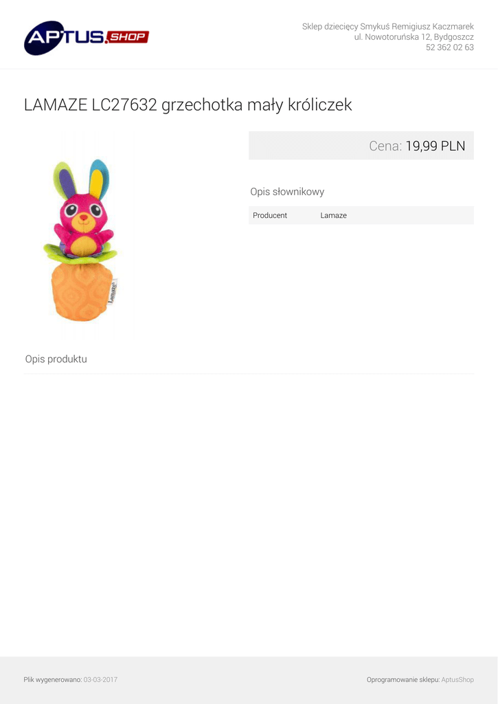 Sklep dziecięcy Smykuś Remigiusz Kaczmarek ul. Nowotoruńska 12, Bydgoszcz 52 362 02 63 LAMAZE LC27632 grzechotka mały króliczek Cena: 19,99 PLN Opis słownikowy Producent Lamaze Opis produktu Plik wygenerowano: 03-03-2017 Powered by TCPDF (www.tcpdf.org) Oprogramowanie sklepu: AptusShop