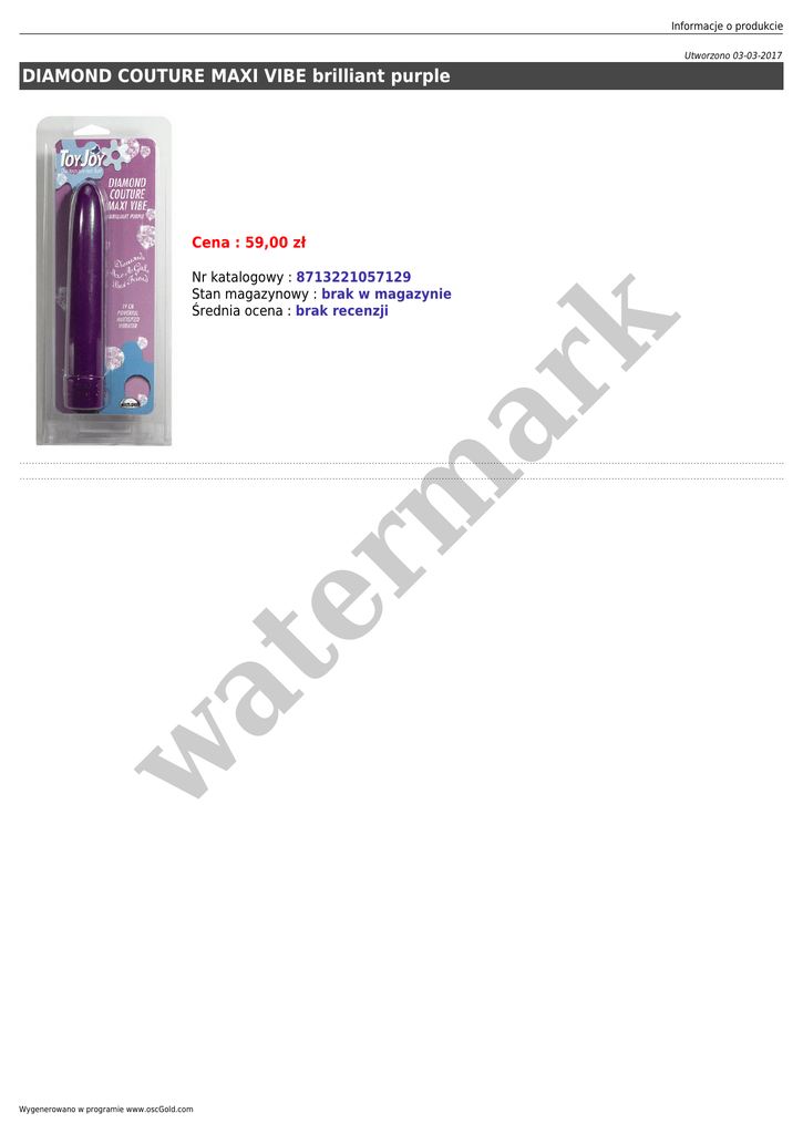 Informacje o produkcie Utworzono 03-03-2017 DIAMOND COUTURE MAXI VIBE brilliant purple Cena : 59,00 zł w at er m ar k Nr katalogowy : 8713221057129 Stan magazynowy : brak w magazynie Średnia ocena : brak recenzji Wygenerowano w programie www.oscGold.com