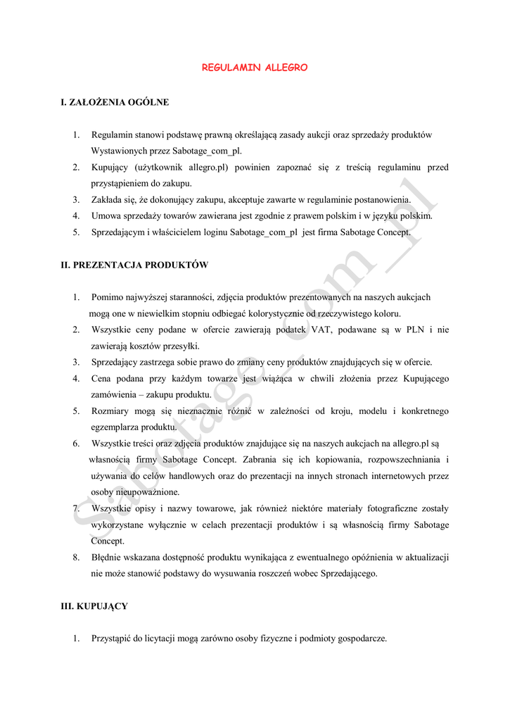REGULAMIN ALLEGRO I. ZAŁOŻENIA OGÓLNE 1. Regulamin stanowi podstawę prawną określającą zasady aukcji oraz sprzedaży produktów Wystawionych przez Sabotage_com_pl. 2. Kupujący (użytkownik allegro.pl) powinien zapoznać się z treścią regulaminu przed przystąpieniem do zakupu. 3. Zakłada się, że dokonujący zakupu, akceptuje zawarte w regulaminie postanowienia. 4. Umowa sprzedaży towarów zawierana jest zgodnie z prawem polskim i w języku polskim. 5. Sprzedającym i właścicielem loginu Sabotage_com_pl jest firma Sabotage Concept. II. PREZENTACJA PRODUKTÓW 1. Pomimo najwyższej staranności, zdjęcia produktów prezentowanych na naszych aukcjach mogą one w niewielkim stopniu odbiegać kolorystycznie od rzeczywistego koloru. 2. Wszystkie ceny podane w ofercie zawierają podatek VAT, podawane są w PLN i nie zawierają kosztów przesyłki. 3. Sprzedający zastrzega sobie prawo do zmiany ceny produktów znajdujących się w ofercie. 4. Cena podana przy każdym towarze jest wiążąca w chwili złożenia przez Kupującego zamówienia – zakupu produktu. 5. Rozmiary mogą się nieznacznie różnić w zależności od kroju, modelu i konkretnego egzemplarza produktu. 6. Wszystkie treści oraz zdjęcia produktów znajdujące się na naszych aukcjach na allegro.pl są własnością firmy Sabotage Concept. Zabrania się ich kopiowania, rozpowszechniania i używania do celów handlowych oraz do prezentacji na innych stronach internetowych przez osoby nieupoważnione. 7. Wszystkie opisy i nazwy towarowe, jak również niektóre materiały fotograficzne zostały wykorzystane wyłącznie w celach prezentacji produktów i są własnością firmy Sabotage Concept. 8. Błędnie wskazana dostępność produktu wynikająca z ewentualnego opóźnienia w aktualizacji nie może stanowić podstawy do wysuwania roszczeń wobec Sprzedającego. III. KUPUJĄCY 1. Przystąpić do licytacji mogą zarówno osoby fizyczne i podmioty gospodarcze. IV. PROCEDURA AUKCYJNA 1. Zamówienia przyjmowane są za pośrednictwem portalu aukcyjnego allegro.pl przez całą dobę. 2. Po złożeniu zamówienia Kupujący, na podany przez siebie adres e-mail, otrzyma wiadomość zwrotną z informacją o wskazaniu zamówionego produktu oraz danymi do dokonania wpłaty. V. REALIZACJA ZAMÓWIENIA 1. Realizacja zamówień następuje według kolejności wpływania potwierdzonych wpłat za konkretne produkty, aż do wyczerpania się zapasów. 2. Termin na wniesienie opłaty za zakup to 5 dni roboczych. 3. W przypadku wystąpienia okoliczności uniemożliwiających realizację złożonego zamówienia, Sprzedający zastrzega sobie prawo do wstrzymania jego realizacji, a o zaistniałej sytuacji zobowiązuje się niezwłocznie powiadomić Kupującego. VI. ZWROT ZAMÓWIENIA TOWARU 1. Zgodnie z ustawą o prawach konsumenta z dnia 30 maja 2014 r. (Dz.U. 2014 r. poz. 827 ze zm.) Klient może zrezygnować z towaru zakupionego w naszym sklepie bez podania przyczyny w ciągu 14 dni kalendarzowych od daty otrzymania przesyłki. 2. Klient może zrezygnować z towaru zakupionego bez podania przyczyny w ciągu 14 dni kalendarzowych od daty odebrania przesyłki. 3. Wraz z towarem należy odesłać dowód zakupu (paragon fiskalny lub fakturę VAT), który jest podstawą reklamacji oraz wypełniony dokument zwrotu towaru lub pisemne oświadczenie z podaniem: imienia, nazwiska, adresu, numerem zamówienia oraz dane niezbędne do dokonania przelewu (imię, nazwisko, adres, nr aukcji oraz numer konta, na jakie ma zostać dokonany zwrot pieniędzy). Od daty złożenia oświadczenia o odstąpieniu od umowy, Klient ma 14 dni kalendarzowych na odesłanie towaru. 4. Sprzedający gwarantuje zwrot kwoty równej cenie zwracanego towaru. Pieniądze zostaną zwrócone w ciągu 5 dni roboczych przelewem bankowym na konto wskazane przez Kupującego, licząc od daty otrzymania towaru przez Sprzedającego (pod warunkiem spełnienia wymagań wymienionych w punkcie 2 i 4). 5. W przypadku zwrotu towaru nie może on nosić śladów użytkowania oraz musi posiadać oryginalną metkę. W innym przypadku towar zostanie odesłany do Kupującego na jego koszt. 6. Koszt odesłania towaru nie podlega zwrotowi. 7. Sprzedający nie przyjmuje paczek wysłanych na koszt adresata ani za pobraniem. VII. WYMIANA ZAMÓWIONEGO TOWARU 1. Kupującym przysługuje prawo wymiany danego towaru na inny rozmiar lub model w ciągu 3 dni kalendarzowych od daty otrzymania produktu. 2. Dopuszcza się możliwość wymiany na inny produkt, którego cena może być wyższa (Kupujący musi dokonać wskazanej przez Sprzedającego dopłaty) lub na tańszy (różnica w cenie zostanie zwrócona Kupującemu na wskazane przez niego konto). 3. Koszty przesyłki w obie strony ponosi Kupujący. 4. Sprzedający nie przyjmuje paczek wysłanych na koszt adresata ani za pobraniem. 5. Odesłany towar nie może nosić żadnych śladów użytkowania, powinien posiadać fabryczne opakowanie oraz metki, w innym przypadku towar zostanie odesłany do klienta na jego koszt. 6. Wymiana zostanie zrealizowana w ciągu 3 dni kalendarzowych od otrzymania przesyłki na adres Sprzedającego (chyba, że wspólnie zapadną inne ustalenia). 7. W przypadku wymiany również konieczne jest wypełnienie dokumentu wymiany towaru. 8. Niedostosowanie się do powyższych zaleceń będzie podstawą nieuwzględnienia możliwości wymiany. VIII. REKLAMACJA ZAMÓWIONEGO TOWARU 1. W przypadku otrzymania towaru zgodnego z zamówieniem, jeśli jednak rozmiar okazał się nieodpowiedni zastosowanie ma procedura wymiany – nie reklamacji! 2. Reklamacji nie podlegają wszelkiego rodzaju przypadkowe lub celowe mechaniczne uszkodzenia (rozdarcia, przecięcia itp.) ani uszkodzenia spowodowane niedbałym, bądź niewłaściwym użytkowaniem lub pielęgnacją. 3. Podstawą przyjęcia reklamacji jest dowód zakupu produktu (paragon fiskalny lub faktura VAT). 4. Reklamacji podlegają jedynie produkty, od daty zakupu, których nie upłynął okr