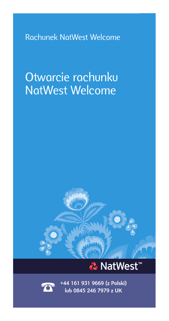 Rachunek NatWest Welcome Otwarcie rachunku NatWest Welcome +44 161 931 9669 (z Polski) lub 0845 246 7979 z UK Po wypełnieniu formularza i sprawdzeniu przez pracownika banku PKO BP Twojego paszportu lub dowodu osobistego rozpoczniemy proces otwarcia rachunku. Gdy otrzymamy informacje z banku PKO BP, przeprowadzimy wymaganą kontrolę, a po jej pozytywnym zakończeniu otworzymy dla Ciebie rachunek NatWest Welcome. Następnie po około 5 dniach od przekazania nam Twojego formularza prześlemy Ci list ze szczegółami dotyczącymi Twojego rachunku. Otrzymasz między innymi formularz adresowy, który musisz wypełnić i odesłać w załączonej kopercie po przybyciu do Wielkiej Brytanii. natwest.com/welcome Gdy znajdziesz się w Wielkiej Brytanii, prześlemy Ci następujące informacje: ● Pakiet powitalny zawierający informacje o rachunku, ● Numer klienta potrzebny do bankowości telefonicznej i internetowej, ● Kod aktywacyjny konieczny do aktywowania usługi bankowości internetowej, ● Książeczkę wpłat do dokonywania wpłat pieniężnych na rachunek, ● Kartę debetową do wykonywania codziennych transakcji finansowych na rachunku, ● Kartę bankomatową, która może być wysłana do wybranej osoby w Polsce. Wszystkie te informacje powinieneś otrzymać w ciągu 10 dni od przybycia do Wielkiej Brytanii. Jeżeli masz dodatkowe pytania lub nie otrzymałeś informacji o swoim rachunku, prosimy o kontakt z jednym z naszych polskich doradców pod numerem telefonu +44 161 931 9669 (z Polski) lub 0845 246 7979 z UK. +44 161 931 9669 (z Polski) lub 0845 246 7979 z UK Skontaktuj się z oddziałem PKO BP już dzisiaj natwest.com/welcome To proste Logo NATWEST i THREE CHEVRONS są znakami handlowymi National Westminster Bank Plc, używanymi przez PKO Bank Polski. Zarejestrowana siedziba: 135 Bishopsgate, London EC2M 3UR Numer rejestracyjny: 929027, Anglia NWB 6034P listopad 2007
