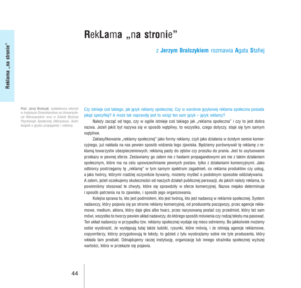Reklama na stronie RekLama na stronie z Jerzym Bralczykiem rozmawia Agata Stafiej Prof. Jerzy Bralczyk, wyk³adowca retoryki w Instytucie Dziennikarstwa na Uniwersytecie Warszawskim oraz w Szkole Wy¿szej Psychologii Spo³ecznej (Warszawa). Autor ksi¹¿ek o jêzyku propagandy i reklamy. 44 Czy istnieje co takiego, jak jêzyk reklamy spo³ecznej. Czy w warstwie jêzykowej reklama spo³eczna posiada jak¹ specyfikê? A mo¿e tak naprawdê jest to wci¹¿ ten sam jêzyk jêzyk reklamy? Nale¿y zacz¹æ od tego, czy w ogóle istnieje co takiego jak reklama spo³eczna i czy to jest dobra nazwa. Je¿eli jaki byt nazywa siê w sposób w¹tpliwy, to wszystko, czego dotyczy, staje siê tym samym w¹tpliwe. Zaklasyfikowanie reklamy spo³ecznej jako formy reklamy, czyli jako dzia³ania w cis³ym sensie komercyjnego, ju¿ nak³ada na nas pewien sposób widzenia tego zjawiska. Bêdziemy porównywali tê reklamê z reklam¹ towarzystw ubezpieczeniowych, reklam¹ pasty do zêbów czy proszku do prania. Jest to usytuowanie przekazu w pewnej sferze. Zestawiamy go zatem nie z has³ami propagandowymi ani nie z takim dzia³aniem spo³ecznym, które ma na celu upowszechnianie pewnych postaw, tylko z dzia³aniami komercyjnymi. Jako odbiorcy postrzegamy tê reklamê w tym samym spektrum zagadnieñ, co reklama produktów czy us³ug, a jako twórcy, którymi rzadziej oczywicie bywamy, mo¿emy myleæ o podobnym sposobie oddzia³ywania. A zatem, je¿eli oczekujemy skutecznoci od naszych dzia³añ publicznej perswazji, do jakich nale¿y reklama, to powinnimy stosowaæ te chwyty, które siê sprawdzi³y w sferze komercyjnej. Nazwa niejako determinuje i sposób patrzenia na to zjawisko, i sposób jego organizowania. Kolejna sprawa to, kto jest podmiotem, kto jest twórc¹, kto jest nadawc¹ w reklamie spo³ecznej. System nadawczy, który pojawia siê po stronie reklamy komercyjnej, od producenta pocz¹wszy, przez agencje reklamowe, medium, aktora, który daje g³os albo twarz, przez narysowan¹ postaæ czy przedmiot, który te¿ sam mówi, wszystko to tworzy pewien uk³ad nadawczy, do którego sposób mówienia czy rodzaj tekstu ma pasowaæ. Ten uk³ad nadawczy w przypadku tzw. reklamy spo³ecznej wydaje siê nieco odmienny. Bo jakkolwiek mo¿emy sobie wyobraziæ, ¿e wystêpuj¹ tutaj tak¿e ludziki, rysunki, które mówi¹, i ¿e istniej¹ agencje reklamowe, copywriterzy, którzy przygotowuj¹ te teksty, to gdzie z ty³u wyobra¿amy sobie nie tyle producenta, który wk³ada tam produkt. Odnajdujemy raczej instytucjê, organizacjê lub innego stra¿nika spo³ecznej wy¿szej wartoci, która w przekazie siê pojawia. Publicis Mamy bardzo ró¿ne odmiany reklamy, któr¹ mo¿emy uznaæ jako spo³eczn¹. W niej pojawia siê to, co jest bardzo bliskie komercji i to, co jest od komercji niezwykle oddalone, jest programem autentycznie spo³ecznym czy rz¹dowym. I jest to bardzo szeroki przedzia³. Ale chcê zwróciæ uwagê, ¿e tekst bywa, powinien byæ, i najczêciej jest, kompatybilny z jego twórc¹ nadawc¹ czy z uk³adem nadawczym. Sk³onni jestemy s¹dziæ, ¿e reklama spo³eczna rzadziej pos³uguje siê tym, co dla tamtej reklamy jest podstawowe, czyli pewnego rodzaju ¿artem, czy ¿artem frywolnym. To nie jest prawda. Bo oczywicie i tutaj ¿arty siê zdarzaj¹, ¿arty jêzykowe, zw³aszcza w seriach reklam. Pewien sposób mylenia, który jest wdrukowywany przyk³adowo na poziomie kalamburu prowokacyjnego, typu: Twoja nowa laska czy Twoje nowe drinki, gdzie pewne wieloznacznoci czasami mog¹ byæ nawet nieco niestosowne. Bo przecie¿ ten ¿art jêzykowy przy tragedii wydaje siê trochê nie w porz¹dku. Zazwyczaj sk³onni jestemy uznaæ, ¿e najwidoczniej tak w³anie nadawcy chc¹ upowszechniaæ okrelon¹ ideê, takie chc¹ stosowaæ chwyty retoryczne. Kiedy czytamy: Papierosy s¹ do dupy albo S³u¿y do grania, nie do zabijania, czyli prowokacyjne bardzo wyraziste teksty, to t³umaczymy sobie, ¿e jest to podporz¹dkowane pewnej wy¿szej idei. Tak rysuje siê sprawa uk³adu nadawczego i tego, kto lub co stoi z ty³u, kto do mnie mówi. Zakodowanym pierwszym tekstem, jedyn¹ g³êbok¹ struktur¹ tekstow¹ przekazu reklamowego jest: kup. Kup us³ugê, produkt, ale kup. Tutaj tak prostej podstawowej struktury przekazu, wydaje siê, nie mamy. W reklamie spo³ecznej jest to raczej wp³ywanie na postawy. B¹d jaki, myl o czym, zachowuj siê jako. To s¹ ukryte treci tych tekstów, które najcilej z reklam¹ spo³eczn¹ wi¹¿emy. Odetniemy wiêc od tak pojmowanej reklamy spo³ecznej ca³¹ sferê dzia³añ, które wystêpuj¹ w po³¹czeniu dwóch rodzajów reklam przekazu prospo³ecznego i czysto komercyjnego, który niejako, doæ nieudolnie zreszt¹, podpiera siê t¹ warstw¹ filantropijn¹. Czyli np.: Je¿eli kupisz ten proszek, to uratujesz ¿ycie ma³emu Pawe³kowi lub Dziêki tej firmie dzieci maj¹ dobre wakacje. Zreszt¹ jest to reklama, której serdecznie nie znoszê. Sprzedaje ona przy okazji typ dawnej, wymiewanej, nieszczerej filantropii, która tutaj siê pojawia, jako argument maj¹cy zwiêkszyæ po prostu sprzeda¿ produktu. Chcia³bym odci¹æ z reklamy spo³ecznej wszelkie autoreklamy. Czyli reklamê reklamy, tak¿e walkê o reklamê (np. bez reklamy ju¿ to znamy). Chodzi o ca³¹ sferê, która gdzieniegdzie jest uwa¿ana za dzia³anie spo³eczne. Czy to jest reklama spo³eczna? Chyba nie. Plakat kolejnej kampanii (1999) Fundacji Synapsis, podkrelaj¹cy rolê tej instytucji w rozwoju i samodzielnoci dzieci dotkniêtych autyzmem. 45