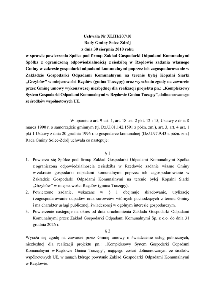 Uchwała Nr XLIII/207/10 Rady Gminy Solec-Zdrój z dnia 30 sierpnia 2010 roku w sprawie powierzenia Spółce pod firmą: Zakład Gospodarki Odpadami Komunalnymi Spółka z ograniczoną odpowiedzialnością z siedzibą w Rzędowie zadania własnego Gminy w zakresie gospodarki odpadami komunalnymi poprzez ich zagospodarowanie w Zakładzie Gospodarki Odpadami Komunalnymi na terenie byłej Kopalni Siarki „Grzybów” w miejscowości Rzędów (gmina Tuczępy) oraz wyrażenia zgody na zawarcie przez Gminę umowy wykonawczej niezbędnej dla realizacji projektu pn.: „Kompleksowy System Gospodarki Odpadami Komunalnymi w Rzędowie Gmina Tuczępy”, dofinansowanego ze środków wspólnotowych UE. W oparciu o art. 9 ust. 1, art. 18 ust. 2 pkt. 12 i 15, Ustawy z dnia 8 marca 1990 r. o samorządzie gminnym (tj. Dz.U.01.142.1591 z późn. zm.), art. 3, art. 4 ust. 1 pkt 1 Ustawy z dnia 20 grudnia 1996 r. o gospodarce komunalnej (Dz.U.97.9.43 z późn. zm.) Rada Gminy Solec-Zdrój uchwala co następuje: §1 1. Powierza się Spółce pod firmą: Zakład Gospodarki Odpadami Komunalnymi Spółka z ograniczoną odpowiedzialnością z siedzibą w Rzędowie zadanie własne Gminy w zakresie gospodarki odpadami komunalnymi poprzez ich zagospodarowanie w Zakładzie Gospodarki Odpadami Komunalnymi na terenie byłej Kopalni Siarki „Grzybów” w miejscowości Rzędów (gmina Tuczępy). 2. Powierzone zadanie, wskazane w § 1 obejmuje składowanie, utylizację i zagospodarowanie odpadów oraz surowców wtórnych pochodzących z terenu Gminy i ma charakter usługi publicznej, świadczonej w ogólnym interesie gospodarczym. 3. Powierzenie następuje na okres od dnia uruchomienia Zakładu Gospodarki Odpadami Komunalnymi przez Zakład Gospodarki Odpadami Komunalnymi Sp. z o.o. do dnia 31 grudnia 2026 r. §2 Wyraża się zgodę na zawarcie przez Gminę umowy o świadczenie usług publicznych, niezbędnej dla realizacji projektu pn.: „Kompleksowy System Gospodarki Odpadami Komunalnymi w Rzędowie Gmina Tuczępy”, mającego zostać dofinansowanym ze środków wspólnotowych UE, w ramach którego powstanie Zakład Gospodarki Odpadami Komunalnymi w Rzędowie. §3 Wykonanie niniejszej uchwały powierza się Wójtowi Gminy. §4 Uchwała wchodzi w życie z dniem podjęcia. Przewodniczący Rady Zenobiusz Kowalczyk Uzasadnienie 1) Tak zwana „umowa wykonawcza” stanowi zobowiązanie podmiotu publicznego (Gminy) i podmiotu, któremu powierzono zadanie własne Gminy (zadanie polegające na świadczeniu usług w ogólnym interesie gospodarczym), w tym przypadku planowany Zakład Gospodarki Odpadami Komunalnymi Sp. z o.o. z siedzibą w Rzędowie, do odpowiedniego wykonywania tej usługi i jeśli to konieczne uzyskiwania sporadycznie i tylko, gdy jest to uzasadnione dopłaty do tej usługi ze środków publicznych, zwanej rekompensatą. Powyższe wynika między innymi z pkt 58 Wytycznych w zakresie reguł dofinansowania z programów operacyjnych podmiotów realizujących obowiązek świadczenia usług publicznych (...), który stanowi, iż: „Finansowanie zadań wykonywanych przez spółkę komunalną następuje ze środków własnych tej spółki, (...) i/lub środków gminy. Wyposażenie spółki komunalnej w środki finansowe może nastąpić na podstawie mechanizmów przewidzianych w przepisach prawa, m. in. podwyższenia kapitału, dopłat, pożyczki wspólnika. Gmina może również przekazywać spółce komunalnej środki finansowe na podstawie łączących je umów cywilnoprawnych. Niniejsze postanowienia stosuje się odpowiednio do spółki komunalnej utworzonej przez więcej niż jedną gminę.” 2) Zawarcie takiej umowy jest jednym z koniecznych warunków uzyskania dofinansowania z programów pomocowych UE, co oznacza, że podpisana umowa wykonawcza jest jednym z niezbędnych elementów wnioskowania o przedmiotowe środki pomocowe. 3) Jak każda pomoc UE, tak i ta musi być zgodna z art. 86 ust 2 Traktatu , co skutkuje tym, że środki przyznane na budowę Zakładu Gospodarki Odpadami Komunalnymi na terenie byłej Kopalni Siarki „Grzybów” w miejscowości Rzędów (gmina Tuczępy) oraz ewentualne środki wypłacane w ramach rekompensaty uznane będą za pomoc (publiczną) zgodną ze wspomnianym art. 86 ust. 2 Traktatu. Dodatkowo problem umowy wykonawczej i rekompensaty charakteryzują poniższe fragmenty Decyzji Komisji Europejskiej z dnia 28 listopada 2005 r. w sprawie stosowania art. 86 ust. 2 Traktatu WE do pomocy państwa w formie rekompensaty z tytułu świadczenia usług publicznych, przyznawanej przedsiębiorstwom zobowiązanym do zarządzania usługami świadczonymi w ogólnym interesie gospodarczym (Dz. Urz. UE L 312 z 29.11.2005 r.): − Aby art. 86 ust. 2 Traktatu miał zastosowanie, przedsiębiorstwo będące beneficjentem pomocy musi zostać specjalnie zobowiązane przez Państwo Członkowskie [w tym przypadku – Gmina] do wykonywania szczególnych usług świadczonych w ogólnym interesie gospodarczym. Zgodnie z orzecznictwem stanowiącym wykładnię art. 86 ust. 2 Traktatu, akt lub akty nałożenia zobowiązania muszą określać przynajmniej dokładny charakter, zakres i − czas trwania zobowiązań z tytułu świadczenia usług publicznych oraz nazwę danego przedsiębiorstwa. (p 8 preambuły) Aby zapewnić spełnienie wymogu konieczności określonego w art. 86 ust. 2 Traktatu, − niezbędne jest przyjęcie przepisów dotyczących obliczania i kontrolowania kwoty przyznanej rekompensaty. (p. 13 preambuły) Aby niniejsza decyzja miała zastosowanie, dane przedsiębiorstwo jest zobowiązane do zarządzania usługami świadczonymi w ogólnym interesie gospodarczym poprzez jeden lub kilka aktów [w tym przypadku – umowę lub kilka umów], których forma może zostać określona przez każde Państwo Członkowskie. Akt lub akty powinny w szczególności określać: a) charakter i czas trwania zobowiązania z tytułu świadczenia usług publicznych; b) przedsiębiorstwa i terytoria, któr