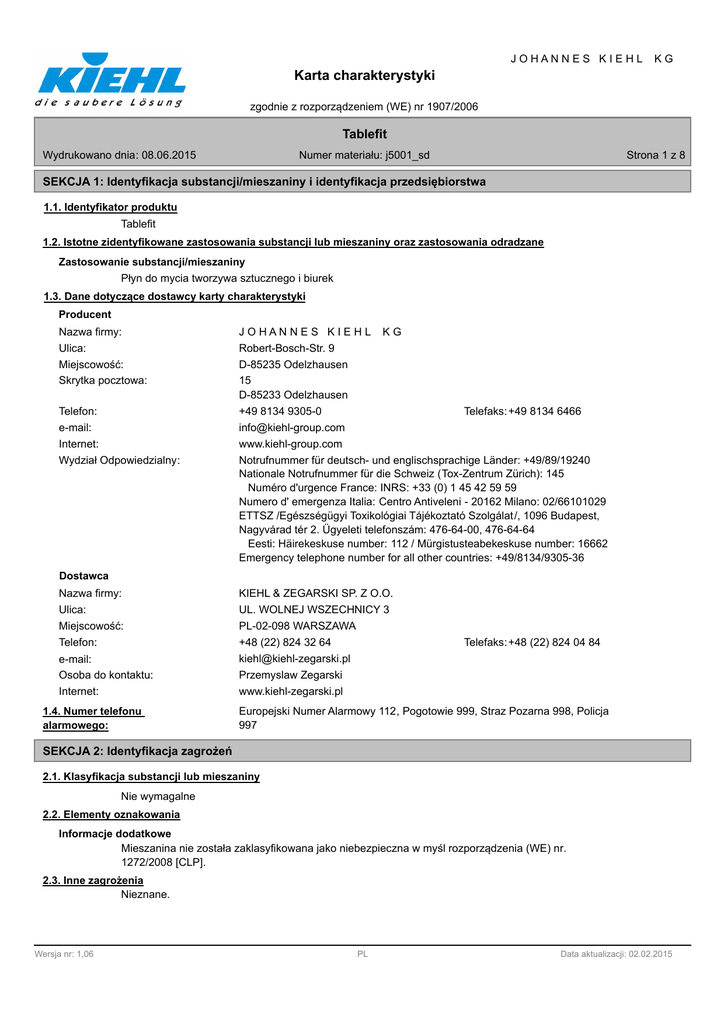 JOHANNES KIEHL KG Karta charakterystyki zgodnie z rozporządzeniem (WE) nr 1907/2006 Tablefit Wydrukowano dnia: 08.06.2015 Strona 1 z 8 Numer materiału: j5001_sd SEKCJA 1: Identyfikacja substancji/mieszaniny i identyfikacja przedsiębiorstwa 1.1. Identyfikator produktu Tablefit 1.2. Istotne zidentyfikowane zastosowania substancji lub mieszaniny oraz zastosowania odradzane Zastosowanie substancji/mieszaniny Płyn do mycia tworzywa sztucznego i biurek 1.3. Dane dotyczące dostawcy karty charakterystyki Producent Nazwa firmy: Ulica: Miejscowość: Skrytka pocztowa: Telefon: e-mail: Internet: Wydział Odpowiedzialny: JOHANNES KIEHL Robert-Bosch-Str. 9 D-85235 Odelzhausen 15 D-85233 Odelzhausen +49 8134 9305-0 [email protected] KG Telefaks: +49 8134 6466 www.kiehl-group.com Notrufnummer für deutsch- und englischsprachige Länder: +49/89/19240 Nationale Notrufnummer für die Schweiz (Tox-Zentrum Zürich): 145 Numéro d'urgence France: INRS: +33 (0) 1 45 42 59 59 Numero d' emergenza Italia: Centro Antiveleni - 20162 Milano: 02/66101029 ETTSZ /Egészségügyi Toxikológiai Tájékoztató Szolgálat/, 1096 Budapest, Nagyvárad tér 2. Ügyeleti telefonszám: 476-64-00, 476-64-64 Eesti: Häirekeskuse number: 112 / Mürgistusteabekeskuse number: 16662 Emergency telephone number for all other countries: +49/8134/9305-36 Dostawca Nazwa firmy: Ulica: KIEHL & ZEGARSKI SP. Z O.O. UL. WOLNEJ WSZECHNICY 3 Miejscowość: PL-02-098 WARSZAWA Telefon: +48 (22) 824 32 64 e-mail: Osoba do kontaktu: [email protected] Przemyslaw Zegarski Internet: www.kiehl-zegarski.pl 1.4. Numer telefonu alarmowego: Telefaks: +48 (22) 824 04 84 Europejski Numer Alarmowy 112, Pogotowie 999, Straz Pozarna 998, Policja 997 SEKCJA 2: Identyfikacja zagrożeń 2.1. Klasyfikacja substancji lub mieszaniny Nie wymagalne 2.2. Elementy oznakowania Informacje dodatkowe Mieszanina nie została zaklasyfikowana jako niebezpieczna w myśl rozporządzenia (WE) nr. 1272/2008 [CLP]. 2.3. Inne zagrożenia Nieznane. Wersja nr: 1,06 PL Data aktualizacji: 02.02.2015 JOHANNES KIEHL KG Karta charakterystyki zgodnie z rozporządzeniem (WE) nr 1907/2006 Tablefit Wydrukowano dnia: 08.06.2015 Strona 2 z 8 Numer materiału: j5001_sd SEKCJA 3: Skład/informacja o składnikach (zgodnie z 648/2004/EG) 3.2. Mieszaniny Charakterystyka chemiczna Środki anionowe powierzchniowo czynne <5%, Środki rozpuszczalne w wodzie, Aromaty Składniki niebezpieczne Nr WE Nr CAS Nr Index Nr REACH Nazwa chemiczna Ilość Klasyfikacja zgodnie z 67/548/EWG Klasyfikacja zgodnie z rozporządzeniem (WE) nr 1272/2008 [CLP] 200-661-7 propan-2-ol; alkohol izopropylu; izopropanol 67-63-0 F - Produkt wysoce łatwopalny, Xi - Produkt drażniący R11-36-67 603-117-00-0 Flam. Liq. 2, Eye Irrit. 2, STOT SE 3; H225 H319 H336 203-539-1 1-Metoksy-2-propanol 107-98-2 R10-67 603-064-00-3 Flam. Liq. 3, STOT SE 3; H226 H336 203-961-6 2-(2-butoksyetoksy)etanol; eter monobutylowy glikolu dietylenowego 112-34-5 Xi - Produkt drażniący R36 603-096-00-8 Eye Irrit. 2; H319 204-589-7 2-fenoksyetanol; eter monofenylowy glikolu etylenowego 122-99-6 Xn - Produkt szkodliwy, Xi - Produkt drażniący R22-36 603-098-00-9 Acute Tox. 4, Eye Irrit. 2; H302 H319 5 - < 10 % 5 - < 10 % 1-<5% 1-<5% Wydźwięk zwroty R, H i EUH: patrz sekcja 16. SEKCJA 4: Środki pierwszej pomocy 4.1. Opis środków pierwszej pomocy Wskazówki ogólne Brak zagrożeń wymagających specjalistycznej pierwszej pomocy. W przypadku wdychania brak niebezpieczeństwa przy wdychaniu W przypadku kontaktu ze skórą Zmyć dużą ilością wody. W przypadku kontaktu z oczami Płukać starannie dużą ilością wody, również pod powiekami. Jeśli podrażnienie oczu utrzymuje się, skonsultować się ze specjalistą. W przypadku połknięcia Przemyć usta wodą i następnie wypić dużą ilość wody. Jeśli to możliwe nie dopuścić do wymiotów. Jeśli zajdzie potrzeba zasięgnij porady lekarza. 4.2. Najważniejsze ostre i opóźnione objawy oraz skutki narażenia Informacje te nie są dostępne. 4.3. Wskazania dotyczące wszelkiej natychmiastowej pomocy lekarskiej i szczególnego postępowania z poszkodowanym Przedstawić lekarzowi dołączoną Kartę Charakterystyki Substancji Niebezpiecznej. Wersja nr: 1,06 PL Data aktualizacji: 02.02.2015 JOHANNES KIEHL KG Karta charakterystyki zgodnie z rozporządzeniem (WE) nr 1907/2006 Tablefit Wydrukowano dnia: 08.06.2015 Strona 3 z 8 Numer materiału: j5001_sd SEKCJA 5: Postępowanie w przypadku pożaru 5.1. Środki gaśnicze Odpowiednie środki gaśnicze W przypadku pożaru dopuszcza się użycie wszelkich środków przeciwpożarowych. 5.2. Szczególne zagrożenia związane z substancją lub mieszaniną Informacje te nie są dostępne. 5.3. Informacje dla straży pożarnej Użycie środków gaśniczych odpowiednich dla lokalnych warunków i dla środowiska. SEKCJA 6: Postępowanie w przypadku niezamierzonego uwolnienia do środowiska 6.1. Indywidualne środki ostrożności, wyposażenie ochronne i procedury w sytuacjach awaryjnych Unikać kontaktu z oczami. 6.2. Środki ostrożności w zakresie ochrony środowiska Nie wylewać do wód powierzchniowych. 6.3. Metody i materiały zapobiegające rozprzestrzenianiu się skażenia i służące do usuwania skażenia Zebrać razem z materiałem wchłaniającym (np. szmaty, włoknina). Zebranych wycieków nigdy nie przechowywać w oryginalnych pojemnikach do ponownego użycia. 6.4. Odniesienia do innych sekcji Sprawdź środki ochronne w sekcjach 7 i 8. SEKCJA 7: Postępowanie z substancjami i mieszaninami oraz ich magazynowanie 7.1. Środki ostrożności dotyczące bezpiecznego postępowania Wskazówki odnośnie bezpiecznego obchodzenia się z substancją Zapewnić wystarczającą wentylację. Wskazówki na wypadek pożaru i wybuchu Nie palić podczas stosowania. Przechowywać z dala od otwartego ognia, gorących powierzchni i źródeł zapłonu. 7.2. Warunki bezpiecznego magazynowania, łącznie z informacjami dotyczącymi wszelkich wzajemnych niezgodnośc
