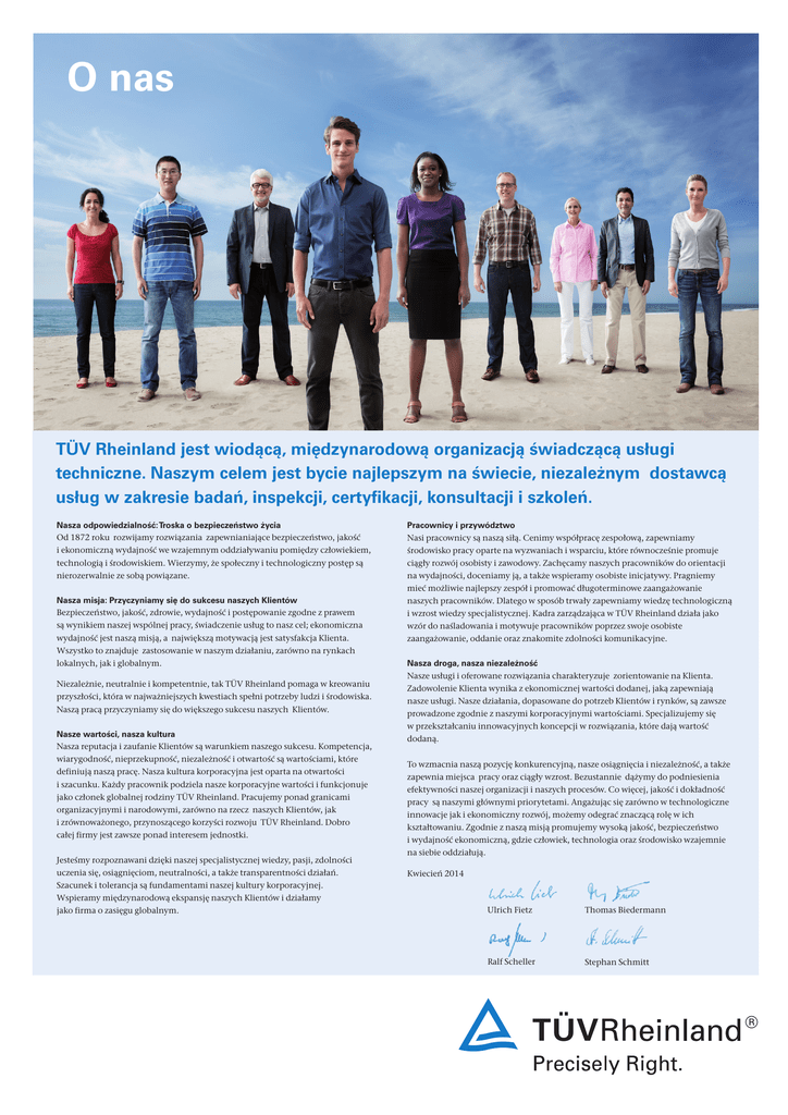 O nas TÜV Rheinland jest wiod¹c¹, miêdzynarodow¹ organizacj¹ œwiadcz¹c¹ us³ugi techniczne. Naszym celem jest bycie najlepszym na œwiecie, niezale¿nym dostawc¹ us³ug w zakresie badañ, inspekcji, certyfikacji, konsultacji i szkoleñ. Nasza odpowiedzialnoœæ: Troska o bezpieczeñstwo ¿ycia Od 1872 roku rozwijamy rozwi¹zania zapewnianiaj¹ce bezpieczeñstwo, jakoœæ i ekonomiczn¹ wydajnoœæ we wzajemnym oddzia³ywaniu pomiêdzy cz³owiekiem, technologi¹ i œrodowiskiem. Wierzymy, ¿e spo³eczny i technologiczny postêp s¹ nierozerwalnie ze sob¹ powi¹zane. Nasza misja: Przyczyniamy siê do sukcesu naszych Klientów Bezpieczeñstwo, jakoœæ, zdrowie, wydajnoœæ i postêpowanie zgodne z prawem s¹ wynikiem naszej wspólnej pracy, œwiadczenie us³ug to nasz cel; ekonomiczna wydajnoœæ jest nasz¹ misj¹, a najwiêksz¹ motywacj¹ jest satysfakcja Klienta. Wszystko to znajduje zastosowanie w naszym dzia³aniu, zarówno na rynkach lokalnych, jak i globalnym. Niezale¿nie, neutralnie i kompetentnie, tak TÜV Rheinland pomaga w kreowaniu przysz³oœci, która w najwa¿niejszych kwestiach spe³ni potrzeby ludzi i œrodowiska. Nasz¹ prac¹ przyczyniamy siê do wiêkszego sukcesu naszych Klientów. Nasze wartoœci, nasza kultura Nasza reputacja i zaufanie Klientów s¹ warunkiem naszego sukcesu. Kompetencja, wiarygodnoœæ, nieprzekupnoœæ, niezale¿noœæ i otwartoœæ s¹ wartoœciami, które definiuj¹ nasz¹ pracê. Nasza kultura korporacyjna jest oparta na otwartoœci i szacunku. Ka¿dy pracownik podziela nasze korporacyjne wartoœci i funkcjonuje jako cz³onek globalnej rodziny TÜV Rheinland. Pracujemy ponad granicami organizacyjnymi i narodowymi, zarówno na rzecz naszych Klientów, jak i zrównowa¿onego, przynosz¹cego korzyœci rozwoju TÜV Rheinland. Dobro ca³ej firmy jest zawsze ponad interesem jednostki. Jesteœmy rozpoznawani dziêki naszej specjalistycznej wiedzy, pasji, zdolnoœci uczenia siê, osi¹gniêciom, neutralnoœci, a tak¿e transparentnoœci dzia³añ. Szacunek i tolerancja s¹ fundamentami naszej kultury korporacyjnej. Wspieramy miêdzynarodow¹ ekspansjê naszych Klientów i dzia³amy jako firma o zasiêgu globalnym. Pracownicy i przywództwo Nasi pracownicy s¹ nasz¹ si³¹. Cenimy wspó³pracê zespo³ow¹, zapewniamy œrodowisko pracy oparte na wyzwaniach i wsparciu, które równoczeœnie promuje ci¹g³y rozwój osobisty i zawodowy. Zachêcamy naszych pracowników do orientacji na wydajnoœci, doceniamy j¹, a tak¿e wspieramy osobiste inicjatywy. Pragniemy mieæ mo¿liwie najlepszy zespó³ i promowaæ d³ugoterminowe zaanga¿owanie naszych pracowników. Dlatego w sposób trwa³y zapewniamy wiedzê technologiczn¹ i wzrost wiedzy specjalistycznej. Kadra zarz¹dzaj¹ca w TÜV Rheinland dzia³a jako wzór do naœladowania i motywuje pracowników poprzez swoje osobiste zaanga¿owanie, oddanie oraz znakomite zdolnoœci komunikacyjne. Nasza droga, nasza niezale¿noœæ Nasze us³ugi i oferowane rozwi¹zania charakteryzuje zorientowanie na Klienta. Zadowolenie Klienta wynika z ekonomicznej wartoœci dodanej, jak¹ zapewniaj¹ nasze us³ugi. Nasze dzia³ania, dopasowane do potrzeb Klientów i rynków, s¹ zawsze prowadzone zgodnie z naszymi korporacyjnymi wartoœciami. Specjalizujemy siê w przekszta³caniu innowacyjnych koncepcji w rozwi¹zania, które daj¹ wartoœæ dodan¹. To wzmacnia nasz¹ pozycjê konkurencyjn¹, nasze osi¹gniêcia i niezale¿noœæ, a tak¿e zapewnia miejsca pracy oraz ci¹g³y wzrost. Bezustannie d¹¿ymy do podniesienia efektywnoœci naszej organizacji i naszych procesów. Co wiêcej, jakoœæ i dok³adnoœæ pracy s¹ naszymi g³ównymi priorytetami. Anga¿uj¹c siê zarówno w technologiczne innowacje jak i ekonomiczny rozwój, mo¿emy odegraæ znacz¹c¹ rolê w ich kszta³towaniu. Zgodnie z nasz¹ misj¹ promujemy wysok¹ jakoœæ, bezpieczeñstwo i wydajnoœæ ekonomiczn¹, gdzie cz³owiek, technologia oraz œrodowisko wzajemnie na siebie oddzia³uj¹. Kwiecieñ 2014 Ulrich Fietz Thomas Biedermann Ralf Scheller Stephan Schmitt