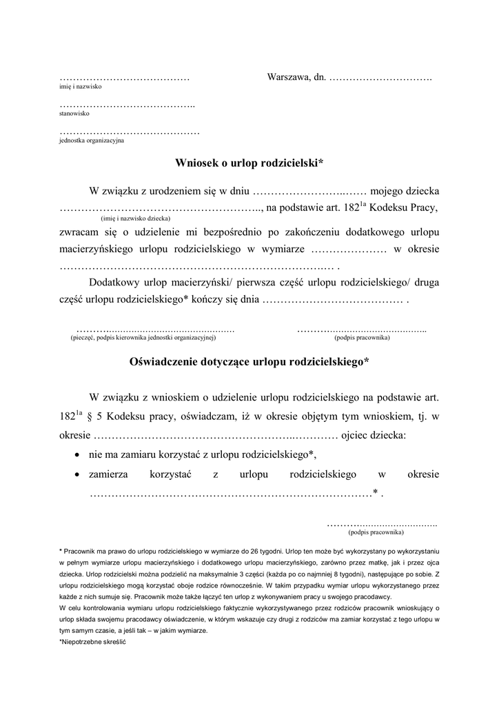 ………………………………… Warszawa, dn. …………………………. imię i nazwisko ………………………………….. stanowisko …………………………………… jednostka organizacyjna Wniosek o urlop rodzicielski* W związku z urodzeniem się w dniu ……………………..…… mojego dziecka ……………………………………………….., na podstawie art. 1821a Kodeksu Pracy, (imię i nazwisko dziecka) zwracam się o udzielenie mi bezpośrednio po zakończeniu dodatkowego urlopu macierzyńskiego urlopu rodzicielskiego w wymiarze ………………… w okresie ……………………………………………………………….… . Dodatkowy urlop macierzyński/ pierwsza część urlopu rodzicielskiego/ druga część urlopu rodzicielskiego* kończy się dnia ………………………………… . ……….……………………………………… ……….…………………………….. (pieczęć, podpis kierownika jednostki organizacyjnej) (podpis pracownika) Oświadczenie dotyczące urlopu rodzicielskiego* W związku z wnioskiem o udzielenie urlopu rodzicielskiego na podstawie art. 1821a § 5 Kodeksu pracy, oświadczam, iż w okresie objętym tym wnioskiem, tj. w okresie ………………………………………………..………… ojciec dziecka: nie ma zamiaru korzystać z urlopu rodzicielskiego*, zamierza korzystać z urlopu rodzicielskiego w okresie ……………………………………………………………………* . ……….………………………. (podpis pracownika) * Pracownik ma prawo do urlopu rodzicielskiego w wymiarze do 26 tygodni. Urlop ten może być wykorzystany po wykorzystaniu w pełnym wymiarze urlopu macierzyńskiego i dodatkowego urlopu macierzyńskiego, zarówno przez matkę, jak i przez ojca dziecka. Urlop rodzicielski można podzielić na maksymalnie 3 części (każda po co najmniej 8 tygodni), następujące po sobie. Z urlopu rodzicielskiego mogą korzystać oboje rodzice równocześnie. W takim przypadku wymiar urlopu wykorzystanego przez każde z nich sumuje się. Pracownik może także łączyć ten urlop z wykonywaniem pracy u swojego pracodawcy. W celu kontrolowania wymiaru urlopu rodzicielskiego faktycznie wykorzystywanego przez rodziców pracownik wnioskujący o urlop składa swojemu pracodawcy oświadczenie, w którym wskazuje czy drugi z rodziców ma zamiar korzystać z tego urlopu w tym samym czasie, a jeśli tak – w jakim wymiarze. *Niepotrzebne skreślić