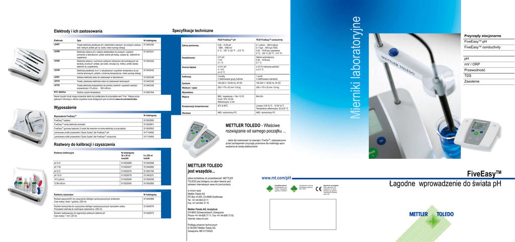 Mierniki laboratoryjne Specyfikacje techniczne Elektrody i ich zastosowania Elektroda Opis Nr katalogowy FE20 FiveEasyTM pH FE30 FiveEasyTM conductivity LE407 Trwała elektroda plastikowa pH z elektrolitem żelowym, do prostych zastosowań i łatwych próbek jak np. woda; niskie wymogi obsługi 51340330 Zakres pomiarowy LE409 Elektroda szklana pH z ciekłym elekterolitem do prostych i szybkich pomiarów w laboratorium, próbki wodne jak kwasy, zasady itp.; elektrolit do napełniania 51340331 0.00…14.00 pH -1999…1999 mV 0 °C…100 °C (32 °F …212 °F) 0.1 µS/cm…199.9 mS/cm 0.1 mg/l…199.9 g/l (TDS) 0.00…19.99 psu (zasolenie) 0 °C…100 °C (32 °F…212 °F) LE420 Rozdzielczość Elektroda szklana z ruchomym szklanym kołnierzem dla trudniejszych lub bardziej „brudnych” próbek, jak ścieki, emulsje (np. mleko), próbki oleiste; elektrolit do uzupełniania. 51340332 0.01 pH 1 mV 0.1 °C Zakres automatyczny 0.00…19.99 psu 0.1 °C LE438 Granice błędów Elektroda plastikowa 3-w-1 z wbudowanym czujnikiem temperatury do pomiarów terenowych, próbek o zmiennej temperaturze; niskie wymogi obsługi. 51340242 ± 0.01 pH ± 1 mV ± 0.5 °C ± 0.5 % mierzonej wartości ± 0.3 °C LE501 Szklana elektroda redox do zastosowań w laboratorium. 51340338 Kalibracja LE510 Trwała, plastikowa elektroda redox do zastosowań terenowych. 51340339 2 punkty 3 zdefiniowane grupy buforów 1 punkt 3 zdefiniowane standardy LE703 Trwała elektroda przewodności do pomiaru średnich i wysokich wartości przewodności (10 μS/cm … 500 mS/cm). 51340335 Zasilanie 100-240 V / 50-60 Hz, 9V DC 100-240 V / 50-60 Hz, 9V DC Wielkość / ciężar 200 x 175 x 52 mm / 0.6 kg 200 x 175 x 52 mm / 0.6 kg NTC 30kOhm Osobny czujnik temperatury. 51300164 Wyświetlacz Nasze czujniki InLab mogą oczywiście także być podłączane do przyrządów serii “Five”. Więcej szczegółowych informacji o ofercie czujników InLab dostępnych jest na stronie www.mt.com/electrodes. Wejścia BNC, impedancja > 10e +12 Ω Cinch, NTC 30 kΩ Referencyjne: 2 mm Mini-Din Wyposażenie Kompensacja temperaturowa ATC & MTC Liniowa: 0.00 %/°C…10.00 %/°C Temperatura referencyjna: 20 & 25 °C Obudowa ABS / wzmocniony PC ABS / wzmocniony PC Wyposażenie FiveEasyTM Nr katalogowy FiveEasyTM zasilacz 51302950 FiveEasyTM ramię elektrody (komplet) 51302951 FiveEasy gumowy kapturek (2 sztuki dla otworów na ramię elektrody w przyrządzie) 51302952 Laminowany krótki przewodnik (“Quick Guide”) dla FiveEasyTM pH 51710492 Laminowany krótki przewodnik (“Quick Guide”) dla FiveEasyTM conducivity 51710493 TM Przyrządy stacjonarne FiveEasyTM pH FiveEasyTM conductivity pH mV / ORP Przewodność TDS Zasolenie METTLER TOLEDO - Właściwe rozwiązanie od samego początku ... ... także dla zastosowań na zewnątrz: FiveGoTM, zabezpieczone przed zachlapaniem przyrządy przenośne dla mobilnego wprowadzenia do świata elektrochemii. Roztwory do kalibracji i czyszczenia Roztwory kalibracyjne Nr katalogowy 30 x 20 ml saszetki 6 x 250 ml butelki pH 4.01 51302069 51340058 pH 7.00 51302047 51340060 pH 9.21 51302070 51300194 pH 10.01 51302079 51340231 1413 µS/cm 51302049 51300259 12.88 mS/cm 51302050 51300260 Roztwory czyszczące Nr katalogowy Roztwór pepsyna/HCl do czyszczenia diafragm zanieczyszczonych proteinami. Czas reakcji: około 1 godziny. (250 ml) 51340068 Roztwór tiomocznika do czyszczenia diafragm zanieczyszczonych siarczkiem srebra. Pozostawić eletrodę do zaniknięcia zabarwienia. (250 ml) 51340070 Roztwór reaktywacyjny do regeneracji szklanych elektrod pH. Czas reakcji: 1 min. (25 ml) 51340073 METTLER TOLEDO jest wszędzie... adres kontaktowy do przedstawicieli METTLER TOLEDO jest dostępny na całym świecie pod adresem internetowym www.mt.com/contacts w innym razie: Mettler-Toledo AG PO Box VI-400, CH-8606 Greifensee Tel. +41-44-944 22 11 Fax +41-44-944 31 70 Mettler-Toledo AG, Analytical, CH-8603 Schwerzenbach, Szwajcaria Phone +41-44-806 77 11, Fax +41-44-806 73 50, Internet: www.mt.com Podlega zmianom technicznym © 04/2007 Mettler-Toledo AG, Szwajcaria, ME-51724522 www.mt.com/pH Certyfikat jakości Projektowanie, produkcja i testowanie zgodnie z ISO9001. Zarządzanie ochroną środowiska zgodnie z ISO 14001. Zgodność europejska Znak zgodności CE zapewnia, że nasze produkty są zgodne z najnowszymi dyrektywami UE. FiveEasyTM Łagodne wprowadzenie do świata pH FiveEasyTM pH FiveEasy™ pH oraz FiveEasy™ conductivity Odpowiednie do szerokiego zakresu zastosowań Woda Niezależnie od tego, czy jest to jezioro, czy oczyszczalnia ścieków - zachowanie pewnych wartości pH i przewodności wody jest niezbędne dla podtrzymania wszelkiego życia, czy to ludzi, roślin, czy też zwierząt. Rolnictwo Wartość pH gruntów uprawnych musi być regularnie monitorowana w celu ochrony ludzi i środowiska naturalnego przed potencjalnym zagrożeniem oraz w celu stworzenia idealnych warunków wzrostu produktów rolniczych. 5 x 5 powodów przemawiających za FiveEasyTM 5 użytecznych informacji o dużym, dobrze zorganizowanym wyświetlaczu 5 użytecznych akcesoriów 5 x niezwykły stosunek cena/jakość ■ ■ ■ ■ ■ ■ ■ ■ Równoczesne wyświetlanie odczytu pomiarowego, temperatury oraz punktu końcowego. Ikona elektrody: dostarcza informacje o stanie elektrody. Ikona kalibracji: przyrząd wykonuje kalibrację. Ikona pomiaru: przyrząd jest w trakcie wykonywania pomiarów. Ikona nastaw (setup): nastawy mogą być zmieniane. ■ ■ ■ Ramię elektrody może zostać przymocowane do prawej lub lewej strony przyrządu. Krótki przewodnik (Quick Guide) dla przyrządów stacjonarnych - laminowany dla zabezpieczenia przed pochlapaniem. Różnorodność elektrod dla różnych aplikacji. Szeroki wybór roztworów do kalibracji i czyszczenia. Dostępne są także osobny czujnik temperatury oraz elektrody ORP. ■ ■ ■ ■ Przemysł Jakość METTLER TOLEDO zapewniająca wiarygodne wyniki. Osobne wejście referencyjne dla po