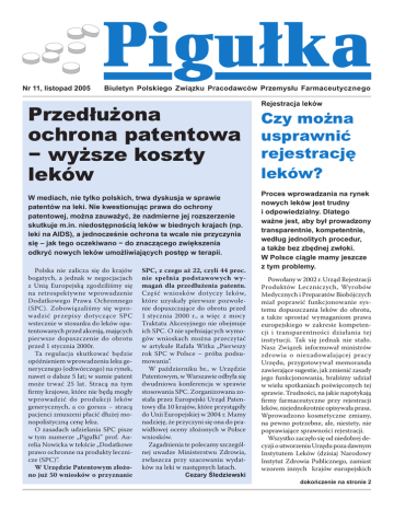 Nr 11, listopad 2005 Biuletyn Polskiego Związku Pracodawców Przemysłu Farmaceutycznego Przedłużona ochrona patentowa − wyższe koszty leków W mediach, nie tylko polskich, trwa dyskusja w sprawie patentów na leki. Nie kwestionując prawa do ochrony patentowej, można zauważyć, że nadmierne jej rozszerzenie skutkuje m.in. niedostępnością leków w biednych krajach (np. leki na AIDS), a jednocześnie ochrona ta wcale nie przyczynia się – jak tego oczekiwano − do znaczącego zwiększenia odkryć nowych leków umożliwiających postęp w terapii. Polska nie zalicza się do krajów bogatych, a jednak w negocjacjach z Unią Europejską zgodziliśmy się na retrospektywne wprowadzenie Dodatkowego Prawa Ochronnego (SPC). Zobowiązaliśmy się wprowadzić przepisy dotyczące SPC wstecznie w stosunku do leków opatentowanych przed akcesją, mających pierwsze dopuszczenie do obrotu przed 1 stycznia 2000r. Ta regulacja skutkować będzie opóźnieniem wprowadzeniu leku generycznego (odtwórczego) na rynek, nawet o dalsze 5 lat; w sumie patent może trwać 25 lat. Stracą na tym firmy krajowe, które nie będą mogły wprowadzić do produkcji leków generycznych, a co gorsza − stracą pacjenci zmuszeni płacić dłużej monopolistyczną cenę leku. O zasadach udzielania SPC pisze w tym numerze „Pigułki” prof. Aurelia Nowicka w tekście „Dodatkowe prawo ochronne na produkty lecznicze (SPC)”. W Urzędzie Patentowym złożono już 50 wniosków o przyznanie SPC, z czego aż 22, czyli 44 proc. nie spełnia podstawowych wymagań dla przedłużenia patentu. Część wniosków dotyczy leków, które uzyskały pierwsze pozwolenie dopuszczające do obrotu przed 1 stycznia 2000 r., a więc z mocy Traktatu Akcesyjnego nie obejmuje ich SPC. O nie spełniających wymogów wnioskach można przeczytać w artykule Rafała Witka „Pierwszy rok SPC w Polsce – próba podsumowania”. W październiku br., w Urzędzie Patentowym, w Warszawie odbyła się dwudniowa konferencja w sprawie stosowania SPC. Zorganizowana została przez Europejski Urząd Patentowy dla 10 krajów, które przystąpiły do Unii Europejskiej w 2004 r. Mamy nadzieję, że przyczyni się ona do prawidłowej oceny złożonych w Polsce wniosków. Zagadnienia te polecamy szczególnej uwadze Ministerstwu Zdrowia, zwłaszcza przy szacowaniu wydatków na leki w następnych latach. Cezary Śledziewski Rejestracja leków Czy można usprawnić rejestrację leków? Proces wprowadzania na rynek nowych leków jest trudny i odpowiedzialny. Dlatego ważne jest, aby był prowadzony transparentnie, kompetentnie, według jednolitych procedur, a także bez zbędnej zwłoki. W Polsce ciągle mamy jeszcze z tym problemy. Powołany w 2002 r. Urząd Rejestracji Produktów Leczniczych, Wyrobów Medycznych i Preparatów Biobójczych miał poprawić funkcjonowanie systemu dopuszczania leków do obrotu, a także sprostać wymaganiom prawa europejskiego w zakresie kompetencji i transparentności działania tej instytucji. Tak się jednak nie stało. Nasz Związek informował ministrów zdrowia o niezadowalającej pracy Urzędu, przygotowywał memoranda zawierające sugestie, jak zmienić zasady jego funkcjonowania, braliśmy udział w wielu spotkaniach poświęconych tej sprawie. Trudności, na jakie napotykają firmy farmaceutyczne przy rejestracji leków, niejednokrotnie opisywała prasa. Wprowadzono kosmetyczne zmiany, na pewno potrzebne, ale, niestety, nie poprawiające sprawności rejestracji. Wszystko zaczęło się od niedobrej decyzji o utworzeniu Urzędu poza dawnym Instytutem Leków (dzisiaj Narodowy Instytut Zdrowia Publicznego, zamiast wzorem innych krajów europejskich dokończenie na stronie 2 listopad 2005 2 Czy można usprawnić rejestrację leków? dokończenie ze strony 1 przekształcić go w instytucję rejestrującą leki i wyroby medyczne. Roztrwoniony kapitał Instytut Leków skupiał najlepiej przygotowanych fachowców do prowadzenia procesu rejestracji leków. Ten kapitał został roztrwoniony. Wprawdzie wielu specjalistów przeszło do pracy w Urzędzie jednak z różnych powodów, najczęściej leżących po stronie Urzędu, wkrótce odeszło znajdując pracę w firmach farmaceutycznych, badawczych, na uczelniach. Nowi pracownicy rekrutowani spoza grona fachowców dotąd zajmujących się procesem rejestracji, muszą nauczyć się niełatwych zagadnień związanych z wielopłaszczyznową oceną leku, a tego nie da się zrobić szybko. Sytuację dodatkowo utrudnia fakt, że wszyscy powinni być wobec częstych zmian wymagań rejestracyjnych oraz nowych procedur rejestracyjnych w UE permanentnie szkoleni. Ponadto Urząd do 31 grudnia 2008 r. musi, poza rejestracją nowych leków, przyjąć i zweryfikować uzupełnioną według unijnych wymagań dokumentację dla kilku tysięcy produktów zarejestrowanych w Polsce przed akcesją. Konieczne więc wydaje się zatrudnienie w nim większej liczby specjalistów i zapewnienie im odpowiedniego wynagrodzenia. Zwiększenia też wymaga budżet na ekspertyzy zewnętrzne, inaczej − nie zdążymy z rejestracją w wyznaczonym przez UE terminie. Gdzie poszukiwać fachowców? Przede wszystkim w Narodowym Instytucie Zdrowia Publicznego (NIZP), gdzie ciągle pracują specjaliści zajmujący się od lat oceną dokumentacji rejestracyjnej, głównie jej częścią farmaceutyczno-chemiczną. To w znacznym stopniu przyczyniłoby się do usprawnienia i potanienia całego procesu. Opinie o konieczności zatrudnienia w Urzędzie kilkuset fachowców są Oczekujemy, że nowe kierownictwo resortu potraktuje kwestię dopuszczania leków do obrotu z należytą uwagą i podejmie decyzje, które usprawnią ten proces pewnie słuszne, tyle że mało realne jest dokonanie tego w krótkim czasie, jaki pozostał nam do zakończenia procesu harmonizacji dokumentacji „starych” produktów, tj. do końca 2008 r. Niewydolna struktura Kolejną sprawą, która wydłuża proces rejestracji jest zła struktura 