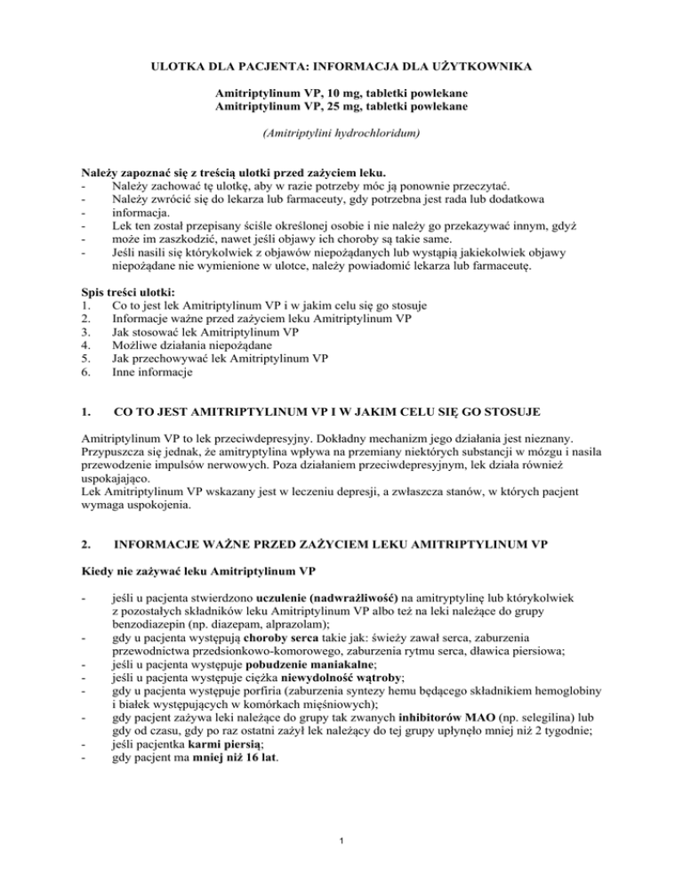 ULOTKA DLA PACJENTA: INFORMACJA DLA UŻYTKOWNIKA Amitriptylinum VP, 10 mg, tabletki powlekane Amitriptylinum VP, 25 mg, tabletki powlekane (Amitriptylini hydrochloridum) Należy zapoznać się z treścią ulotki przed zażyciem leku. Należy zachować tę ulotkę, aby w razie potrzeby móc ją ponownie przeczytać. Należy zwrócić się do lekarza lub farmaceuty, gdy potrzebna jest rada lub dodatkowa informacja. Lek ten został przepisany ściśle określonej osobie i nie należy go przekazywać innym, gdyż może im zaszkodzić, nawet jeśli objawy ich choroby są takie same. Jeśli nasili się którykolwiek z objawów niepożądanych lub wystąpią jakiekolwiek objawy niepożądane nie wymienione w ulotce, należy powiadomić lekarza lub farmaceutę. Spis treści ulotki: 1. Co to jest lek Amitriptylinum VP i w jakim celu się go stosuje 2. Informacje ważne przed zażyciem leku Amitriptylinum VP 3. Jak stosować lek Amitriptylinum VP 4. Możliwe działania niepożądane 5. Jak przechowywać lek Amitriptylinum VP 6. Inne informacje 1. CO TO JEST AMITRIPTYLINUM VP I W JAKIM CELU SIĘ GO STOSUJE Amitriptylinum VP to lek przeciwdepresyjny. Dokładny mechanizm jego działania jest nieznany. Przypuszcza się jednak, że amitryptylina wpływa na przemiany niektórych substancji w mózgu i nasila przewodzenie impulsów nerwowych. Poza działaniem przeciwdepresyjnym, lek działa również uspokajająco. Lek Amitriptylinum VP wskazany jest w leczeniu depresji, a zwłaszcza stanów, w których pacjent wymaga uspokojenia. 2. INFORMACJE WAŻNE PRZED ZAŻYCIEM LEKU AMITRIPTYLINUM VP Kiedy nie zażywać leku Amitriptylinum VP - jeśli u pacjenta stwierdzono uczulenie (nadwrażliwość) na amitryptylinę lub którykolwiek z pozostałych składników leku Amitriptylinum VP albo też na leki należące do grupy benzodiazepin (np. diazepam, alprazolam); gdy u pacjenta występują choroby serca takie jak: świeży zawał serca, zaburzenia przewodnictwa przedsionkowo-komorowego, zaburzenia rytmu serca, dławica piersiowa; jeśli u pacjenta występuje pobudzenie maniakalne; jeśli u pacjenta występuje ciężka niewydolność wątroby; gdy u pacjenta występuje porfiria (zaburzenia syntezy hemu będącego składnikiem hemoglobiny i białek występujących w komórkach mięśniowych); gdy pacjent zażywa leki należące do grupy tak zwanych inhibitorów MAO (np. selegilina) lub gdy od czasu, gdy po raz ostatni zażył lek należący do tej grupy upłynęło mniej niż 2 tygodnie; jeśli pacjentka karmi piersią; gdy pacjent ma mniej niż 16 lat. 1 Kiedy zachować szczególną ostrożność stosując lek Amitriptylinum VP - - jeśli u pacjenta występuje niewydolność wątroby, nadczynność tarczycy oraz gdy pacjent przyjmuje hormony tarczycy (działanie leku może być wtedy silniejsze); gdy u pacjenta występują zaburzenia psychiczne (zespół afektywny dwubiegunowy, schizofrenia, objawy paranoidalne), padaczka, przerost gruczołu krokowego, jaskra z zamkniętym kątem przesączania, zaburzenia powodujące, że przesuwanie się treści pokarmowej w przewodzie pokarmowym jest spowolnione (lek może wpływać na objawy tych nieprawidłowości); jeśli pacjent przyjmuje duże dawki leku, ponieważ może to spowodować zaburzenia rytmu serca, szybkie bicie serca oraz znaczne zmniejszenie ciśnienia tętniczego krwi (podobne zaburzenia mogą wystąpić po stosowaniu zwykłych dawek u pacjentów z chorobami serca); gdy u pacjenta ma być wykonany zabieg chirurgiczny lub stomatologiczny (należy uprzedzić lekarza o przyjmowaniu leku Amitriptylinum VP, by mógł on stopniowo odstawić lek na kilka dni przed zabiegiem lub zastosować inny sposób postępowania); jeśli u pacjenta występują zaburzenia krwi, astma, zatrzymanie moczu, alkoholizm. W początkowym okresie leczenia amitryptyliną, wynoszącym od dwóch do czterech tygodni, ryzyko podjęcia próby samobójczej jest zwiększone (patrz punkt 4). W trakcie leczenia amitryptyliną nie zaleca się przeprowadzania terapii elektrowstrząsami, z uwagi na możliwość nasilenia związanych z tą terapią powikłań. Należy pamiętać, że nagłe przerwanie leczenia, zwłaszcza po dłuższym okresie stosowania leku, może spowodować wystąpienie szeregu działań niepożądanych; w celu ich uniknięcia zaleca się stopniowe odstawianie leku. Zażywanie leku Amitriptylinum VP z innymi lekami Nie należy zażywać amitryptyliny jednocześnie z: lekami z grupy inhibitorów MAO oraz przed upływem 2 tygodni od przyjęcia ostatniej dawki tych leków (istnieje niebezpieczeństwo wystąpienia nadciśnienia, gorączki oraz drgawek), lekami sympatykomimetycznymi, takimi jak adrenalina, noradrenalina, izoprenalina, efedryna, fenylefryna i fenylpropanolamina. Należy zachować ostrożność stosując amitryptylinę jednocześnie z: lekami cholinolitycznymi (np. oksybutylina, triheksyfenidyl) i hormonami tarczycy; lekami sympatykolitycznymi (np. klonidyna czy guanetydyna – stosowane w leczeniu nadciśnienia tętniczego); lekami o hamującym działaniu na ośrodkowy układ nerwowy, takimi jak: barbiturany, benzodiazepiny, pochodne fenotiazyny, opioidowe leki przeciwbólowe, nieopioidowe leki przeciwbólowe, leki przeciwhistaminowe; disulfiramem (stosowany w leczeniu uzależnienia od alkoholu); lekami, które hamują przemiany metaboliczne amitryptyliny, takimi jak chinidyna, cymetydyna, niektóre leki przeciwdepresyjne, leki pochodne fenotiazyny, inhibitory wychwytu zwrotnego serotoniny oraz leki przeciwarytmiczne klasy 1C (między innymi propafenon i flekainid); środkami znieczulającymi; lekami antycholinergicznymi lub z neuroleptykami; rytonawirem (stosowany w leczeniu AIDS) - może zwiększać stężenie amitryptyliny w surowicy. Należy powiedzieć lekarzowi o wszystkich przyjmowanych ostatnio lekach, również tych, które wydawane są bez recepty. Zażywanie leku Amitriptylinum VP z jedzeniem i piciem Jedzenie i picie nie ma wpływu na działanie leku. Uspokaja