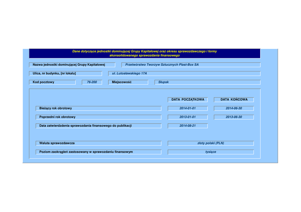Przetwórstwo Tworzyw Sztucznych Plast-Box S.A. (zwana dalej jednostką dominującą) prowadzi działalność w formie spółki akcyjnej od 22 czerwca