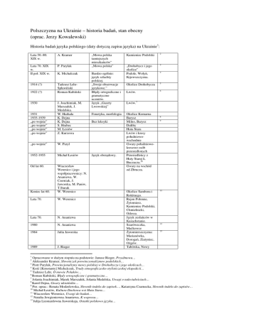 Polszczyzna na Ukrainie – historia badań, stan obecny (oprac. Jerzy Kowalewski) Historia badań języka polskiego (daty dotyczą zapisu języka) na Ukrainie1: Lata 50.-80. XIX w. A. Kramer Lata 70. XIX w. II poł. XIX w. P. Parylak 1914 (?) 1922 (?) 1930 K. Michalczak Tadeusz LehrSpławiński Roman Kubiński 1931 1935-1939 „po wojnie” „po wojnie” „po wojnie” „po wojnie” J. Joachimiak, M. Marszałek, J. Medelska. W. Harhala K. Dejna K. Dejna S. Hrabec M. Łesiów Z. Kurzowa „po wojnie” W. Paryl 1952-1955 Michał Łesiów Od lat 60. Koniec lat 60. Wiaczesław Werenicz i jego współpracownicy: N. Ananiewa, W. Czerniak, J. Jaworska, M. Paniw, T.Starak W. Werenicz Lata 70. W. Werenicz Lata 70. N. Ananiewa 1980 N. Ananiewa 1984 Julia Jaworska 1989 J. Rieger 1 „Mowa polska tamtejszych mieszkańców” „Mowa polska” Bardzo ogólnie: język szlachty polskiej. „Swoje obserwacje językowe.” Błędy ortograficzne i gramatyczne uczniów. Język „Gazety Lwowskiej” Fonetyka, morfologia Bez leksyki Język obrzędowy. Kamieniec Podolski 2 „Drohobycz i jego okolice” Podole, Wołyń, Kijowszczyzna. 3 Okolice Drohobycza 5 Lwów. 6 4 Lwów.7 Okolice Komarna Barysz Milno, Barysz Duliby Huta Stara Lwów i kresy południowowschodnie Gwary południowokresowe osób przesiedlonych Przesiedleńcy z Huty Starej k. Buczacza.10 Gwary na wschód od Zbrucza. Okolice Sambora i Rokitnego. Rejon Połonne, Żytomierz, Kamieniec Podolski, Chmielnicki, Odessa. Język zesłańców w Kazachstanie. Szaróweczka, Maćkowce Żytomierszczyzna: Marianówka, Dorogań, Ziatyniec, Ożgów. Tabówka, Nowy 8 9 11 12 13 Opracowano w dużym stopniu na podstawie: Janusz Rieger, Przedmowa… Aleksander Kramer, Słowniczek prowincyonalizmow podolskich… 3 Piotr Parylak, Prowincjonalizmy mowy polskiej w Drohobyczu i jego okolicach… 4 Kość [Konstanty] Michalczak, Trudy etnograficzesko-stylisticzeskoj ekspedicii… 5 Tadeusz Lehr, O mowie Polaków… 6 Roman Kubiński, Błędy ortograficzne i gramatyczne… 7 Jolanta Joachimiak, Marek Marszałek, Jolanta Medelska, Uwagi o naleciałościach… 8 Karol Dejna, Gwary ukraińskie… 9 Por. oprac.: Renata Modzelewska, Słownik-indeks do zapisek…, Katarzyna Czarnecka, Słownik-indeks do zapisów… 10 Michał Łesiów, Kultura Duchowa wsi Huta Stara… 11 Wiaczesław Werenicz, Uwagi do badań… 12 Natalia Jewgieniewna Ananiewa, K woprosu… 13 Julija Lieonardowna Jaworskaja, Ostatki polskowo języka… 2 1989/90 „Język starszego pokolenia inteligencji lwowskiej” 1990 J. Rieger 1990 Helena SojkaMasztalerz 1990-1998 W. Paryl 1991 1991/1992 S. Pańcio Hanna Karaszczuk, Janusz Rieger J. Rieger 1992 1993 J. Rieger, I. Cechosz, E. Dzięgiel 1993 I. Cechosz, E. Dzięgiel, J. Sierociuk 1994 J. Rieger, I. Cechosz, E. Dzięgiel I. Cechosz, E. Dzięgiel Maryna Ohołenko, Ołesia Łazarenko Irena Masalska 1994 1994 1994 (?) -1996 1995 J. Rieger, I. Cechosz, E. Dzięgiel, O. Łazarenko, M. Ohołenko, J. Wolska 1995 O. Łazarenko 1995 Olga Krasowska, Helena Krasowska, Janusz Rieger I. Cechosz, E. Dzięgiel, M. SłońNowaczek A. Smierczko 1996 1996 1996 1995-1996 14 Beata Pacan Masalska I., Dzięgiel E. Język mówiony lwowian oraz pisany (prace pisemne) uczniów tzw. szkół polskich. Przesiedleńcy. Studenci ukraińscy polonistyki. Zawód, Gwozdawa k. Żytomierza Lwów Gródek Podolski, Kamieniec Podolski, Jańczyńce (Kołybajówka), Żwaniec Lwów Ze wsi Święty Józef na Pokuciu. Hałuszczyńce Łuck 16 15 16 17 18 Hałuszczyńce k. Tarnopola. Hreczany, Szaróweczka, Oleszkowce, Felsztyn (Hwardejsk) Tarnoruda, Połupanówka, Nowosiółka, Stary Skałat. Zielona, Wójtowce (Pisarówka) Kijów Słownictwo 9 informatorów ur. 1932-57, „Gazeta Lwowska”. Słobódka Krasiłowska Lwów Wójtowce, Zielona, Krzywaczyńce, Kaniówka, Hajdaki, Martynówka, Połonne, Burtyn, Poninka, Tokarówka (Perszotraweńsk) 5 wsi polskich w okolicach Kijowa. Panka na Bukowinie 19 20 21 Okolice Sambora Polszczyzna informatora z Lublan k/ Sambora. Język księdza. Polszczyzna listów do „Gazety Drohobycz 22 Lwów Lwowskie (?) 23 Elżbieta Smułkowa, Uwagi o języku… Helena Sojka-Masztalerz, Niektóre zjawiska… Władysław Paryl, O zmianach w mowie przesiedleńców… 17 Ewa Dzięgiel, Fleksja czasownika w gwarze Hałuszczyńców… 18 Hanna Karaszczuk, Janusz Rieger, O błędach łuckich Ukraińców… 19 Maryna Ohołenko, Ołesia Łazarenko, Ewa Dzięgiel, Uwagi o gwarze wsi… 20 Irena Masalska, Kilka uwag… 21 Helena Krasowska, Janusz Rieger, Teksty z Panki na Bukowinie. 22 Iwona Cechosz, Uwagi o gwarze… 23 Beata Pacan, Uwagi o polszczyźnie… 24 Irena Masalska, Ewa Dzięgiel, Polszczyzna listów do „Gazety Lwowskiej”… 15 14 24 Lwowskiej” 1996-2002 1997 G. Tymbrowska Ołesia Łazarenko 1998-1999 O. Ostapczuk 1999-2000 R. Modzelewska 2001 E. Dzięgiel, R. Modzelewska Genowefa Tymbrowska, Aleksandra Krawczuk E. Dzięgiel, M. Kłosiewicz-Lepianka G. Tymbrowska, A. Krawczyk Ludmiła Januszewska A. KrawczukWieczorek, G. Tymbrowska, M. Gugała G. Tymbrowska Natalia Popławska 2001 2002 2002 2002 2002 2002/03 2003/04 (?) Przełom wieku XX / XXI Ł. Pupenko Przełom wieku XX / XXI Maryna OhojenkoJurewicz Początek XXI w. A. Krawczuk Materiał z lat 1990-2012 O. Ohoriłko Od 2006 L. Korol Po 2008 M. Zielińska 2008 2008 (?) Katarzyna Czarnecka Maryna Jurewicz 2008 (?) Oksana Zakhutska 2008-2011 Alina Burysz 25 Żytomierskie Raska, Talskie (d. Łambertów, obw. borodziański), Oliwa / Oływa (rejon iwankowski), Sobolówka, Kodra (rejon makarowski). Winnica, Bar, Murafa, Wytawa (część Hniwania) Satanów, Kamionka nad Zbruczem. Okolice Sambora Józefówka (Żytomierszczyzna) 26 27 Okolice Sambora Żytomierskie leksyka Hreczany 28 Siaberka, Maćkowce leksyka „Język polskiej inteligencji”. Nazwy własne (zdrobnienia), język obrzędowy, religijny. Badania socjolingwistyczne (samoidentyfikacji narodowej). Język prasy polskiej – błędy. Język studentów (analiz