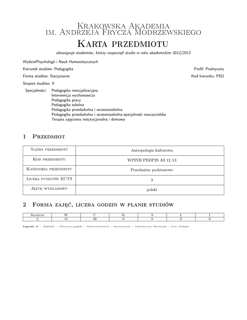 Krakowska Akademia im. Andrzeja Frycza Modrzewskiego Karta przedmiotu obowiązuje studentów, którzy rozpoczęli studia w roku akademickim 2012/2013 WydziałPsychologii i Nauk Humanistycznych Kierunek studiów: Pedagogika Profil: Praktyczny Forma studiów: Stacjonarne Kod kierunku: PED Stopień studiów: II Specjalności: 1 2 Pedagogika resocjalizacyjna Interwencja wychowawcza Pedagogika pracy Pedagogika szkolna Pedagogika przedszkolna i wczesnoszkolna Pedagogika przedszkolna i wczesnoszkolna-specjalność nauczycielska Terapia zajęciowa instytucjonalna i domowa Przedmiot Nazwa przedmiotu Antropologia kulturowa Kod przedmiotu WPINH PEDP2S A9 12/13 Kategoria przedmiotu Przedmioty podstawowe Liczba punktów ECTS 3 Język wykładowy polski Forma zajęć, liczba godzin w planie studiów Semestr 2 W 15 C 30 K 0 S 0 L 0 Legenda: W — WykładC — Ćwiczenia/językiK — KonwersatoriumS — SeminariumL — Laboratorium, WarsztatyI — Inne, Praktyki I 0 Krakowska Akademia im. Andrzeja Frycza Modrzewskiego 3 Cele przedmiotu Cel 1 I. Dostarczenie wiedzy na temat głównych kierunków i dziedzin badawczych klasycznej antropologii kulturowej. Studenci powinni znać i rozumieć następujące grupy zagadnień: (1) Potrzebę opisu i zrozumienia kultur innych niż europejska, (2) Mechanizm przekształcenia się potocznej i zmitologizowanej wiedzy o innych w naukę, która zinstytucjonalizowała się dopiero po pierwszej wojnie światowej, (3)Podstawowe pola teoretyczno badawcze przedmiotu, tj. (a)sposoby adaptacji do środowiska, (b)podstawowe formy organizacji życia społecznego, (c) główne systemy wyobrażeń o świecie II. Pokazanie wewnętrznej logiki głównych paradygmatów wiedzy antropologicznej: ewolucjonizmu, dyfuzjonizmu, relatywizmu kulturowego, funkcjonalizmu, strukturalizmu. Zaprezentowanie najważniejszych różnic pomiędzy tymi paradygmatami III. Wykształcenie umiejętności empatycznego rozumienia "innych" i ich kultur. Zbudowanie postaw tolerancji i otwartości wobec odmienności kulturowej. Poprzez konfrontację z innymi kulturami głębsze zrozumienie własnej kultury Cel 2 II. Pokazanie wewnętrznej logiki głównych paradygmatów wiedzy antropologicznej: ewolucjonizmu, dyfuzjonizmu, relatywizmu kulturowego, funkcjonalizmu, strukturalizmu. Zaprezentowanie najważniejszych różnic pomiędzy tymi paradygmatami 4 Wymagania wstępne 1 Brak wymagań wstępnych 5 Modułowe efekty kształcenia MW1 Zna podstawowe definicje i pojęcia z zakresu antropologii kulturowej. MW2 Zna historyczny proces kształtowania się wiedzy o kulturze. Rozpoznaje podstawowe, historycznie ukształtowane paradygmaty antropologii kulturowej. MU3 Umie zanalizować związek pomiędzy strukturą społeczną zbiorowości ludzkiej a wytworzoną przez nią kulturą. MU4 Analizuje wzajemne związki pomiędzy materialnym podłożem bytowania zbiorowości ludzkich , a ich strukturą społeczną oraz treścią i formą zbiorowych wyobrażeń o świecie. MK5 Jest świadoma/y konieczności stałego uaktualniania wiedzy, zachowuje krytycyzm i skłonność do weryfikowania pozyskiwanych informacji. 6 Treści programowe Lp W1 W2 W3 W4 W5 W6 W7 W8 Wykład Tematyka zajęć Opis szczegółowy bloków tematycznych 1. Organizacja zajęć. Omówienie programu. Przedmiot i zakres przedmiotu. Antropologia kulturowa wobec innych nauk o społeczeństwie i kulturze. Pojęcie kultury. Natura a kultura. Typologia definicji kultury. 2. Teoria J. G. Herdera (1744 1803) jako prefiguracja antropologicznej teorii kultury. Socjologiczne i antropologiczne rozumienie kultury. Uniwersalia kulturowe. Społeczna relatywizacja kultury. Etnocentryzm a tolerancja. 3. Ewolucjonizm (E.B. Tylor i H. Morgan). Szkoła heliocentryczna i dyfuzjonizm w antropologii kulturowej. Rozwój i postęp w kulturze ludzkiej. 4. Franz Boas i jego uczniowie, czyli amerykańska szkoła historyczno-terenowa. Alfred Kroeber, Robert Lowie, Edward Sapir, Ruth Benedict and Margaret Mead. Jedność kultury i wielość kultur. 5. Funkcjonalizm. Bronisław Malinowski i Alfred Reginald Radcliffe-Brown. 6. Strukturalizm antropologiczny. Analiza strukturalna. Ferdinand de Saussure i Claude Levi- Strauss. Podstawy semiotyki kultury. 7. Rodzina i pokrewieństwo. Gospodarka i ekonomia. Magia i religia. 8. Język i kultura. Główne zagadnienia socjologii i antropologii języka. Razem Strona 2/5 Liczba godzin 2 2 1.5 2 1.5 2.5 1.5 2 15 Krakowska Akademia im. Andrzeja Frycza Modrzewskiego Lp C1 C2 C3 C4 C5 C6 7 Ćwiczenia/języki Tematyka zajęć Opis szczegółowy bloków tematycznych Badania kultur obcych. Ocena i porównywanie kultur odmiennych. Kultura i ciało. Dynamika kulturowa: ciągłość i zmiana. Kultura a osobowość. Elementarne instytucje społeczne. Repetytorium. Razem Liczba godzin 6 6 4 6 6 2 30 Metody dydaktyczne M10. Prezentacje multimedialne M16. Wykłady M5. Dyskusja 8 Obciążenie pracą studenta Średnia liczba godzin na zrealizowanie aktywności Forma aktywności Godziny kontaktowe z nauczycielem akademickim, w tym: Godziny wynikające z planu studiów 45 Konsultacje przedmiotowe 0 Egzaminy i zaliczenia w sesji 0 Godziny bez udziału nauczyciela akademickiego wynikające z nakładu pracy studenta, w tym: Przygotowanie się do zajęć, w tym studiowanie zalecanej literatury 20 Opracowanie wyników 0 Przygotowanie raportu, projektu, prezentacji, dyskusji 10 Sumaryczna liczba godzin dla przedmiotu wynikająca z 75 całego nakładu pracy studenta 3 Sumaryczna liczba punktów ECTS dla przedmiotu 9 Metody oceny Ocena podsumowująca P1. Egzamin pisemny P11. Aktywność na zajęciach Warunki zaliczenia przedmiotu 1 Warunkiem zaliczenia modułu jest otrzymanie minimum 51 % wartości maksymalnej oceny. W końcowej ocenie uwzględnia się udział i stopień aktywności w dyskusji. 2 Student musi zaliczyć obie cześci modułu, tj ćwiczenia i wykłady. Student może zostać dopuszczony do egzaminu z zakresu programu wykładowego po uprzednim zaliczeniu ćwiczeń na c