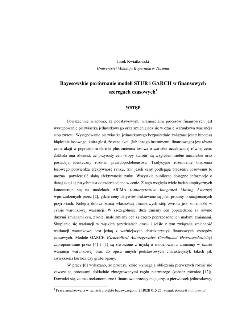 Jacek Kwiatkowski Uniwersytet Mikołaja Kopernika w Toruniu Bayesowskie porównanie modeli STUR i GARCH w finansowych szeregach czasowych1 WSTĘP Powszechnie wiadomo, że podstawowymi własnościami procesów finansowych jest występowanie pierwiastka jednostkowego oraz zmieniająca się w czasie warunkowa wariancja stóp zwrotu. Występowanie pierwiastka jednostkowego bezpośrednio związane jest z hipotezą błądzenia losowego, która głosi, że cena akcji (lub innego instrumentu finansowego) jest równa cenie akcji w poprzednim okresie plus zmienna losowa o wartości oczekiwanej równej zero. Zakłada ona również, że przyrosty cen (stopy zwrotu) są względem siebie niezależne oraz posiadają identyczny rozkład prawdopodobieństwa. Tradycyjne rozumienie błądzenia losowego potwierdza efektywność rynku, tzn. jeżeli ceny podlegają błądzeniu losowemu to można potwierdzić słabą efektywność rynku. Wszystkie publiczne dostępne informacje o danej akcji są natychmiast odzwierciedlane w cenie. Z tego względu wiele badań empirycznych koncentruje się na modelach ARIMA (Autoregressive Integrated Moving Average) wprowadzonych przez [2], gdzie ceny aktywów traktowane są jako procesy o stacjonarnych przyrostach. Kolejną dobrze znaną własnością finansowych stóp zwrotu jest zmienność w czasie warunkowej wariancji. W szczególności duże zmiany cen poprzedzone są równie dużymi zmianami cen, z kolei małe zmiany cen są często poprzedzone ich małymi zmianami. Skupianie się wariancji w wąskich przedziałach czasu i ściśle z tym związana zmienność wariancji warunkowej jest jedną z ważniejszych charakterystyk finansowych szeregów czasowych. Modele GARCH (Generalized Autoregressive Conditional Heteroscedasticity) zaproponowane przez [4] i [1] są stworzone z myślą o modelowaniu zmiennej w czasie wariancji warunkowej oraz do opisu innych podstawowych charakterystyk takich jak zwiększona kurtoza czy grube ogony. W pracy [6] wykazano, że procesy, które wymagają obliczenia pierwszych różnic nie zawsze są procesami dokładnie zintegrowanymi rzędu pierwszego (zobacz również [12]). Dowodzi się, że makroekonomiczne i finansowe procesy mają często pierwiastek jednostkowy, 1 Praca zrealizowana w ramach projektu badawczego nr 2 H02B 015 25; e-mail: [email protected] Bayesowskie porównanie modeli STUR i GARCH… który nie jest stały lecz losowy. Losowy parametr jest traktowany jako proces stochastyczny, którego realizacje oscylują wokół jedynki. Najczęściej jest to proces autoregresyjny lub biały szum. To implikuje, że w długim okresie czasu tego typu proces jest stacjonarny lecz w krótkim okresie może być niestacjonarny, czy wręcz wybuchowy. Model ze zmieniającymi się w czasie parametrami, utworzony w celu opisania losowego pierwiastka jednostkowego określa się jako STUR (Stochastic Unit Root). Wydaje się, że ze względu na losowy w czasie parametr proces ten można zaklasyfikować do szerszej grupy modeli, mianowicie do modeli podwójnie stochastycznych [20]. Z punktu widzenia własności próbkowych wydaje się interesujące porównanie mocy wyjaśniającej modeli STUR i GARCH. Mianowicie, czy i w jakim stopniu modele STUR są w stanie lepiej niż modele GARCH opisać typowe własności procesów finansowych. Dobrym narzędziem służącym do realizacji wspomnianego celu jest wnioskowanie bayesowskie. Do podstawowych jego zalet można wymienić możliwość przedstawienia pełnego rozkładu każdej wielkości będącej przedmiotem zainteresowania (w przeciwieństwie do metod klasycznych, gdzie występuje ocena punktowa i związany z nią błąd standardowy) oraz stosunkowo łatwy wybór modelu poprzez obliczenie prawdopodobieństwa a posteriori obydwu modeli i odpowiadający im iloraz szans a posteriori. Układ artykułu jest następujący. W części pierwszej omówiono podstawowe własności modeli STUR i GARCH. W części drugiej przedstawiono w skrócie podstawy wnioskowania bayesowskiego wykorzystane dla potrzeb tego artykułu. W części trzeciej przedstawiono wyniki badań empirycznych, które dotyczą porównania mocy objaśniającej modeli STUR, GARCH oraz błądzenia przypadkowego dla wybranych finansowych szeregów czasowych. 1. MODELE STUR I GARCH Powszechnie uważa się, że ceny aktywów są procesami o stacjonarnych przyrostach, gdzie stopień integracji wynosi jeden. Standardowym modelem służącym do modelowania cen zarówno szeregów finansowych, jak i makroekonomicznych jest model ARIMA o stałych (niezmiennych w czasie) parametrach strukturalnych. Ostatnie badania w zakresie wnioskowania bayesowskiego [8] i [10] oraz wnioskowania klasycznego [13], [6], [19], [9], [16] wskazują, że procesy finansowe i makroekonomiczne posiadają pierwiastek, którego wartości mogą oscylować w czasie wokół jedynki. Modele opisujące wymienioną wcześniej zależności określane są jako STUR i zostały omówione w pracy [13] oraz [6]. Bieżący artykuł dotyczy modelu STUR, który zaproponowali [13]. Postać tego modelu jest wygodniejsza przy estymacji parametrów, a także jest on mniej kłopotliwy w obliczeniach numerycznych. Pomimo nieco różnej reprezentacji, wydaje się jednak, że obydwa modele posiadają podobną interpretację. Jacek Kwiatkowski Procesy typu STUR dla logarytmów cen yt = 100ln (Pt ) można zapisać w postaci ogólnej jako: y t = α t y t −1 + ε t , (1.1) αt = α0 + δt , δ0 = 0 i δt = ρδt −1 + ηt . (1.2) gdzie: Zakładając stacjonarność procesu autoregresyjnego opisanego równaniem (1.2) przyjmujemy, że współczynnik autokorelacji zawiera się w przedziale otwartym od -1 do 1. Dodatkowo przyjmuje się założenie o wzajemnej niezależności, gaussowskich procesów ( ) ( ) resztowych. Procesy εt ~ N 0, σ 2 i ηt ~ N 0, ω 2 są od siebie niezależne. Dla α0 = 1 i ω 2 = 0 , y t jest procesem błądzenia losowego, natomiast jeżeli α0 = 1 i ω 2 > 0 to mamy do czynienia z pro