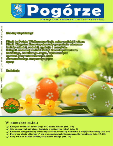 Pogórze Drodzy Czytelnicy! Niech te Święta Wielkanocne będą pełne nadziei i wiary. Niech Chrystus Zmartwychwstały przyniesie wiosenne kwiaty miłości, radości, spokoju i szczęścia. Pełnych radosnej nadziei Świąt Zmartwychwstania Pańskiego, rodzinnego ciepła, wymarzonych spotkań przy wielkanocnym stole oraz smacznego święconego jajka życzy Redakcja ISSN 1641 – 9006 Nr 2 (177) LUTY - MARZEC 2014 CENA: 2,50 ZŁ MIESIĘCZNIK SAMORZĄDOWY GMINY PLEŚNA TERMINARZ W numerze m.in.: Kolejne zadania i inwestycje w Gminie Pleśna (str. 2-3) Kto przeczytał najwięcej książek w ubiegłym roku? (str. 9) Konkurs fotograficzny związany z setną rocznicą wybuchu I wojny światowej (str. 16) Pierwsze akcje „Barbary” we wspomnieniach Eugeniusza Borowskiego (str. 17-18) Przy UKS-ie Pleśna formuje się nowa sekcja (str. 19) Co nowego w temacie gminnych inwestycji? W bieżącym roku kalendarzowym władze gminy w pierwszej kolejności koncentrują się na zadaniach priorytetowych przyjętych w obecnym budżecie. Jak wspomina wójt Stanisław Burnat: 2014 rok rozpoczynamy od przetargów, które dotyczą najważniejszych inwestycji, rozliczamy otrzymane środki zewnętrzne z lat 2007 – 2013, wykorzystując je jeszcze w bieżącym roku. Nadal odczuwa się skutki ostatnich klęsk żywiołowych, szczególnie w infrastrukturze drogowej. Gmina otrzymała kolejną transzę na naprawę lub odbudowę dróg zniszczonych i uszkodzonych wskutek pamiętnej powodzi. W ramach tych środków wykonany zostanie remont drogi Łowczówek – Piotrkowice za kwotę około 500 tys. zł. Prace związane z położeniem nowej nawierzchni asfaltowej już trwają. Dwie sztandarowe inwestycje, przewidziane już w ubiegłych latach, a zaplanowane na bieżący rok, dotyczą str. 2 budowy Centrum Pamięci Narodowej w Lichwinie i placu zabaw w Pleśnej. Po otrzymaniu sporego zastrzyku środków z Unii Europejskiej (działanie „Odnowa i Rozwój Wsi” Programu Rozwoju Obszarów Wiejskich na lata 2007 – 2014) udało się szybko przejść do działania. Centrum Pamięci stanie się jednocześnie zmodernizowanym centrum wsi Lichwin. Obecnie trwają tam prace budowlane. Zaplanowano budowę placu, na którym odbywać się będą uroczystości, ustawienie obelisków upamiętniających bohaterów wojennych oraz tablic informujących o cmentarzach zlokalizowanych na terenie gminy. Termin zakończenia prac i oddanie Centrum przewiduje się na czerwiec br. Koszt całej inwestycji – 1 mln złotych. Plac zabaw dla dzieci powstanie przy ośrodku sportowo – rekreacyjnym „Orlik” w Pleśnej. Została już podpisana umowa z wykonawcą prac budow- lanych. W ramach tego projektu powstaną: place zabaw dla dzieci w wieku od 1 – 8 lat oraz 7 – 14 lat, labirynt dla dzieci, zjeżdżalnia, siłownia na wolnym powietrzu oraz kącik fitness dla mam. Plac zabaw, jako inwestycja oszacowana na kwotę ok. 650 tys. zł., powstanie jeszcze w tym roku. Ww. obiekty oświetlane będą z wykorzystaniem lamp fotowoltaicznych. Jednym z głównych założeń obecnego samorządu są starania mające na celu likwidację tzw. „białych plam” na mapie skanalizowania gminy. I tak obecnie wykonywanych jest 8 przyłączy kanalizacyjnych na Gądówce za kwotę ok. 200 tys. złotych oraz 47 przyłączy w miejscowościach Rychwałd i Łowczówek w kwocie ok. 650 tys. zł. Obie te inwestycje dofinansowane są ze środków Unii Europejskiej w ramach PROW 2007 – 2013. dokończenie na str. 3. Pogórze • Nr 2(177) luty - marzec 2014 Dom Kultury w Janowicach po odnowie W ubiegłym roku dzięki środkom z Programu rozwoju Obszarów Wiejskich wykonano remont pomieszczeń Domu Kultury w Janowicach. W ramach prac odnowione zostały sala, kuchnia, pomieszczenia pomocnicze, pomieszczenia magazynowe, sanitariaty, osprzęt elektryczny. Zakupiono także wyposażenie do sali konferencyjnej (m.in. stoły, krzesła, projektor multimedialny, okablowanie, statywy mikrofonowe) i kuchni (m.in. chłodziarka, garnki, zmywarka, stoły, regały, filiżanki). Wszystkie zaplanowane do zakupu urządzenia będą wykorzystywane do przygotowywania posiłków na przedsięwzięcia organizowane przez mieszkańców wsi Janowice (np. kursy gotowania, zebrania wiejskie) oraz na uroczystości organizowane przez Centrum Kultury, Sportu i Promocji Gminy Pleśna, którego filią jest Dom Kultury w Janowicach (np. dożynki, imprezy lokalne, uroczystości patriotyczne). Dom Kultury będzie jednym z niewielu miejsc na terenie gminy, w którym znajdować się będzie profesjonalny sprzęt do organizacji przedsięwzięć ważnych dla mieszkańców miejscowości Janowice i mieszkańców gminy Pleśna. Inwestycja mogła zostać zrealizowana dzięki dofinansowaniu otrzymanemu z Unii dokończenie ze str. 2. W przyszłym miesiącu kończą się prace związane z budową boiska sportowego w Rzuchowej za kwotę ok. 640 tys. zł. Oddany do użytku obiekt służył będzie mieszkańcom wsi i całej gminy już tego lata. W sąsiedniej miejscowości – Świebodzinie, przy tamtejszej szkole podstawowej, wykonany zostanie remont boiska sportowego. Przetarg na to zadanie jest już rozstrzygnięty. Wybrano wykonawcę z Dąbrówki Tuchowskiej, który zobowiązał się zrealizować prace w cenie niespełna 108 tys. zł. W najbliższych dniach rozpoczną się prace związane z odwodnieniem osiedla w miejscowości Rzuchowa. Wykonany zostanie rów otwarty za kwotę ok. 130 tys. zł. W przypadku drobniejszych zadań warto wspomnieć o corocznych poprawkach i drobnych remontach nawierzchni dróg gminnych po zimie w ramach tzw. „remontu cząstkowego”. W szkole podstawowej w Janowicach wykonany zostanie remont wejścia do budynku. Także na ten rok w tejże placówce zaplanowano pierwszy etap termomodernizacji. Natomiast w Zespole Szkolno – Przedszkolnym w Rzuchowej zmodernizowane zostaną pomieszczenia sanitarne. Również szkoła podstawowa w Szczepanowicach otrzyma wsparcie – wkrótce ogłoszo