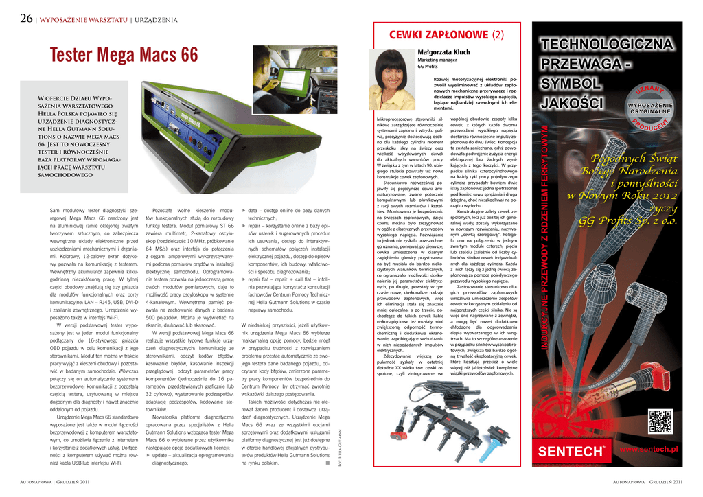 26 | WYPOSAŻENIE WARSZTATU | URZĄDZENIA CEWKI ZAPŁONOWE (2) Tester Mega Macs 66 Małgorzata Kluch Marketing manager GG Profits Rozwój motoryzacyjnej elektroniki pozwolił wyeliminować z układów zapłonowych mechaniczne przerywacze i rozdzielacze impulsów wysokiego napięcia, będące najbardziej zawodnymi ich elementami. W ofercie Działu Wypo sażenia Warsztatowego Hella Polska pojawiło się urządzenie diagnostycz ne Hella Gutmann Solu tions o nazwie mega macs 66. Jest to nowoczesny tester i równocześnie baza platformy wspomaga jącej pracę warsztatu samochodowego Pozostałe wolne kieszenie modu- regowej Mega Macs 66 osadzony jest łów funkcjonalnych służą do rozbudowy na aluminiowej ramie oklejonej trwałym funkcji testera. Moduł pomiarowy ST 66 data – dostęp online do bazy danych technicznych; repair – korzystanie online z bazy opi- tworzywem sztucznym, co zabezpiecza zawiera multimetr, 2-kanałowy oscylo- sów usterek i sugerowanych procedur wewnętrzne układy elektroniczne przed skop (rozdzielczość 10 MHz, próbkowanie ich usuwania, dostęp do interaktyw- uszkodzeniami mechanicznymi i drgania- 64 MS/s) oraz interfejs do połączenia nych schematów połączeń instalacji mi. Kolorowy, 12-calowy ekran dotyko- z cęgami amperowymi wykorzystywany- elektrycznej pojazdu, dostęp do opisów wy pozwala na komunikację z testerem. mi podczas pomiarów prądów w instalacji komponentów, ich budowy, właściwo- Wewnętrzny akumulator zapewnia kilku- elektrycznej samochodu. Oprogramowa- ści i sposobu diagnozowania; godzinną niezakłóconą pracę. W tylnej nie testera pozwala na jednoczesną pracę repair flat – repair + call flat – infoli- części obudowy znajdują się trzy gniazda dwóch modułów pomiarowych, daje to nia pozwalająca korzystać z konsultacji dla modułów funkcjonalnych oraz porty możliwość pracy oscyloskopu w systemie fachowców Centrum Pomocy Technicz- komunikacyjne: LAN – RJ45, USB, DVI-D 4-kanałowym. Wewnętrzna pamięć po- nej Hella Gutmann Solutions w czasie i zasilania zewnętrznego. Urządzenie wy- zwala na zachowanie danych z badania naprawy samochodu. posażono także w interfejs Wi-Fi. 500 pojazdów. Można je wyświetlać na W wersji podstawowej tester wypo- W niedalekiej przyszłości, jeżeli użytkow- ekranie, drukować lub skasować. sażony jest w jeden moduł funkcjonalny W wersji podstawowej Mega Macs 66 nik urządzenia Mega Macs 66 wybierze podłączany do 16-stykowego gniazda realizuje wszystkie typowe funkcje urzą- maksymalną opcję pomocy, będzie mógł OBD pojazdu w celu komunikacji z jego dzeń diagnostycznych: komunikację ze w przypadku trudności z rozwiązaniem sterownikami. Moduł ten można w trakcie sterownikami, błędów, problemu przesłać automatycznie ze swo- pracy wyjąć z kieszeni obudowy i pozosta- kasowanie błędów, kasowanie inspekcji jego testera dane badanego pojazdu, od- wić w badanym samochodzie. Wówczas przeglądowej, odczyt parametrów pracy czytane kody błędów, zmierzone parame- odczyt kodów połączy się on automatycznie systemem komponentów (jednocześnie do 16 pa- try pracy komponentów bezpośrednio do bezprzewodowej komunikacji z pozostałą rametrów przedstawianych graficznie lub Centrum Pomocy, by otrzymać zwrotnie wskazówki dalszego postępowania. częścią testera, usytuowaną w miejscu 32 cyfrowo), wysterowanie podzespołów, dogodnym dla diagnosty i nawet znacznie adaptację podzespołów, kodowanie ste- oddalonym od pojazdu. rowników. rował żaden producent i dostawca urzą- Nowatorska platforma diagnostyczna dzeń diagnostycznych. Urządzenie Mega wyposażone jest także w moduł łączności opracowana przez specjalistów z Hella Macs 66 wraz ze wszystkimi opcjami bezprzewodowej z komputerem warsztato- Gutmann Solutions wzbogaca tester Mega sprzętowymi oraz dodatkowymi usługami platformy diagnostycznej jest już dostępne wym, co umożliwia łączenie z Internetem Macs 66 o wybierane przez użytkownika i korzystanie z dodatkowych usług. Do łącz- następujące opcje dodatkowych licencji: w ofercie handlowej oficjalnych dystrybu- ności z komputerem używać można rów- update – aktualizacja oprogramowania torów produktów Hella Gutmann Solutions Autonaprawa | Grudzień 2011 diagnostycznego; Pogodnych Świąt Bożego Narodzenia i pomyślności w Nowym Roku 2012 życzy GG Profits Sp. z o.o. Takich możliwości dotychczas nie ofe- Urządzenie Mega Macs 66 standardowo nież kabla USB lub interfejsu Wi-Fi. wspólnej obudowie zespoły kilku cewek, z których każda dwoma przewodami wysokiego napięcia dostarcza równoczesne impulsy za płonowe do dwu świec. Koncepcja ta została zaniechana, gdyż powo dowała podwojenie zużycia energii elektrycznej bez żadnych wyni kających z tego korzyści. W przy padku silnika czterocylindrowego na każdy cykl pracy pojedynczego cylindra przypadały bowiem dwie iskry zapłonowe: jedna (potrzebna) pod koniec suwu sprężania i druga (zbędna, choć nieszkodliwa) na po czątku wydechu. Konstrukcyjne zalety cewek ze spolonych, lecz już bez tej ich gene ralnej wady, zostały wykorzystane w nowszym rozwiązaniu, nazywa nym „cewką szeregową”. Polega ło ono na połączeniu w jednym zwartym module czterech, pięciu lub sześciu (zależnie od liczby cy lindrów silnika) cewek indywidual nych dla każdego cylindra. Każda z nich łączy się z jedną świecą za płonową za pomocą pojedynczego przewodu wysokiego napięcia. Zastosowanie stosunkowo długich przewodów zapłonowych umożliwia umieszczenie zespołów cewek w korzystnym oddaleniu od najgorętszych części silnika. Nie są więc one nagrzewane z zewnątrz, a mogą być nawet dodatkowo chłodzone dla odprowadzania ciepła wytwarzanego w ich wnę trzach. Ma to szczególne znaczenie w przypadku silników wysokoobro towych, zwiększa też bardzo ogól ną trwałość eksploatacyjną cewek, które kosztują przecież o wiele więcej niż jakiekolwiek k