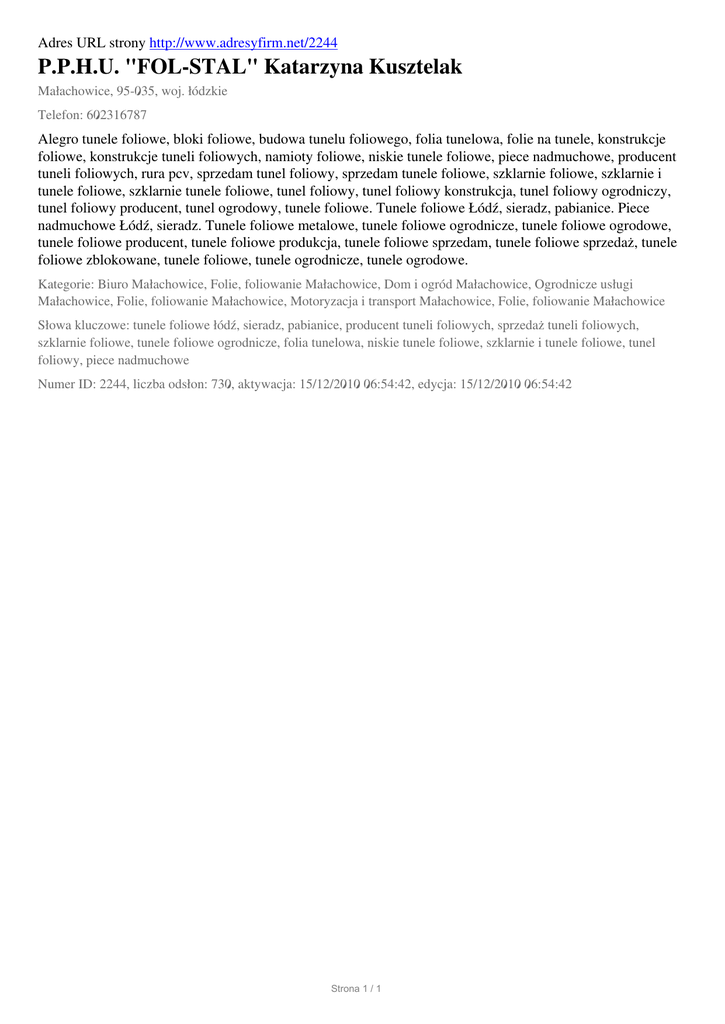 Adres URL strony http://www.adresyfirm.net/2244 P.P.H.U. "FOL-STAL" Katarzyna Kusztelak Małachowice, 95-035, woj. łódzkie Telefon: 602316787 Alegro tunele foliowe, bloki foliowe, budowa tunelu foliowego, folia tunelowa, folie na tunele, konstrukcje foliowe, konstrukcje tuneli foliowych, namioty foliowe, niskie tunele foliowe, piece nadmuchowe, producent tuneli foliowych, rura pcv, sprzedam tunel foliowy, sprzedam tunele foliowe, szklarnie foliowe, szklarnie i tunele foliowe, szklarnie tunele foliowe, tunel foliowy, tunel foliowy konstrukcja, tunel foliowy ogrodniczy, tunel foliowy producent, tunel ogrodowy, tunele foliowe. Tunele foliowe Łódź, sieradz, pabianice. Piece nadmuchowe Łódź, sieradz. Tunele foliowe metalowe, tunele foliowe ogrodnicze, tunele foliowe ogrodowe, tunele foliowe producent, tunele foliowe produkcja, tunele foliowe sprzedam, tunele foliowe sprzedaż, tunele foliowe zblokowane, tunele foliowe, tunele ogrodnicze, tunele ogrodowe. Kategorie: Biuro Małachowice, Folie, foliowanie Małachowice, Dom i ogród Małachowice, Ogrodnicze usługi Małachowice, Folie, foliowanie Małachowice, Motoryzacja i transport Małachowice, Folie, foliowanie Małachowice Słowa kluczowe: tunele foliowe łódź, sieradz, pabianice, producent tuneli foliowych, sprzedaż tuneli foliowych, szklarnie foliowe, tunele foliowe ogrodnicze, folia tunelowa, niskie tunele foliowe, szklarnie i tunele foliowe, tunel foliowy, piece nadmuchowe Numer ID: 2244, liczba odsłon: 730, aktywacja: 15/12/2010 06:54:42, edycja: 15/12/2010 06:54:42 Strona 1 / 1