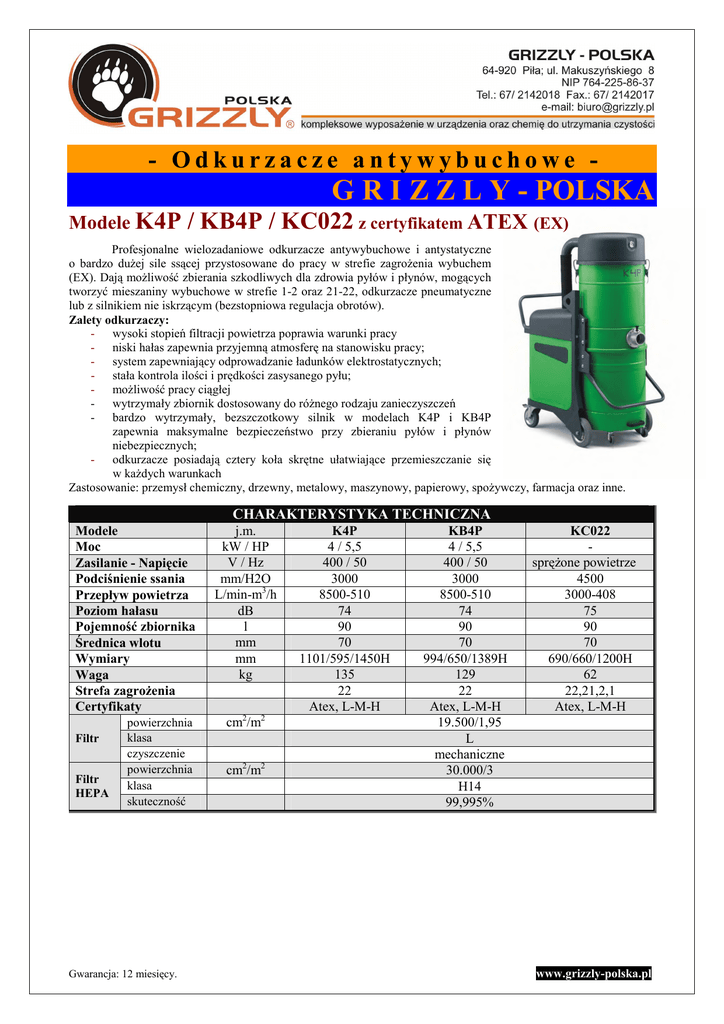 - Odkurzacze antywybuchowe - G R I Z Z L Y - POLSKA Modele K4P / KB4P / KC022 z certyfikatem ATEX (EX) Profesjonalne wielozadaniowe odkurzacze antywybuchowe i antystatyczne o bardzo duŜej sile ssącej przystosowane do pracy w strefie zagroŜenia wybuchem (EX). Dają moŜliwość zbierania szkodliwych dla zdrowia pyłów i płynów, mogących tworzyć mieszaniny wybuchowe w strefie 1-2 oraz 21-22, odkurzacze pneumatyczne lub z silnikiem nie iskrzącym (bezstopniowa regulacja obrotów). Zalety odkurzaczy: - wysoki stopień filtracji powietrza poprawia warunki pracy - niski hałas zapewnia przyjemną atmosferę na stanowisku pracy; - system zapewniający odprowadzanie ładunków elektrostatycznych; - stała kontrola ilości i prędkości zasysanego pyłu; - moŜliwość pracy ciągłej - wytrzymały zbiornik dostosowany do róŜnego rodzaju zanieczyszczeń - bardzo wytrzymały, bezszczotkowy silnik w modelach K4P i KB4P zapewnia maksymalne bezpieczeństwo przy zbieraniu pyłów i płynów niebezpiecznych; - odkurzacze posiadają cztery koła skrętne ułatwiające przemieszczanie się w kaŜdych warunkach Zastosowanie: przemysł chemiczny, drzewny, metalowy, maszynowy, papierowy, spoŜywczy, farmacja oraz inne. CHARAKTERYSTYKA TECHNICZNA Modele Moc Zasilanie - Napięcie Podciśnienie ssania Przepływ powietrza Poziom hałasu Pojemność zbiornika Średnica wlotu Wymiary Waga Strefa zagroŜenia Certyfikaty Filtr Filtr HEPA powierzchnia klasa czyszczenie powierzchnia klasa skuteczność Gwarancja: 12 miesięcy. j.m. kW / HP V / Hz mm/H2O L/min-m3/h dB l mm mm kg cm2/m2 cm2/m2 K4P 4 / 5,5 400 / 50 3000 8500-510 74 90 70 1101/595/1450H 135 22 Atex, L-M-H KB4P 4 / 5,5 400 / 50 3000 8500-510 74 90 70 994/650/1389H 129 22 Atex, L-M-H 19.500/1,95 L mechaniczne 30.000/3 H14 99,995% KC022 spręŜone powietrze 4500 3000-408 75 90 70 690/660/1200H 62 22,21,2,1 Atex, L-M-H www.grizzly-polska.pl Model K4P Model KB4P Model KC022 Ciche, mocne, efektywne, 3-fazowe, dźwiękoszczelne, bardzo stabilne. Wysoki przepływ powietrza pozwala im na uŜycie węŜa o duŜej średnicy. Efektywna filtracja: higieniczny filtr o duŜej powierzchni jest bardzo efektywny przez długi czas, a czyszczenie filtra odbywa się automatycznie. Zbiornik 90 litrowy posiada system łatwego i szybkiego usuwania wody. DOSTĘPNE OPCJE • 001 AISI 304 zbiornik ze stali nierdzewnej (pomalowany) • 002 AISI 304 zbiornik ze stali nierdzewnej i komora filtracyjna • 004 wyłącznik płynów • • • 005 filtr HEPA 006 elektryczne czyszczenie filtra + przycisk 008 automatyczne czyszczenie filtra DOSTĘPNE MODELE POSIADAJĄ ATESTY: • ATEX – do pracy w środowisku łatwopalnym oraz w otoczeniu substancji łatwopalnych • L-M-H - do odkurzania toksycznych substancji Gwarancja: 12 miesięcy. www.grizzly-polska.pl