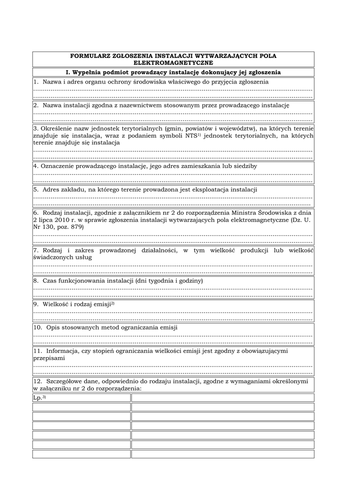 FORMULARZ ZGŁOSZENIA INSTALACJI WYTWARZAJĄCYCH POLA ELEKTROMAGNETYCZNE I. Wypełnia podmiot prowadzący instalację dokonujący jej zgłoszenia 1. Nazwa i adres organu ochrony środowiska właściwego do przyjęcia zgłoszenia .................................................................................................................................................. .................................................................................................................................................. 2. Nazwa instalacji zgodna z nazewnictwem stosowanym przez prowadzącego instalację .................................................................................................................................................. .................................................................................................................................................. 3. Określenie nazw jednostek terytorialnych (gmin, powiatów i województw), na których terenie znajduje się instalacja, wraz z podaniem symboli NTS1) jednostek terytorialnych, na których terenie znajduje się instalacja .................................................................................................................................................. .................................................................................................................................................. 4. Oznaczenie prowadzącego instalację, jego adres zamieszkania lub siedziby .................................................................................................................................................. .................................................................................................................................................. 5. Adres zakładu, na którego terenie prowadzona jest eksploatacja instalacji .................................................................................................................................................. ................................................................................................................................................. 6. Rodzaj instalacji, zgodnie z załącznikiem nr 2 do rozporządzenia Ministra Środowiska z dnia 2 lipca 2010 r. w sprawie zgłoszenia instalacji wytwarzających pola elektromagnetyczne (Dz. U. Nr 130, poz. 879) .................................................................................................................................................. .................................................................................................................................................. 7. Rodzaj i zakres prowadzonej działalności, w tym wielkość produkcji lub wielkość świadczonych usług .................................................................................................................................................. .................................................................................................................................................. 8. Czas funkcjonowania instalacji (dni tygodnia i godziny) .................................................................................................................................................. .................................................................................................................................................. 9. Wielkość i rodzaj emisji2) .................................................................................................................................................. .................................................................................................................................................. 10. Opis stosowanych metod ograniczania emisji .................................................................................................................................................. .................................................................................................................................................. 11. Informacja, czy stopień ograniczania wielkości emisji jest zgodny z obowiązującymi przepisami .................................................................................................................................................. .................................................................................................................................................. 12. Szczegółowe dane, odpowiednio do rodzaju instalacji, zgodne z wymaganiami określonymi w załączniku nr 2 do rozporządzenia: Lp.3) 13. Miejscowość, data (rok – miesiąc – dzień): Imię i nazwisko osoby reprezentującej prowadzącego instalację: Podpis II. Wypełnia organ ochrony środowiska przyjmujący zgłoszenie Numer zgłoszenia Data zarejestrowania zgłoszenia .......................................................................................... ....................................................... ………………………………………………………………………….. ....................................................... …………………………………………………………………………. ……………………………………………. …………………………………………………………………………. Objaśnienia: 1) Symbole Nomenklatury Jednostek Terytorialnych do Celów Statystycznych należy podawać zgodnie z rozporządzeniem Rady Ministrów z dnia 14 listopada 2007 r. w sprawie wprowadzenia Nomenklatury Jednostek Terytorialnych do Celów Statystycznych (NTS) (Dz. U. Nr 214, poz. 1573, z późn. zm.). 2) W przypadku stacji elektroenergetycznych i napowietrznych linii elektroenergetycznych – napięcie znamionowe, a w przypadku pozostałych instalacji – równoważne moce promieniowane izotropowo (EIRP) poszczególnych anten. 3) Liczba porządkowa zgodna z numeracją punktów w odpowiednich d