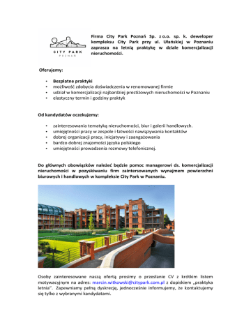 Oferujemy: • • • • Firma City Park Poznań Sp. z o.o. sp. k. deweloper kompleksu City Park przy ul. Ułańskiej w Poznaniu zaprasza na letnią praktykę w dziale komercjalizacji nieruchomości. Bezplatne praktyki możliwość zdobycia doświadczenia w renomowanej firmie udział w komercjalizacji najbardziej prestiżowych nieruchomości w Poznaniu elastyczny termin i godziny praktyk Od kandydatów oczekujemy: • • • • • zainteresowania tematyką nieruchomości, biur i galerii handlowych. umiejętności pracy w zespole i łatwości nawiązywania kontaktów dobrej organizacji pracy, inicjatywy i zaangażowania bardzo dobrej znajomości języka polskiego umiejętności prowadzenia rozmowy telefonicznej. Do głównych obowiązków należeć będzie pomoc managerowi ds. komercjalizacji nieruchomości w pozyskiwaniu firm zaintersowanych wynajmem powierzchni biurowych i handlowych w kompleksie City Park w Poznaniu. Osoby zainteresowane naszą ofertą prosimy o przesłanie CV z krótkim listem motywacyjnym na adres: [email protected] z dopiskiem „praktyka letnia”. Zapewniamy pełną dyskrecję, jednocześnie informujemy, że kontaktujemy się tylko z wybranymi kandydatami.