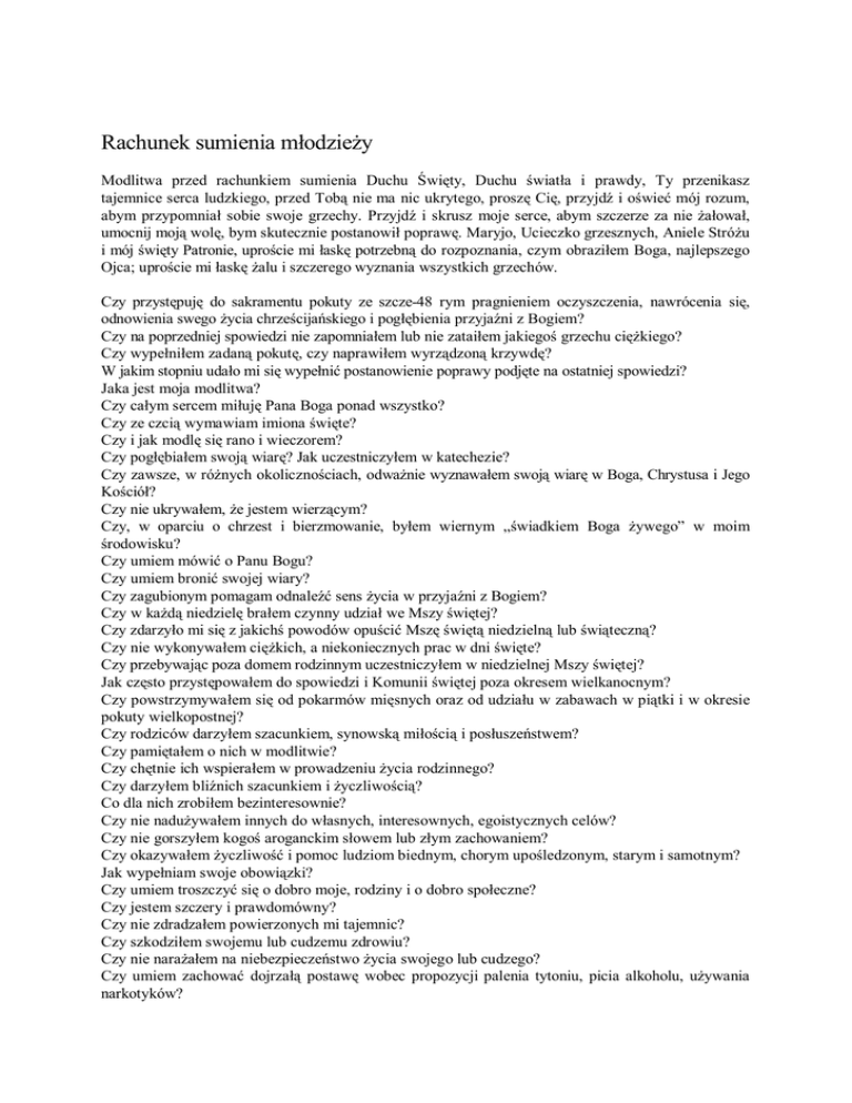 Rachunek sumienia młodzieży Modlitwa przed rachunkiem sumienia Duchu Święty, Duchu światła i prawdy, Ty przenikasz tajemnice serca ludzkiego, przed Tobą nie ma nic ukrytego, proszę Cię, przyjdź i oświeć mój rozum, abym przypomniał sobie swoje grzechy. Przyjdź i skrusz moje serce, abym szczerze za nie żałował, umocnij moją wolę, bym skutecznie postanowił poprawę. Maryjo, Ucieczko grzesznych, Aniele Stróżu i mój święty Patronie, uproście mi łaskę potrzebną do rozpoznania, czym obraziłem Boga, najlepszego Ojca; uproście mi łaskę żalu i szczerego wyznania wszystkich grzechów. Czy przystępuję do sakramentu pokuty ze szcze-48 rym pragnieniem oczyszczenia, nawrócenia się, odnowienia swego życia chrześcijańskiego i pogłębienia przyjaźni z Bogiem? Czy na poprzedniej spowiedzi nie zapomniałem lub nie zataiłem jakiegoś grzechu ciężkiego? Czy wypełniłem zadaną pokutę, czy naprawiłem wyrządzoną krzywdę? W jakim stopniu udało mi się wypełnić postanowienie poprawy podjęte na ostatniej spowiedzi? Jaka jest moja modlitwa? Czy całym sercem miłuję Pana Boga ponad wszystko? Czy ze czcią wymawiam imiona święte? Czy i jak modlę się rano i wieczorem? Czy pogłębiałem swoją wiarę? Jak uczestniczyłem w katechezie? Czy zawsze, w różnych okolicznościach, odważnie wyznawałem swoją wiarę w Boga, Chrystusa i Jego Kościół? Czy nie ukrywałem, że jestem wierzącym? Czy, w oparciu o chrzest i bierzmowanie, byłem wiernym „świadkiem Boga żywego” w moim środowisku? Czy umiem mówić o Panu Bogu? Czy umiem bronić swojej wiary? Czy zagubionym pomagam odnaleźć sens życia w przyjaźni z Bogiem? Czy w każdą niedzielę brałem czynny udział we Mszy świętej? Czy zdarzyło mi się z jakichś powodów opuścić Mszę świętą niedzielną lub świąteczną? Czy nie wykonywałem ciężkich, a niekoniecznych prac w dni święte? Czy przebywając poza domem rodzinnym uczestniczyłem w niedzielnej Mszy świętej? Jak często przystępowałem do spowiedzi i Komunii świętej poza okresem wielkanocnym? Czy powstrzymywałem się od pokarmów mięsnych oraz od udziału w zabawach w piątki i w okresie pokuty wielkopostnej? Czy rodziców darzyłem szacunkiem, synowską miłością i posłuszeństwem? Czy pamiętałem o nich w modlitwie? Czy chętnie ich wspierałem w prowadzeniu życia rodzinnego? Czy darzyłem bliźnich szacunkiem i życzliwością? Co dla nich zrobiłem bezinteresownie? Czy nie nadużywałem innych do własnych, interesownych, egoistycznych celów? Czy nie gorszyłem kogoś aroganckim słowem lub złym zachowaniem? Czy okazywałem życzliwość i pomoc ludziom biednym, chorym upośledzonym, starym i samotnym? Jak wypełniam swoje obowiązki? Czy umiem troszczyć się o dobro moje, rodziny i o dobro społeczne? Czy jestem szczery i prawdomówny? Czy nie zdradzałem powierzonych mi tajemnic? Czy szkodziłem swojemu lub cudzemu zdrowiu? Czy nie narażałem na niebezpieczeństwo życia swojego lub cudzego? Czy umiem zachować dojrzałą postawę wobec propozycji palenia tytoniu, picia alkoholu, używania narkotyków? Czy umiem sobie odmówić przyjemności? Czy nie żywiłem do kogoś nienawiści? Czy idąc za Chrystusowym wezwaniem, jestem gotów przebaczyć wyrządzoną mi krzywdę? Czy nie chowałem w sercu urazy, niechęci, nienawiści? Czy pamiętam o godności ludzkiego ciała, że jest ono świątynią Ducha Świętego oraz że jest przeznaczone do zmartwychwstania i chwały? Czy strzegłem swoich zmysłów i czy zachowałem ciało w skromności i czystości? Czy nie poniżałem swojej godności dziecka Bożego przez nieczystość w myślach, pragnieniach, słowach i uczynkach? Czy dopuściłem się uczynku nieczystego w samotności lub z inną osobą? Czy chciałbym w dniu ślubu złożyć w darze swemu współmałżonkowi taki charakter, jaki mam teraz? Czy brakiem skromności i wstydliwości nie pobudzałem innych do grzechu? Czy chciałbym, aby cechy mojego charakteru w przyszłości powtórzyły moje dzieci? Jak osądziłbym kolegę, który niegodnie potraktował moją siostrę lub drogą mi dziewczynę? Czy dostrzegam w każdej koleżance jej wielką godność kobiety, przyszłej matki? Czy pomagam jej, by była radosna, szczęśliwa, zawsze żyjąca w przyjaźni z Bogiem? Czy w każdym koledze dostrzegam przyszłego ojca? Co robię, aby on był lepszy i bliższy Bogu i by w przyszłości lepiej wypełniał swoje zadania życiowe? Czy modlę się za swych kolegów i koleżanki? Czy pracuję nad sobą? Czy po spowiedzi staję się lepszy? Jak wykorzystuję czas? Czy jestem sprawiedliwy? Czy szanuję cudzą pracę i cudzą własność? Co powinienem uczynić, by opanować moją wadę główną, by zwalczyć często powtarzający się grzech? Co zrobię, aby być blisko Chrystusa, aby być wolnym i radosnym?