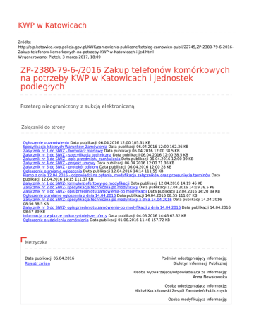 KWP w Katowicach Źródło: http://bip.katowice.kwp.policja.gov.pl/KWK/zamowienia-publiczne/katalog-zamowien-publi/22745,ZP-2380-79-6-2016Zakup-telefonow-komorkowych-na-potrzeby-KWP-w-Katowicach-i-jed.html Wygenerowano: Piątek, 3 marca 2017, 18:09 ZP-2380-79-6-/2016 Zakup telefonów komórkowych na potrzeby KWP w Katowicach i jednostek podległych Przetarg nieograniczony z aukcją elektroniczną Załączniki do strony Ogłoszenie o zamówieniu Data publikacji 06.04.2016 12:00 105.61 KB Specyfikacja Istotnych Warunków Zamówienia Data publikacji 06.04.2016 12:00 162.36 KB Załącznik nr 1 do SIWZ - formularz ofertowy Data publikacji 06.04.2016 12:00 38.5 KB Załącznik nr 2 do SIWZ - specyfikacja techniczna Data publikacji 06.04.2016 12:00 38.5 KB Załącznik nr 3 do SIWZ - opis przedmiotu zamówienia Data publikacji 06.04.2016 12:00 39 KB Załącznik nr 4 do SIWZ - projekt umowy Data publikacji 06.04.2016 12:00 71.36 KB Załącznik nr 5 do SIWZ - protokół odbioru Data publikacji 06.04.2016 12:00 28 KB Ogłoszenie o zmianie ogłoszenia Data publikacji 12.04.2016 14:14 111.55 KB Pismo z dnia 12.04.2016 - odpowiedzi na pytania, modyfikacja załączników oraz przesunięcie terminów Data publikacji 12.04.2016 14:15 111.37 KB Załącznik nr 1 do SIWZ- formularz ofertowy-po modyfikacji Data publikacji 12.04.2016 14:19 46 KB Załącznik nr 2 do SIWZ- specyfikacja techniczna-po modyfikacji Data publikacji 12.04.2016 14:19 38.5 KB Załącznik nr 3 do SIWZ- opis przedmiotu zamówienia-po modyfikacji Data publikacji 12.04.2016 14:20 39 KB Ogłoszenie o zmianie ogłoszenia z dnia 14.04.2016 Data publikacji 14.04.2016 08:55 111.07 KB Załącznik nr 2 do SIWZ- specyfikacja techniczna-po modyfikacji z dnia 14.04.2016 Data publikacji 14.04.2016 08:56 38.5 KB Załącznik nr 3 do SIWZ- opis przedmiotu zamówienia-po modyfikacji z dnia 14.04.2016 Data publikacji 14.04.2016 08:57 39 KB Informacja o wyborze najkorzystniejszej oferty Data publikacji 04.05.2016 14:45 63.52 KB Ogłoszenie o udzieleniu zamówienia Data publikacji 01.06.2016 11:46 157.72 KB Metryczka Data publikacji 06.04.2016 Rejestr zmian Podmiot udostępniający informację: Biuletyn Informacji Publicznej Osoba wytwarzająca/odpowiadająca za informację: Anna Nowakowska Osoba udostępniająca informację: Michał Kociołkowski Zespół Zamówień Publicznych Osoba modyfikująca informację: