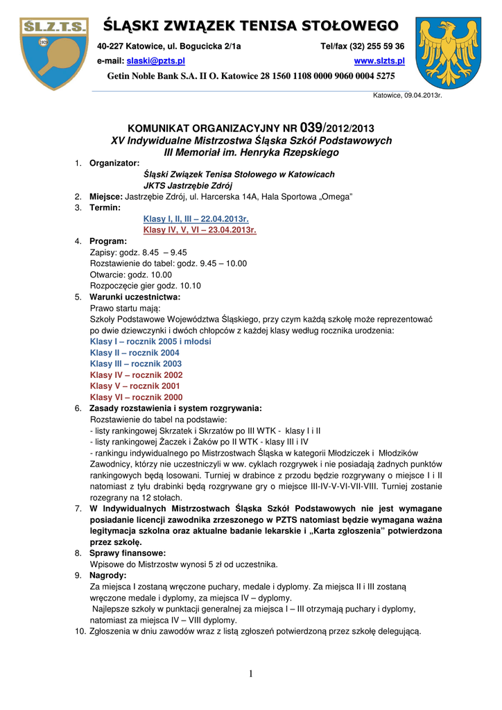 ŚLĄSKI ZWIĄZEK TENISA STOŁOWEGO 40-227 Katowice, ul. Bogucicka 2/1a Tel/fax (32) 255 59 36 e-mail: [email protected] www.slzts.pl Getin Noble Bank S.A. II O. Katowice 28 1560 1108 0000 9060 0004 5275 Katowice, 09.04.2013r. KOMUNIKAT ORGANIZACYJNY NR 039/2012/2013 XV Indywidualne Mistrzostwa Śląska Szkół Podstawowych III Memoriał im. Henryka Rzepskiego 1. Organizator: 2. 3. 4. 5. 6. 7. 8. 9. 10. Śląski Związek Tenisa Stołowego w Katowicach JKTS Jastrzębie Zdrój Miejsce: Jastrzębie Zdrój, ul. Harcerska 14A, Hala Sportowa „Omega” Termin: Klasy I, II, III – 22.04.2013r. Klasy IV, V, VI – 23.04.2013r. Program: Zapisy: godz. 8.45 – 9.45 Rozstawienie do tabel: godz. 9.45 – 10.00 Otwarcie: godz. 10.00 Rozpoczęcie gier godz. 10.10 Warunki uczestnictwa: Prawo startu mają: Szkoły Podstawowe Województwa Śląskiego, przy czym każdą szkołę może reprezentować po dwie dziewczynki i dwóch chłopców z każdej klasy według rocznika urodzenia: Klasy I – rocznik 2005 i młodsi Klasy II – rocznik 2004 Klasy III – rocznik 2003 Klasy IV – rocznik 2002 Klasy V – rocznik 2001 Klasy VI – rocznik 2000 Zasady rozstawienia i system rozgrywania: Rozstawienie do tabel na podstawie: - listy rankingowej Skrzatek i Skrzatów po III WTK - klasy I i II - listy rankingowej Żaczek i Żaków po II WTK - klasy III i IV - rankingu indywidualnego po Mistrzostwach Śląska w kategorii Młodziczek i Młodzików Zawodnicy, którzy nie uczestniczyli w ww. cyklach rozgrywek i nie posiadają żadnych punktów rankingowych będą losowani. Turniej w drabince z przodu będzie rozgrywany o miejsce I i II natomiast z tyłu drabinki będą rozgrywane gry o miejsce III-IV-V-VI-VII-VIII. Turniej zostanie rozegrany na 12 stołach. W Indywidualnych Mistrzostwach Śląska Szkół Podstawowych nie jest wymagane posiadanie licencji zawodnika zrzeszonego w PZTS natomiast będzie wymagana ważna legitymacja szkolna oraz aktualne badanie lekarskie i „Karta zgłoszenia” potwierdzona przez szkołę. Sprawy finansowe: Wpisowe do Mistrzostw wynosi 5 zł od uczestnika. Nagrody: Za miejsca I zostaną wręczone puchary, medale i dyplomy. Za miejsca II i III zostaną wręczone medale i dyplomy, za miejsca IV – dyplomy. Najlepsze szkoły w punktacji generalnej za miejsca I – III otrzymają puchary i dyplomy, natomiast za miejsca IV – VIII dyplomy. Zgłoszenia w dniu zawodów wraz z listą zgłoszeń potwierdzoną przez szkołę delegującą. 1 Regulamin XV Indywidualnych Mistrzostw Śląska Szkół Podstawowych 1. Uczestnictwo W Mistrzostwach prawo startu mają szkoły podstawowe Województwa Śląskiego. Każda szkoła może być reprezentowana przez dwie dziewczynki i dwóch chłopców z każdej klasy według niżej wymienionych roczników urodzenia: Klasy I - rocznik 2005 i młodsi Klasy II - rocznik 2004 Klasy III - rocznik 2003 Klasy IV - rocznik 2002 Klasy V - rocznik 2001 Klasy VI - rocznik 2000 Reprezentacja szkoły może się składać maksymalnie z 12 dziewczynek i 12 chłopców. Uczestnicy zobowiązani są do posiadania ważnych legitymacji szkolnych oraz aktualnie ważnych badań lekarskich zezwalających na udział w zawodach. 2. Zasady rozstawiania i system rozgrywania Rozstawienie do tabel na podstawie: - aktualnej listy rankingowej skrzatów i skrzatek w klasach I i II - aktualnej listy rankingowej żaków i żaczek w klasach III i IV - aktualnej listy rankingowej w kategorii młodzików i młodziczek – klasy V i VI Zawodnicy i zawodniczki, którzy nie uczestniczyli w cyklu rozgrywek WTK i nie posiadają żadnych punktów rankingowych będą losowani. Turniej w drabince z przodu będzie rozgrywany o miejsce 1, 2, natomiast z tyłu drabinki będą rozgrywane gry o miejsca 3, 4, 5, 6, 7, 8, 9-12, 13-16, 17-24, 25-32 itd. Zawodnicy i zawodniczki z tej samej szkoły będą rozstawieni do dwóch różnych połówek drabinki turniejowej 3. Zgłoszenia W dniu zawodów na podstawie listy zgłoszeń, potwierdzonej przez szkołę delegującą 4. Sprawy finansowe Wpisowe do Mistrzostw wynosi 5,00 zł od uczestnika 5. Nagrody Za miejsca I zostaną wręczone puchary, medale i dyplomy. Za miejsca II i III zostaną wręczone medale i dyplomy, za miejsca IV – dyplomy. Najlepsze szkoły w punktacji generalnej za miejsca I – III otrzymają puchary i dyplomy, natomiast za miejsca IV – VIII dyplomy. 6. Punktacja 2 Miejsce 1 2 3 4 5 6 7 8 9-12 13-16 17-24 25-32 33-48 49-64 65-96 Pkt. 50 47 44 42 40 38 36 34 30 22 14 6 4 2 1 Opracował: Stanisław Juniewicz Dyrektor Organizacyjny Śl.Z.T.S. /-/Jan Kaczyński 3