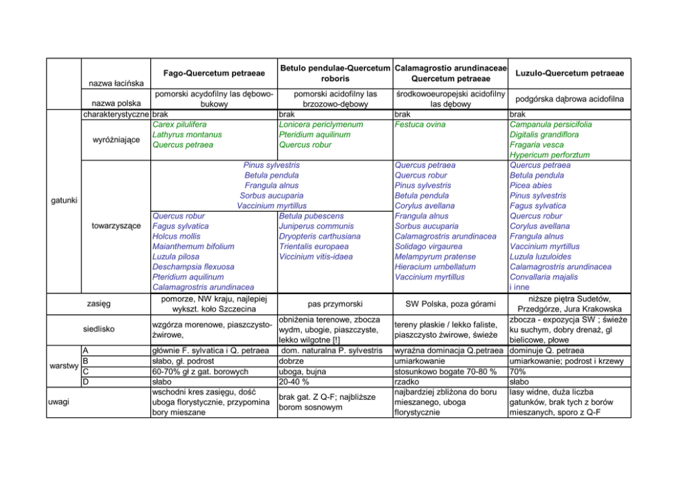 Fago-Quercetum petraeae nazwa łacińska pomorski acydofilny las dębowonazwa polska bukowy charakterystyczne brak Carex pilulifera Lathyrus montanus wyróŜniające Quercus petraea gatunki towarzyszące zasięg siedlisko A B warstwy C D uwagi Betulo pendulae-Quercetum Calamagrostio arundinaceaeLuzulo-Quercetum petraeae roboris Quercetum petraeae pomorski acidofilny las brzozowo-dębowy brak Lonicera periclymenum Pteridium aquilinum Quercus robur Pinus sylvestris Betula pendula Frangula alnus Sorbus aucuparia Vaccinium myrtillus Quercus robur Betula pubescens Fagus sylvatica Juniperus communis Holcus mollis Dryopteris carthusiana Maianthemum bifolium Trientalis europaea Luzula pilosa Viccinium vitis-idaea Deschampsia flexuosa Pteridium aquilinum Calamagrostris arundinacea pomorze, NW kraju, najlepiej pas przymorski wykszt. koło Szczecina obniŜenia terenowe, zbocza wzgórza morenowe, piaszczystowydm, ubogie, piaszczyste, Ŝwirowe, lekko wilgotne [!] głównie F. sylvatica i Q. petraea dom. naturalna P. sylvestris słabo, gł. podrost dobrze 60-70% gł z gat. borowych uboga, bujna słabo 20-40 % wschodni kres zasięgu, dość brak gat. Z Q-F; najbliŜsze uboga florystycznie, przypomina borom sosnowym bory mieszane środkowoeuropejski acidofilny podgórska dąbrowa acidofilna las dębowy brak brak Festuca ovina Campanula persicifolia Digitalis grandiflora Fragaria vesca Hypericum perforztum Quercus petraea Quercus petraea Quercus robur Betula pendula Pinus sylvestris Picea abies Betula pendula Pinus sylvestris Corylus avellana Fagus sylvatica Frangula alnus Quercus robur Sorbus aucuparia Corylus avellana Calamagrostris arundinacea Frangula alnus Solidago virgaurea Vaccinium myrtillus Melampyrum pratense Luzula luzuloides Hieracium umbellatum Calamagrostris arundinacea Vaccinium myrtillus Convallaria majalis i inne niŜsze piętra Sudetów, SW Polska, poza górami Przedgórze, Jura Krakowska zbocza - expozycja SW ; świeŜe tereny płaskie / lekko faliste, ku suchym, dobry drenaŜ, gl piaszczysto Ŝwirowe, świeŜe bielicowe, płowe wyraźna dominacja Q.petraea dominuje Q. petraea umiarkowanie umiarkowanie; podrost i krzewy stosunkowo bogate 70-80 % 70% rzadko słabo najbardziej zbliŜona do boru lasy widne, duŜa liczba mieszanego, uboga gatunków, brak tych z borów florystycznie mieszanych, sporo z Q-F