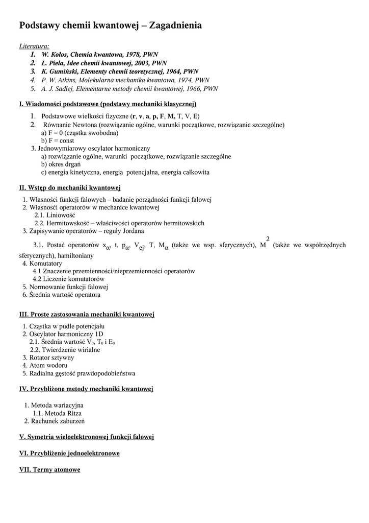 Podstawy chemii kwantowej – Zagadnienia Literatura: 1. W. Kołos, Chemia kwantowa, 1978, PWN 2. L. Piela, Idee chemii kwantowej, 2003, PWN 3. K. Gumiński, Elementy chemii teoretycznej, 1964, PWN 4. P. W. Atkins, Molekularna mechanika kwantowa, 1974, PWN 5. A. J. Sadlej, Elementarne metody chemii kwantowej, 1966, PWN I. Wiadomości podstawowe (podstawy mechaniki klasycznej) 1. Podstawowe wielkości fizyczne (r, v, a, p, F, M, T, V, E) 2. Równanie Newtona (rozwiązanie ogólne, warunki początkowe, rozwiązanie szczególne) a) F = 0 (cząstka swobodna) b) F = const 3. Jednowymiarowy oscylator harmoniczny a) rozwiązanie ogólne, warunki początkowe, rozwiązanie szczególne b) okres drgań c) energia kinetyczna, energia potencjalna, energia całkowita II. Wstęp do mechaniki kwantowej 1. Własności funkcji falowych – badanie porządności funkcji falowej 2. Własnosći operatorów w mechanice kwantowej 2.1. Liniowość 2.2. Hermitowskość – właściwości operatorów hermitowskich 3. Zapisywanie operatorów – reguły Jordana 3.1. Postać operatorów xα, t, pα, Vej, T, Mα (także we wsp. sferycznych), M sferycznych), hamiltoniany 4. Komutatory 4.1 Znaczenie przemienności/nieprzemienności operatorów 4.2 Liczenie komutatorów 5. Normowanie funkcji falowej 6. Średnia wartość operatora III. Proste zastosowania mechaniki kwantowej 1. Cząstka w pudle potencjału 2. Oscylator harmoniczny 1D 2.1. Średnia wartość V0, T0 i E0 2.2. Twierdzenie wirialne 3. Rotator sztywny 4. Atom wodoru 5. Radialna gęstość prawdopodobieństwa IV. Przybliżone metody mechaniki kwantowej 1. Metoda wariacyjna 1.1. Metoda Ritza 2. Rachunek zaburzeń V. Symetria wieloelektronowej funkcji falowej VI. Przybliżenie jednoelektronowe VII. Termy atomowe 2 (także we współrzędnych
