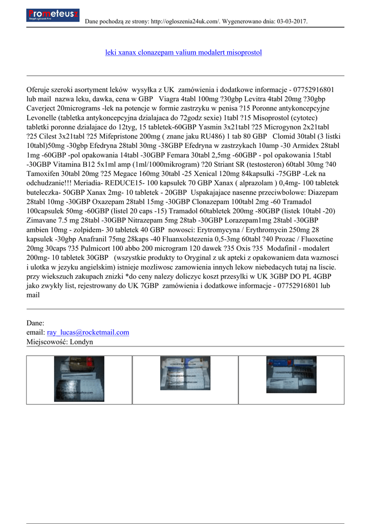 Dane pochodzą ze strony: http://ogloszenia24uk.com/. Wygenerowano dnia: 03-03-2017. leki xanax clonazepam valium modalert misoprostol Oferuje szeroki asortyment leków wysyłka z UK zamówienia i dodatkowe informacje - 07752916801 lub mail nazwa leku, dawka, cena w GBP Viagra 4tabl 100mg ?30gbp Levitra 4tabl 20mg ?30gbp Caverject 20micrograms -lek na potencje w formie zastrzyku w penisa ?15 Poronne antykoncepcyjne Levonelle (tabletka antykoncepcyjna dzialajaca do 72godz sexie) 1tabl ?15 Misoprostol (cytotec) tabletki poronne dzialajace do 12tyg, 15 tabletek-60GBP Yasmin 3x21tabl ?25 Microgynon 2x21tabl ?25 Cilest 3x21tabl ?25 Mifepristone 200mg ( znane jaku RU486) 1 tab 80 GBP Clomid 30tabl (3 listki 10tabl)50mg -30gbp Efedryna 28tabl 30mg -38GBP Efedryna w zastrzykach 10amp -30 Armidex 28tabl 1mg -60GBP -pol opakowania 14tabl -30GBP Femara 30tabl 2,5mg -60GBP - pol opakowania 15tabl -30GBP Vitamina B12 5x1ml amp (1ml/1000mikrogram) ?20 Striant SR (testosteron) 60tabl 30mg ?40 Tamoxifen 30tabl 20mg ?25 Megace 160mg 30tabl -25 Xenical 120mg 84kapsulki -75GBP -Lek na odchudzanie!!! Meriadia- REDUCE15- 100 kapsułek 70 GBP Xanax ( alprazolam ) 0,4mg- 100 tabletek buteleczka- 50GBP Xanax 2mg- 10 tabletek - 20GBP Uspakajajace nasenne przeciwbolowe: Diazepam 28tabl 10mg -30GBP Oxazepam 28tabl 15mg -30GBP Clonazepam 100tabl 2mg -60 Tramadol 100capsulek 50mg -60GBP (listel 20 caps -15) Tramadol 60tabletek 200mg -80GBP (listek 10tabl -20) Zimavane 7.5 mg 28tabl -30GBP Nitrazepam 5mg 28tab -30GBP Lorazepam1mg 28tabl -30GBP ambien 10mg - zolpidem- 30 tabletek 40 GBP nowosci: Erytromycyna / Erythromycin 250mg 28 kapsulek -30gbp Anafranil 75mg 28kaps -40 Fluanxolstezenia 0,5-3mg 60tabl ?40 Prozac / Fluoxetine 20mg 30caps ?35 Pulmicort 100 abbo 200 microgram 120 dawek ?35 Oxis ?35 Modafinil - modalert 200mg- 10 tabletek 30GBP (wszystkie produkty to Oryginal z uk apteki z opakowaniem data waznosci i ulotka w jezyku angielskim) istnieje mozliwosc zamowienia innych lekow niebedacych tutaj na liscie. przy wiekszuch zakupach znizki *do ceny nalezy doliczyc koszt przesylki w UK 3GBP DO PL 4GBP jako zwykły list, rejestrowany do UK 7GBP zamówienia i dodatkowe informacje - 07752916801 lub mail Dane: email: [email protected] Miejscowość: Londyn