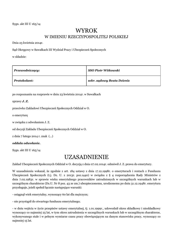 Sygn. akt III U 165/14 WYROK W IMIENIU RZECZYPOSPOLITEJ POLSKIEJ Dnia 23 kwietnia 2014r. Sąd Okręgowy w Suwałkach III Wydział Pracy i Ubezpieczeń Społecznych w składzie: Przewodniczący: SSO Piotr Witkowski Protokolant: sekr. sądowy Beata Dzienis po rozpoznaniu na rozprawie w dniu 23 kwietnia 2014r. w Suwałkach sprawy J. Z. przeciwko Zakładowi Ubezpieczeń Społecznych Oddział w O. o emeryturę w związku z odwołaniem J. Z. od decyzji Zakładu Ubezpieczeń Społecznych Oddział w O. z dnia 7 lutego 2014 r. znak (...) oddala odwołanie. Sygn. akt III U 165/14 UZASADNIENIE Zakład Ubezpieczeń Społecznych Oddział w O. decyzją z dnia 07.02.1014r. odmówił J. Z. prawa do emerytury. W uzasadnieniu wskazał, że zgodnie z art. 184 ustawy z dnia 17.12.1998r. o emeryturach i rentach z Funduszu Ubezpieczeń Społecznych (t.j. Dz. U. z 2013r. poz.1440) w związku z § 4 rozporządzenia Rady Ministrów z dnia 7.02.1983r. w sprawie wieku emerytalnego pracowników zatrudnionych w szczególnych warunkach lub w szczególnym charakterze (Dz.U. Nr 8 poz. 43 ze zm.) ubezpieczonemu, urodzonemu po dniu 31.12.1948r. emerytura przysługuje, jeżeli spełnił łącznie następujące warunki: - osiągnął wiek emerytalny, wynoszący 60 lat dla mężczyzn; - nie przystąpił do otwartego funduszu emerytalnego; - w dniu wejścia w życie przepisów ustawy emerytalnej, tj. 1.01.1999r., udowodnił okres składkowy i nieskładkowy wynoszący co najmniej 25 lat, w tym okres zatrudnienia w szczególnych warunkach lub w szczególnym charakterze, wykonywanego stale i w pełnym wymiarze czasu pracy obowiązującym na danym stanowisku pracy, wynoszący co najmniej 15 lat. Zakład odmówił J. Z. prawa do emerytury, ponieważ nie udowodnił wymaganego 15-letniego okresu pracy w szczególnych warunkach, wykonywanej stale i w pełnym wymiarze czasu pracy. Na podstawie dowodów dołączonych do wniosku i uzyskanych w wyniku przeprowadzonego postępowania Zakład przyjął za udowodnione na dzień 01.01.1999r. okresy składkowe w ilości 26 lat, 8 miesięcy i 20 dni. Nie uwzględnił zaś okresu 05.04.1976r. do 31.12.1998r. jako pracy wykonywanej w szczególnych warunkach, ponieważ złożone zeznania świadków nie stanowią środka dowodowego, o którym mowa w §2 ust. 2 rozporządzenia Rady Ministrów z dnia 7.02.1983r. W odwołaniu od tej decyzji J. Z. domagał się uwzględnienia wnioskowanego okresu do stażu pracy w warunkach szczególnych. W tym zakresie powołał się na zeznania świadków. W odpowiedzi na odwołanie Zakład Ubezpieczeń Społecznych wniósł o jego oddalenie, uzasadniając jak w zaskarżonej decyzji. Sąd Okręgowy w Suwałkach ustalił i zważył, co następuje: Odwołania za uzasadnione nie można było uznać. Odwołujący się urodził się w dniu(...) Zgodnie z art. 184 ust. 1 powołanej ustawy o emeryturach i rentach z Funduszu Ubezpieczeń Społecznych, ubezpieczonym urodzonym po dniu 31.12.1948r. przysługuje emerytura po osiągnięciu wieku przewidzianego w art. 32, 33, 39 i 40, jeżeli w dniu wejścia w życie ustawy, tj. 1.01.1999r. osiągnęli: okres zatrudnienia w szczególnych warunkach lub w szczególnym charakterze wymaganym w przepisach dotychczasowych do nabycia prawa do emerytury w wieku niższym niż 60 lat – dla kobiet i 65 lat – dla mężczyzn oraz okres składkowy i nieskładkowy, o którym mowa w art.27. Ustęp 2 stanowi zaś, że emerytura, o której mowa w ust. 1, przysługuje pod warunkiem nieprzystąpienia do otwartego funduszu emerytalnego albo złożenia wniosku o przekazanie środków zgromadzonych na rachunku w otwartym funduszu emerytalnym, za pośrednictwem Zakładu, na dochody budżetu państwa. Według natomiast art. 32 ust. 4 tej ustawy, wiek emerytalny, rodzaje prac lub stanowisk oraz warunki, na podstawie których przysługuje prawo do emerytury, ustala się na podstawie przepisów dotychczasowych. Tymi zaś przepisami dotychczasowymi są przepisy rozporządzenia Rady Ministrów z dnia 7.02.1983r. w sprawie wieku emerytalnego pracowników zatrudnionych w szczególnych warunkach lub w szczególnym charakterze (Dz. U z 1983r. Nr 8, poz. 43 ze zm.). Stosownie do § 1 ust. 1 tego rozporządzenia, stosuje się ono do pracowników wykonujących prace w szczególnych warunkach lub w szczególnym charakterze, wymienione w § 4-15 tego rozporządzenia oraz w wykazach stanowiących załącznik do rozporządzenia, zwanych dalej ,,wykazami”. Paragraf 2 ust. 1 tego rozporządzenia stanowi, że okresami pracy uzasadniającymi prawo do świadczeń na zasadach określonych w rozporządzeniu są okresy, w których praca w szczególnych warunkach lub w szczególnym charakterze jest wykonywana stale i w pełnym wymiarze czasu pracy obowiązującym na danym stanowisku pracy, zaś według § 4 ust. 1, pracownik, który wykonywał prace w szczególnych warunkach, wymienione w wykazie A, nabywa prawo do emerytury, jeżeli spełnia łącznie następujące warunki: osiągnął wiek emerytalny wynoszący: 55 lat dla kobiet i 60 lat dla mężczyzn oraz ma wymagany okres zatrudnienia, w tym co najmniej 15 lat pracy w szczególnych warunkach. Z powyższego wynika więc, że aby ubezpieczony mógł otrzymać emeryturę na podstawie art. 184 ustawy o emeryturach i rentach z FUS, praca w szczególnych warunkach lub w szczególnym charakterze, przy spełnieniu pozostałych warunków, musiała być przez niego wykonywana w sposób stały i w pełnym wymiarze czasu pracy przez co najmniej 15 lat, przy czym w szczególnych warunkach, to w takich, jakie są wymienione w wykazie A powołanego rozporządzenia. Trzeba również mieć na uwadze, że w wyroku z dnia 20.10.2005r. sygn. I UK 41/05 (LEX 195788) Sąd Najwyższy wskazał też, iż wykonywanie pracy na stanowisku określonym w zarządzeniu resortowym, której nie wymieniono w wykazach A i B, stanowiących załącznik do rozporządzenia Rady Ministrów z dnia 7.02.1983r. w sprawie wieku emerytalnego pracowników zatrudn