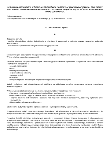 REGULAMIN OBOWIĄZKÓW SPÓŁDZIELNI i CZŁONKÓW W ZAKRESIE NAPRAW WEWNĄTRZ LOKALI ORAZ ZASADY ROZLICZEŃ Z CZŁONKAMI ZWALNIAJĄCYMI LOKALE. PODZIAŁ OBOWIĄZKÓW MIĘDZY SPÓŁDZIELNI I NAJEMCAMI LOKALI UŻYTKOWYCH. Podstawa prawna: Statut Spółdzielni Mieszkaniowej im. B. Chrobrego, § 38, uchwalony 17.12.2003 A. Postanowienia ogólne. §1 Regulamin określa: - podział obowiązków między Spółdzielnią a członkami i najemcami w zakresie napraw wewnątrz budynków mieszkalnych; - prawa i obowiązki członków i najemców zwalniających lokale §2 Spółdzielnia jest obowiązana do zapewnienia pełnej sprawności techniczno-użytkowej eksploatowanych obiektów. W tym celu jest zobowiązana zapewnić: Sprawne działanie urządzeń technicznych umożliwiających członkom Spółdzielni i najemcom lokali mieszkalnych i użytkowych korzystanie z: - energii elektrycznej; - gazu; - ciepłej i zimnej wody; - odprowadzenia ścieków; - wywozu śmieci; - dźwigów; - innych urządzeń, niezbędnych do prawidłowego funkcjonowania budynku Nadzór techniczny nad eksploatowanymi obiektami umożliwiający rzetelne rozpoznanie potrzeb remontowomodernizacyjnych. Wykonawstwo robót remontowo-modernizacyjnych i właściwy nadzór nad tymi robotami: - Wymiana i naprawa pokryć dachowych z obróbkami blacharskimi; - Naprawa balkonów i loggii w zakresie podłóż, balustrad i obróbek blacharskich; - Napraw daszków nad balkonami i daszków nad wejściami do klatek schodowych, jeżeli były wykonane przez Spółdzielnię; - Naprawa i wymiana anten zbiorczych; Użytkowanie budynków zgodnie z przeznaczeniem i wymogami ochrony ogrodowiska. Przeprowadzanie badań stanu technicznego budynków i ich elementów w okresach rocznych i wieloletnich dla utrzymania budynków i lokali w należytym stanie technicznym zgodnie z wymogami Ustawy Prawo budowlane. Prowadzić książki obiektów budowlanych zgodnie z wymogami Ustawy Prawo budowlane i obowiązującymi przepisami wykonawczymi, stanowiące dokument przeznaczony do zapisów przeprowadzonych badań i kontroli stanu technicznego, remontów i przebudowy w okresie użytkowania obiektu budowlanego. Protokoły z kontroli obiektu, oceny i ekspertyzy, dotyczące jego stanu technicznego oraz inne dokumenty wynikające z Art.63 Prawa budowlanego, powinny być dołożone do książki obiektu budowlanego i przechowywane przez okres istnienia obiektu budowlanego. Zapewnić utrzymanie wymaganego stanu technicznego pomieszczeń przeznaczonych do wspólnego użytkowanie jak suszarnie, pralnie, klatki schodowe, wspólne korytarze, zsypy itp. Zabezpieczyć ochronę przeciwpożarową budynków i utrzymywać w pełnej sprawności technicznej urządzenia i instalacje do natychmiastowego użycia §3 W razie zaistnienia katastrofy budowlanej Spółdzielnia winna: Udzielić informacji oraz udostępnić dokumentację dotyczącą budynku. Pokryć koszty ekspertyz, których opracowanie było niezbędne do wydania decyzji lub ustalenia przyczyn katastrofy. Podjąć działania niezbędne do usunięcia skutków katastrofy budowlanej, a w szczególności wynikające z decyzji organu nadzoru budowlanego. Dokonać oceny wystąpienia ewentualnych zagrożeń innych zarządzanych obiektów oraz, w razie ujawnienia tych zagrożeń, podjąć niezwłocznie działania mające na celu ich usunięcie. B. Podział obowiązków między Spółdzielnią a członkami w zakresie napraw wewnątrz budynków mieszkalnych. §4 W zakresie napraw wewnątrz budynków Spółdzielnia zobowiązana jest do: naprawy przewodów instalacyjnych zasilających będących w standardowym wyposażeniu budynków mieszkalnych: naprawy głównych instalacji kanalizacji wewnętrznej od studzienek do trójników; naprawy głównych instalacji wodociągowych do zaworów odcinających w mieszkaniu włącznie; naprawy całej wewnętrznej instalacji centralnego ogrzewania z osprzętem; naprawy lub wymiany instalacji elektrycznej budynków od strony zasilania do licznika lokatorskiego w budynkach średniowysokich lub do gniazd bezpiecznikowych w budynkach niskich; naprawy wewnętrznej instalacji gazowej do zaworu odcinającego dopływ gazu przy kuchni gazowej (z wyjątkiem gazomierzy); naprawy instalacji AZART – z wyłączeniem gniazd wtykowych; legalizacji wodomierzy w przypadku, gdy lokator wnosi opłatę za legalizację; naprawy i konserwacji instalacji domofonowej (do unifonu, lecz bez unifonu) w przypadku, gdy lokator wnosi opłatę za konserwację. czyszczenie i udrażnianie przewodów wentylacyjnych naprawy polegające na usuwaniu zniszczeń powstałych na skutek wykonywania robót remontowo-budowlanych obciążających Spółdzielnię, np. usuwanie zacieków powstałych na skutek nieszczelnego pokrycia dachowego, przecieków z uszkodzonych rur spustowych, pęknięć rur instalacji centralnego ogrzewania lub wodnokanalizacyjnych; wymiana całości elementów stolarki okiennej – po protokolarnym stwierdzeniu konieczności. Wymiana przeprowadzana jest według kolejności zgłoszeń. Wymiana poza kolejnością opisana jest w § 8. Pierwsza wymiana stolarki okiennej jest realizowana przez Spółdzielnie ze środków funduszu celowego (od 01.01.1999). naprawy i wymiany urządzeń i instalacji w pomieszczeniach ogólnego użytku (pralnie, suszarnie, klatki schodowe, zsypy; malowanie klatek schodowych w całości, korytarzy piwnicznych i pomieszczeń wspólnego użytkowania; Koszty napraw w/w instalacji, leżących w obowiązkach Spółdzielni, wynikających z nieprawidłowej eksploatacji lub dewastacji oraz usuwanie przeróbek lokatorskich sprzecznych z projektem, obciążają członka Spółdzielni. §5 Przy przyjmowaniu mieszkania, użytkownik winien zgłosić zastane usterki na piśmie, ze szczególnym uwzględnieniem urządzeń technicznych, będących na wyposażeniu lokalu. Nie dotyczy lokali nabytych lub przejmowanych w drodze zamiany lub w trybie art.15 ustawy o spółdzielniach mieszkaniowych (Dz. U. Nr 119 poz. 111