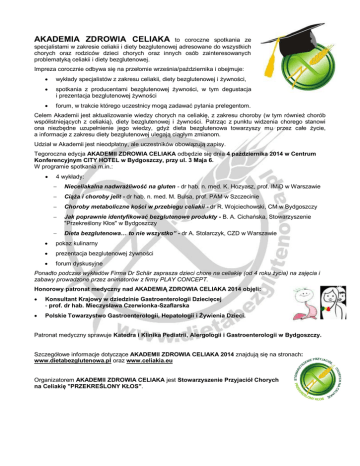 AKADEMIA ZDROWIA CELIAKA to coroczne spotkania ze specjalistami w zakresie celiakii i diety bezglutenowej adresowane do wszystkich chorych oraz rodziców dzieci chorych oraz innych osób zainteresowanych problematyką celiakii i diety bezglutenowej. Impreza corocznie odbywa się na przełomie września/października i obejmuje: wykłady specjalistów z zakresu celiakii, diety bezglutenowej i żywności, spotkania z producentami bezglutenowej żywności, w tym degustacja i prezentacja bezglutenowej żywności forum, w trakcie którego uczestnicy mogą zadawać pytania prelegentom. Celem Akademii jest aktualizowanie wiedzy chorych na celiakię, z zakresu choroby (w tym również chorób współistniejących z celiakią), diety bezglutenowej i żywności. Patrząc z punktu widzenia chorego stanowi ona niezbędne uzupełnienie jego wiedzy, gdyż dieta bezglutenowa towarzyszy mu przez całe życie, a informacje z zakresu diety bezglutenowej ulegają ciągłym zmianom. Udział w Akademii jest nieodpłatny, ale uczestników obowiązują zapisy. Tegoroczna edycja AKADEMII ZDROWIA CELIAKA odbędzie się dnia 4 października 2014 w Centrum Konferencyjnym CITY HOTEL w Bydgoszczy, przy ul. 3 Maja 6. W programie spotkania m.in.: 4 wykłady: Nieceliakalna nadwrażliwość na gluten - dr hab. n. med. K. Hozyasz, prof. IMiD w Warszawie Ciąża i choroby jelit - dr hab. n. med. M. Bulsa, prof. PAM w Szczecinie Choroby metaboliczne kości w przebiegu celiakii - dr R. Wojciechowski, CM w Bydgoszczy Jak poprawnie identyfikować bezglutenowe produkty - B. A. Cichańska, Stowarzyszenie "Przekreślony Kłos" w Bydgoszczy Dieta bezglutenowa… to nie wszystko” - dr A. Stolarczyk, CZD w Warszawie pokaz kulinarny prezentacja bezglutenowej żywności forum dyskusyjne Ponadto podczas wykładów Firma Dr Schär zaprasza dzieci chore na celiakię (od 4 roku życia) na zajęcia i zabawy prowadzone przez animatorów z firmy PLAY CONCEPT. Honorowy patronat medyczny nad AKADEMIĄ ZDROWIA CELIAKA 2014 objęli: Konsultant Krajowy w dziedzinie Gastroenterologii Dziecięcej - prof. dr hab. Mieczysława Czerwionka-Szaflarska Polskie Towarzystwo Gastroenterologii, Hepatologii i Żywienia Dzieci. Patronat medyczny sprawuje Katedra i Klinika Pediatrii, Alergologii i Gastroenterologii w Bydgoszczy. Szczegółowe informacje dotyczące AKADEMII ZDROWIA CELIAKA 2014 znajdują się na stronach: www.dietabezglutenowa.pl oraz www.celiakia.eu Organizatorem AKADEMII ZDROWIA CELIAKA jest Stowarzyszenie Przyjaciół Chorych na Celiakię "PRZEKREŚLONY KŁOS".