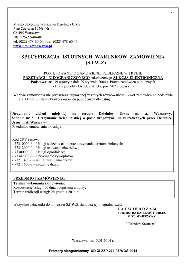 1 Miasto Stołeczne Warszawa Dzielnica Ursus Plac Czerwca 1976r. Nr 1 02-495 Warszawa NIP 525-22-48-481 tel. (022) 478-60-00, fax. (022) 478-60-11 www.ursus.warszawa.pl SPECYFIKACJA ISTOTNYCH WARUNKÓW ZAMÓWIENIA (S.I.W.Z) POSTĘPOWANIE O ZAMÓWIENIE PUBLICZNE W TRYBIE PRZETARGU NIEOGRANICZONEGO zakończonego AUKCJĄ ELEKTRONICZNĄ Podstawa: art. 39 ustawy z dnia 29 stycznia 2004 r. Prawo zamówień publicznych (Tekst jednolity Dz. U. z 2013 r, poz. 907 z późn.zm) Wartość zamówienia nie przekracza wyrażonej w złotych równowartości kwot zamówień na podstawie art. 11 ust. 8 ustawy Prawo zamówień publicznych dla usług. Utrzymanie zieleni miejskiej na terenie Dzielnicy Ursus m. st. Warszawy. Zadanie nr 2: Utrzymanie zieleni niskiej w pasie drogowym ulic zarządzanych przez Dzielnicę Ursus m.st. Warszawy Przedmiot zamówienia określają Kod CPV i nazwa: - 77310000-6 – Usługi sadzenia oślin oraz utrzymania terenów zielonych; - 77312000-0 – Usługi usuwania chwastów ; - 77300000-3 – Usługi ogrodnicze; - 77342000-9 – Przycinanie żywopłotów; - 77211400-6 – usługi wycinania drzew. - 77211600-8 – sadzenie drzew PRZEDMIOT ZAMÓWIENIA: Termin wykonania zamówienia: Rozpoczęcie usługi: od dnia podpisania umowy; Termin realizacji usługi: 24 grudnia 2014 r. Wszystkie załączniki do niniejszej S.I.W.Z stanowią jej integralną część. Z A T W I E R D Z A M: BURMISTRZ DZIELNICY URSUS M.ST. WARSZAWY /-/ Wiesław Krzemień Warszawa, dn.13.01.2014 r. Przetarg nieograniczony UD-XI-ZZP.271.03.WOŚ.2014 2 CZĘŚĆ I INFORMACJE OGÓLNE 1. Wykonawcą może być osoba fizyczna, osoba prawna albo jednostka organizacyjna nieposiadająca osobowości prawnej, która ubiega się o udzielenie zamówienia publicznego. O udzielenie zamówienia mogą się ubiegać Wykonawcy występujący wspólnie. O udzielenie zamówienia mogą ubiegać się Wykonawcy, których oferta spełnia wymagania określone w niniejszej S.I.W.Z. Przepisy dotyczące Wykonawcy stosuje się odpowiednio do Wykonawców wspólnie ubiegających się o udzielenie zamówienia. 2. Wykonawcy, którzy ubiegają się wspólnie o udzielenie zamówienia ponoszą solidarną odpowiedzialność za wykonanie umowy i wniesienie zabezpieczenia należytego wykonania umowy. 3. Zamawiający nie dopuszcza składania ofert częściowych. 4. Zamawiający nie przewiduje zawarcia umowy ramowej. 5. Zamawiający nie przewiduje udzielenia zamówienia uzupełniającego, o którym mowa w art. 67 ust. 1 pkt. 6 ustawy Prawo zamówień publicznych. 6. Zamawiający nie dopuszcza możliwości składania ofert wariantowych. 7. Zamawiający nie przewiduje wyboru najkorzystniejszej oferty z zastosowaniem aukcji elektronicznej, 8. Zamawiający nie przewiduje udzielenia zaliczek na poczet wykonania zamówienia. 9. Zamawiający nie ogranicza możliwości ubiegania się o zamówienie publiczne tylko dla Wykonawców, u których ponad 50% pracowników stanowią osoby niepełnosprawne w rozumieniu przepisów o rehabilitacji zawodowej i społecznej oraz zatrudnianiu osób niepełnosprawnych, lub w rozumieniu właściwych przepisów państw członkowskich Unii Europejskiej lub Europejskiego Obszaru Gospodarczego – jeżeli Wykonawca ma siedzibę lub miejsce zamieszkania w tych państwach. CZĘŚĆ II WARUNKI UDZIAŁU W POSTĘPOWANIU I. O udzielenie zamówienia mogą ubiegać się Wykonawcy, którzy spełniają poniższe warunki udziału w postępowaniu - Opis sposobu dokonywania oceny spełniania warunków: 1. Wykonawca odpowiednio na dzień składania ofert i w zakresie wskazanym w S.I.W.Z, wykaże, że spełnia warunki udziału w postępowaniu, o których mowa w art. 22 ust. 1 ustawy Prawo zamówień publicznych. Wykonawca składa oświadczenie o spełnianiu warunków określonych w art. 22 ust. 1 ustawy Prawo zamówień publicznych. W przypadku składania oferty przez Wykonawców występujących wspólnie wyżej wymienione oświadczenie podpisuje w imieniu wszystkich Wykonawców Pełnomocnik, wpisując w miejscu przeznaczonym na podanie nazwy i adresu Wykonawcy, nazwy i adresy wszystkich Wykonawców składających ofertę wspólną. W przypadku składania oferty przez Wykonawców ubiegających się wspólnie o zamówienie, warunki wskazane w art. 22 ustawy winny być spełnione łącznie w zakresie: dysponowania potencjałem technicznym i osobami zdolnymi do wykonania zamówienia, posiadania odpowiedniej wiedzy i doświadczenia oraz potencjału finansowego. Warunki wynikające z dyspozycji art. 22 ust. 1 ustawy, są to warunki których spełnienie skutkuje dopuszczeniem do procedury udzielenia zamówienia publicznego; 2. Uprawnienia do wykonywania określonej działalności lub czynności, jeżeli przepisy prawa nakładają obowiązek ich posiadania; Zezwolenie na prowadzenie działalności w zakresie : Przetarg nieograniczony UD-XI-ZZP.271.03.WOŚ.2014 3 a) zbierania i transportu odpadów, wydane przez właściwy organ na podstawie art.28 ustawy o odpadach (Dz.U. z 2013 r. poz. 21 z póź .zm.) lub odzysku i unieszkodliwiania odpadów, wydawane przez właściwy organ, na podstawie art. 32 ustawy o odpadach , jeżeli ww. działalność prowadzona jest łącznie z działalnością związaną ze zbieraniem odpadów, b) aktualne zaświadczenie o wpisie do rejestru działalności regulowanej w zakresie odbierania odpadów komunalnych od właścicieli nieruchomości, prowadzonego przez Prezydenta m.st. Warszawy dokonany na podstawie ustawy z dnia 13 września 1996 r., o utrzymaniu czystości i porządku w gminach (Dz.U z 2012 r. poz.391, z póź.zm.) o następujących kodach: 20 02 01 – odpady ulegające biodegradacji, 20 02 03 – inne odpady ulegające biodegradacji, 20 03 01 – niesegregowane (zmieszane) odpady komunalne, 3. Warunek – posiadania niezbędnej wiedzy i doświadczenia Zamawiający wymaga, aby wykonawca wykazał, ze w okresie ostatnich trzech lat przed upływem terminu składania ofert, a jeśli okres prowadzenia działalności jest kr