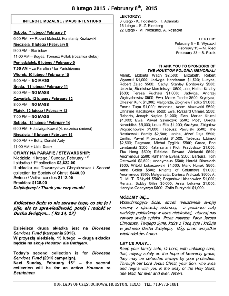 8 lutego 2015 / February 8th, 2015 INTENCJE MSZALNE / MASS INTENTIONS Sobota, 7 lutego / February 7 LEKTORZY: 8 lutego - K. Podskarbi, H. Adamski 15 lutego – E. Z. Elenberg 22 lutego - M. Podskarbi, A. Kosacka 6:00 PM ++ Robert Maleski, Konstanty Kozłowski LECTOR: February 8 – E. Wysocki February 15 – M. Ried Frebruary 22 – S. Polak Niedziela, 8 lutego / February 8 9:00 AM - Stanisław 11:00 AM – Bogda, Tomasz Pollak (rocznica ślubu) Poniedziałek, 9 lutego / February 9 7:00 AM – za Parafian / for Parishioners Wtorek, 10 lutego / February 10 8:00 AM - NO MASS Środa, 11 lutego / February 11 8:00 AM – NO MASS Czwartek, 12 lutego / February 12 8:00 AM – NO MASS Piątek, 13 lutego / February 13 7:00 PM – NO MASS Sobota, 14 lutego / February 14 6:00 PM + Jadwiga Kowal (4. rocznica śmierci) Niedziela, 15 lutego / February 15 9:00 AM ++ Betty, Donald Auty 11:00 AM + Lidia Doerr OFIARY NA PARAFIĘ / STEWARDSHIP: Niedziela, 1 lutego / Sunday, February 1st I składka / 1st collection $3,622.00 II składka na Towarzystwo Chrystusowe / Second collection for Society of Christ $440.00 Świece / Votive candles $112.00 Breakfast $138.00 Dziękujemy! / Thank you very much! THANK YOU TO SPONSORS OF THE HOUSTON POLONIA MEMORIAL! Marek, Elżbieta Wach $2,500; Elizabeth, Robert Wysocki $1,000; Jadwiga Henderson $1,500; Lucyna, Robert Zając $500; Cathy, Stanley Bordovsky $500; Urszula, Stanisław Marciniszyn $500; Joe, Halina Kalaby $500; Teresa Puchała $1,000; Jadwiga, Andrzej Wędrychowicz $500; Ewa, Marek Treder $500; Krystyna, Chester Kurk $1,000; Małgorzta, Zbigniew Fedko $1,000; Emma Tupa $1,000; Antonina, Adam Mazewski $500; Christine Raczkowski $500; Ewa, Ryszard Chmiel, $500; Roberta, Joseph Naples $1,000; Ewa, Marian Kruzel $1,000; Ewa, Paweł Szymczyk $500; Piotr, Dorota Nowobilski $5,000; Louis Ellis $1,000; Grażyna, Zbigniew Wojciechowski $1,000; Tadeusz Pawulski $500; The Rostkowski Family $2,500; Janina, Józef Deja $500; Emilia, Paweł Mrówczyński $1,500; Tadeusz Izbiński $2,500; Dagmara, Michał Żyglicki $500; Grace, Eric Lemberski $500; Katarzyna i Piotr Przybylscy $1,000; Thu Hong $500; Elżbieta, Edward Winiarski $500; Anonymous $500; Katherine Evans $500; Barbara, Tom Ostrowski $2,500; Anonymous $500; Harold Blazevich $500; Witold Łukaszewski $1,000; Mark Hunek $500; Anna Golka $500; Knights of Columbus $1,000; Anonymous $500; Małgorzata, Dariusz Walczak $500; A. D. M. T. Różycki $500; Bogusław Urbanowicz $1,000; Renata, Bobby Giles $5,000; Anna Lekawa $1,000; Henryka Gazdyszyn $500; Zofia Burzynski $1,000. MÓDLMY SIĘ... Królestwo Boże to nie sprawa tego, co się je i pije, ale to sprawiedliwość, pokój i radość w Duchu Świętym… ( Rz 14, 17) Dzisiejsza druga składka jest na Diocesan Services Fund (kampania 2015). W przyszłą niedzielę, 15 lutego – druga składka będzie na akcję Houston dla Betlejem. Today’s second collection is for Diocesan Services Fund (2015 campaign). Next Sunday, February 15th – the second collection will be for an action Houston to Bethlehem. Wszechmogący Boże, strzeż nieustannie swojej rodziny z ojcowską dobrocią, a ponieważ całą nadzieję pokładamy w łasce niebieskiej, otaczaj nas zawsze swoją opieką. Przez naszego Pana Jezusa Chrystusa, Twojego Syna, który z Tobą żyje i króluje w jedności Ducha Świętego, Bóg, przez wszystkie wieki wieków. Amen. LET US PRAY… Keep your family safe, O Lord, with unfailing care, that, relying solely on the hope of heavenly grace, they may be defended always by your protection. Through our Lord Jesus Christ, your Son, who lives and reigns with you in the unity of the Holy Spirit, one God, for ever and ever. Amen. OUR LADY OF CZĘSTOCHOWA, HOUSTON, TEXAS TEL. 713-973-1081 8 lutego 2015 / February 8th, 2015 NOWA KAMPANIA D S F W całej archidiecezji Galveston-Houston rozpoczyna się dziś już 49. kampania Diocesan Services Fund, czyli zbierania funduszy na „niedochodowe” odcinki duszpasterstwa, jednak bez których Kościół nie byłby Kościołem! W tegorocznej kampanii akcentuje się głównie ważną dziedzinę budzenia i troski o powołania kapłańskie oraz pomoc rodzinie, w szczególności poprzez programy adopcyjne. Zobowiązanie naszej parafii wynosi w tym roku $17,600 (czyli jest większe o $1,600 niż przed rokiem). STUDY DAYS Juro rano udaję się do ośrodka Marywood Retreat w St. Johns na Florydzie, gdzie odbędą się doroczne study days chrystusowców. Z tego też względu w dniach 10-13 lutego w naszym kościele nie będzie odprawiana Msza św. W poniedziałek, 9 lutego poranna Msza zostanie odprawiona wyjątkowo o godz. 7:00 AM. BAL KARNAWAŁOWY Komitet Rodzicielski szkoły zaprasza na karnawałowy, który odbędzie się w sobotę, lutego, o godz. 7:00 PM. bal 14 OSTATNIE DNI KARNAWAŁU Przed nami ostatnie dni karnawału. W przyszłą środę, 18 lutego rozpoczniemy Wielki Post. Tego dnia w naszym kościele zostaną odprawione dwie Msze św.: o godz. 8:00 AM po angielsku i o 7:00 PM – po polsku i angielsku. Zapoznajmy się z poniższym wyjaśnieniem dotyczącym dyscypliny postu ścisłego w Kościele katolickim. POST ŚCISŁY W ŚRODĘ POPIELCOWĄ W Kościele katolickim Środa Popielcowa jest dniem postu ścisłego, tzn. że każdy z nas może zjeść 3 posiłki, z czego tylko jeden do syta (ta forma umartwienia obowiązuje od 18 do 60 roku życia), oraz ma powstrzymać się od jedzenia mięsa (ten element umartwienia obowiązuje od 14 roku życia bez górnej granicy wieku). Kościół św. jednak zachęca, aby wszyscy, którzy formalnie nie są zobowiązani do któreś z tym form ascezy, podjęli ją w duchu miłości. REKOLEKCJE DLA MĘŻCZYZN Holy Name Retreat Center zaprasza mężczyzn na specjalne rekolekcje, które odbędą się w dniach 27-29 marca. Więcej informacji może udzielić Piotr Przybylski (281) 974-7875 lub Robert Wysocki (281) 558-5283. NEW D S F CAMPAIGN Today begins the 49th Diocesan Services Fund campaign in the