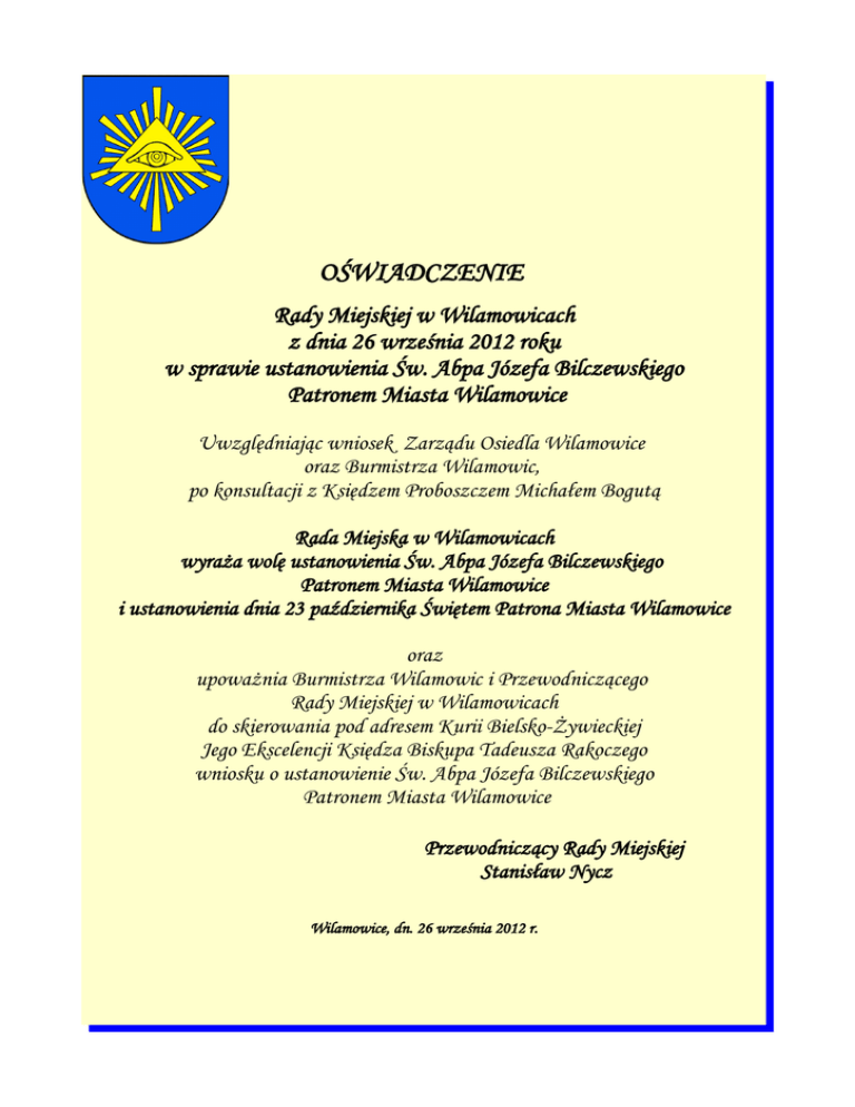 OŚWIADCZENIE Rady Miejskiej w Wilamowicach z dnia 26 września 2012 roku w sprawie ustanowienia Św. Abpa Józefa Bilczewskiego Patronem Miasta Wilamowice Uwzględniając wniosek Zarządu Osiedla Wilamowice oraz Burmistrza Wilamowic, po konsultacji z Księdzem Proboszczem Michałem Bogutą Rada Miejska w Wilamowicach wyraża wolę ustanowienia Św. Abpa Józefa Bilczewskiego Patronem Miasta Wilamowice i ustanowienia dnia 23 października Świętem Patrona Miasta Wilamowice oraz upoważnia Burmistrza Wilamowic i Przewodniczącego Rady Miejskiej w Wilamowicach do skierowania pod adresem Kurii Bielsko-Żywieckiej Jego Ekscelencji Księdza Biskupa Tadeusza Rakoczego wniosku o ustanowienie Św. Abpa Józefa Bilczewskiego Patronem Miasta Wilamowice Przewodniczący Rady Miejskiej Stanisław Nycz Wilamowice, dn. 26 września 2012 r. Uzasadnienie woli ustanowienia Św. Abpa Józefa Bilczewskiego Patronem Miasta Wilamowice Każdy musi samodzielnie szukać ścieżki życia. Ważne jest zatem, aby mieć drogowskaz - nauczyciela, wzór, autorytet – kogoś, z kim można się identyfikować i czerpać to, co najcenniejsze. Dlatego pragniemy nadać naszemu miastu imię postaci, która mogłaby być pomocną w kształtowaniu postaw oraz wychowywaniu młodego pokolenia w poszanowaniu własnej godności i Ojczyzny – Św. Abpa Józefa Bilczewskiego. Święty Arcybiskup Józef Bilczewski, Nasz Rodak, urodził się 26 kwietnia 1860 roku, tutaj – w Wilamowicach, w ubogiej rodzinie. Rodzice uczynili wszystko, by młody, uzdolniony Józef mógł się kształcić. Dzięki ich wysiłkowi ukończył z wyróżnieniem najpierw Gimnazjum, a następnie Liceum w Wadowicach. W 1880 roku, wstąpił do Seminarium Duchownego w Krakowie, które ukończył w roku 1884. W kolejnych latach studiował w Paryżu oraz Rzymie. Po otrzymaniu Sakry Biskupiej w 1901 roku, 13 października przybył z wizytacją do Wilamowic, cały czas bowiem był blisko związany ze swoją parafią. Zatroskany o przyszłość młodego pokolenia w roku 1908 ufundował Ochronkę i sprowadził do Wilamowic Siostry Służebniczki NMP. Napisał: "Dziatwa przyjęta do Ochronki ma być pouczona, że wiara katolicka jest najdroższym skarbem, a zbawienie duszy najwyższym celem każdego człowieka, że po miłości Boga i Kościoła Katolickiego idzie zaraz miłość Ojczyzny i narodu, że każdy kto żyje na ziemi polskiej winien kochać Ojczyznę i naród polski". Św. Abp Józef Bilczewski żyjąc bardzo skromnie wspierał biednych nie tylko duchowo ale również materialnie. Z Jego inspiracji i z Jego pomocą utworzone zostały liczne organizacje, wspierał m. in. miejscową szkołę. Przeznaczał środki finansowe na specjalny fundusz, który powstał po to, by pomagać uzdolnionej młodzieży z Wilamowic. Święte było zarówno życie Lwowskiego Metropolity, jak i Jego śmierć. Pełna poświęcenia aktywność duszpasterska, mało snu, a także dużo modlitwy i pracy nadwyrężyły Jego zdrowie. Arcybiskup zmarł 20 marca 1923 roku. Pełny pokory pragnął, aby Jego ciało spoczęło na skromnym Cmentarzu Janowskim – miejscu pochówku ubogich. Już wtedy wierni, którzy towarzyszyli mu w ostatniej drodze, przekonani byli, że żegnają człowieka świętego. Możemy śmiało powtórzyć za Ks. Abpem Bolesławem Twardowskim, który pisał: "Całe jego życie i to, czego obecnie jesteśmy świadkami potwierdza, że Arcypasterz zadania swoje wobec Boga i nas gorliwie pełni, że miłością wielką otacza nasze Miasto i całą Archidiecezję. W sprawach najtrudniejszych, gdzie zawodzą lub za małe są siły ludzkie, szukamy pomocy i cudu przez modlitwę za przyczyną tego najczujniejszego Arcypasterza, bo wiemy że nasze troski są starań jego u Boga celem najbliższym". Doczekaliśmy szczęśliwie procesu beatyfikacji, a następnie kanonizacji – jakże ważnych dla nas chwil. Nie byłoby jednak tych wydarzeń, gdyby nie cudowne uzdrowienie kilkunastu osób, które dokonały się za wstawiennictwem Świętego. Beatyfikacja Abpa Bilczewskiego miała miejsce podczas pielgrzymki Ojca Świętego Jana Pawła II na Ukrainę, dnia 26 czerwca 2001 roku, we Lwowie. Kanonizacji dokonał Benedykt XVI, dnia 23 października 2005 roku, w Rzymie. Kult Świętego po Jego beatyfikacji i kanonizacji rozsławia Jego miejsce urodzenia – Wilamowice, na całą Polskę, a nawet za granicę. Mając tak wybitnego Świętego Rodaka, słuszną rzeczą jest, aby został On Patronem Miasta, co z pewnością przyczyni się również do zwiększenia liczby pątników w naszym kościele – Sanktuarium – a także do poznania bogatej historii Wilamowic. Podsumowując - postać naszego kandydata: • reprezentuje uniwersalne wartości, z którymi może identyfikować się każdy; • zwraca uwagę na wartości bliskie społeczności lokalnej, w której postać Świętego jest powszechnie znana; • wzmacnia poczucie wspólnoty kościelnej, narodowej, państwowej; • pozwala rozwijać w młodym człowieku takie cechy jak: dobro, wrażliwość na krzywdę drugiego człowieka, empatię, bohaterstwo, wiarę w ideały, poczucie wspólnoty; • w sposób jednoznaczny pokazuje, czym jest miłość do Stwórcy, wolność, patriotyzm, prawa człowieka i obywatela. Zatem działalność duszpasterska i wartości, którymi kierował się Św. Abp Józef Bilczewski, były, są i będą inspiracją oraz wzorem do naśladowania dla wielu Wilamowiczan. Najważniejsze wydarzenia: • urodzony dnia 26.04.1860 roku, w Wilamowicach; • w latach 1901 - 1923 - Arcybiskup Archidiecezji Lwowskiej; • dnia 20.03.1923 roku - zmarł we Lwowie; • dnia 26.06.2001 roku - Beatyfikacja we Lwowie dokonana przez Papieża Jana Pawła II; • dnia 12.06.2002 roku - Msza Święta Dziękczynna w Wilamowicach za Beatyfikację, przewodniczy Prymas Polski Kardynał Józef Glemp z udziałem Episkopatu Polski – 86 Kardynałów, Arcybiskupów i Biskupów ; • dnia 24.02.2005 roku - Papież Jan Paweł II p
