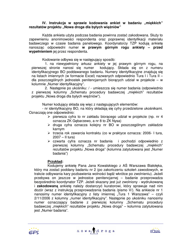 IV. Instrukcja w sprawie kodowania ankiet w badaniu „miękkich” rezultatów projektu „Nowa droga dla byłych więźniów” Każda ankieta użyta podczas badania powinna zostać zakodowana. Służy to zapewnieniu anonimowości respondenta oraz poprawnej identyfikacji materiału badawczego w czasie badania panelowego. Koordynatorzy TZP kodują ankietę nanosząc odpowiedni numer w prawym górnym rogu ankiety – przed wypełnieniem jej przez respondenta. Kodowanie odbywa się w następujący sposób: 1. na niewypełniony arkusz ankiety w jej prawym górnym rogu, na pierwszej stronie nanosi się numer kodujący. Składa się on z numeru identyfikacyjnego BO poddawanego badaniu. Numery identyfikacyjne znajdują się na listach imiennych (w formacie Excel) nazwanych odpowiednio Tura I i Tura II – dla poszczególnych jednostek penitencjarnych biorących udział w projekcie – w kolumnie „Numer identyfikacyjny”. 2. Następnie po ukośniku: / - umieszcza się numer badania (odpowiednio z pierwszej kolumny „Schematu procedury badawczej „miękkich” rezultatów projektu „Nowa droga dla byłych więźniów”). Numer kodujący składa się więc z następujących elementów: - nr identyfikacyjny BO, na który składają się cyfry przedzielone ukośnikami. Oznaczają one odpowiednio: pierwsza cyfra to nr zakładu biorącego udział w projekcie (np. nr 4 oznacza ZK Gębarzewo, a nr 8 to ZK Nysa) druga cyfra oznacza kolejny nr BO w poszczególnym zakładzie karnym trzecia rok zawarcia kontraktu (co w praktyce oznacza: 2006- I tura, 2007 – II tura) czwarta cyfra oznacza nr badania i pochodzi odpowiednio z pierwszej kolumny „Schematu procedury badawczej „miękkich” rezultatów projektu „Nowa droga” (kolumna zatytułowana jest „Numer badania”) Przykład: Kodujemy ankietę Pana Jana Kowalskiego z AŚ Warszawa Białołęka, który ma zostać poddany badaniu nr 2 (po zakończeniu szkoleń zawodowych, w trakcie odbywania kary pozbawienia wolności bądź wkrótce po zwolnieniu). Jeżeli przebywa on jeszcze w jednostce penitencjarnej – badanie przeprowadza bezpośrednio koordynator TZP. Jeżeli skazany jest już zwolniony - wydrukowaną i zakodowaną ankietę należy dostarczyć kuratorowi, który sprawuje nad nim dozór (wraz z instrukcją przeprowadzenia badania /pismo V/). Na ankiecie nr 1 nanosimy numer identyfikacyjny z listy imiennej „Tura 1 Warszawa” – czyli 2/11/2006 z kolumny „numer identyfikacyjny”. Następnie po ukośniku nanosimy numer oznaczający badanie z pierwszej kolumny „Schematu procedury badawczej „miękkich” rezultatów projektu „Nowa droga” – kolumna zatytułowana jest „Numer badania”. Jest to badanie 2 – więc w efekcie otrzymujemy nr: 2/11/2006/2 i taki nr nanosimy w prawym górnym rogu ankiety. Przy trzecim badaniu na przeprowadzanej z nim ankiecie (po opuszczeniu ZK - w końcowym okresie udziału BO w projekcie) w prawym górnym rogu ankiety należy odpowiednio umieścić nr 2/11/2006/3 Po wydrukowaniu kwestionariusza PRZED WYPEŁNIENIEM ANKIETY koordynator TZP MUSI w prawym górnym rogu ankiety nanieść przypisany respondentowi numer ID oraz cyfrę oznaczającą pomiar (tak by kuratorzy otrzymali już zakodowane kwestionariusza ankiet). Koordynatorzy terenowi wraz z wzorami ankiet i instrukcjami ich wypełnienia otrzymają imienne listy uczestników badania wraz z odpowiednimi numerami identyfikacyjnymi przypisanymi indywidualnie dla każdego respondenta. Koordynatorzy lokalnych zespołów partnerskich otrzymują komplet dokumentacji związanych z badaniem. Proszę o skopiowanie list uczestników badania wraz z numerami identyfikacyjnymi i wydrukowanie odpowiedniej ilości ankiet oraz przekazanie ich kuratorom wraz z instrukcjami. Po przeprowadzeniu badania ankiety należy przesłać na adres: Centralny Zarząd Służby Więziennej Biuro Prezydialne ul. Rakowiecka 37a 02-521 Warszawa ppor. Marek Mikielewicz W przypadku pytań i wątpliwości proszę o kontakt z Markiem Mikielewiczem pod nr +48 510 052 730 lub +48 22 640 85 96 e-mail: [email protected]