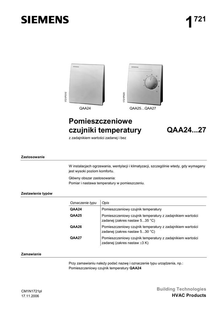 1721 Pomieszczeniowe czujniki temperatury QAA24...27