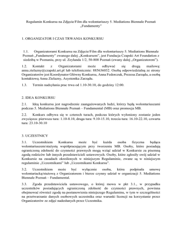 Regulamin Konkursu na Zdjęcie/Film dla wolontariuszy 5. Mediations Biennale Poznań „Fundamenty” 1. ORGANIZATOR I CZAS TRWANIA KONKURSU 1.1. Organizatorami Konkursu na Zdjęcie/Film dla wolontariuszy 5. Mediations Biennale Poznań „Fundamenty” zwanego dalej „Konkursem”, jest Fundacja Czapski Art Foundation z siedzibą w Poznaniu, przy ul. Zeylanda 1/2, 50-808 Poznań (zwany dalej „Organizatorem”). 1.2. Kontakt z Organizatorami może odbywać się drogą mailową: [email protected] lub telefonicznie: 885636032. Osobą odpowiedzialną ze strony Organizatorów jest Koordynator Główny Konkursu, Anna Fedorczuk, Prezesa Zarządu, a osobą kontaktową Anna Zielazny, Asystentka Zarządu. 1.3. Termin nadsyłania prac trwa od 1.10-30.10, do godziny 12:00. 2. IDEA KONKURSU 2.1. Ideą konkursu jest nagrodzenie zaangażowanych ludzi, którzy będą wolontariuszami podczas 5. Mediations Biennale Poznań – Fundamental (MB) oraz promocja MB. 2.2. Konkurs odbywa się w czterech turach, podczas których wyłoniony zostanie jeden zwycięzca: pierwsza tura: 1.10-8.10, druga tura: 9.10-15.10, trzecia tura: 16.10-22.10, czwarta tura: 23.10-30.10 3. UCZESTNICY 3.1. Uczestnikiem Konkursu może być każda osoba fizyczna będąca wolontariuszem/stażystą współpracującym przy tworzeniu MB. Osoby, które posiadają ograniczoną zdolność do czynności prawnych mogą wziąć udział w Konkursie za pisemną zgodą rodziców lub innych przedstawicieli ustawowych. Osoby, które zgłosiły swój udział w Konkursie na zasadach określonych w niniejszym Regulaminie, zwane są w niniejszym regulaminie „Uczestnikami” lub „Uczestnikami Konkursu”. 3.2. Uczestnikiem może być wyłącznie osoba, która podpisała umowę wolontariacką/stażową z Organizatorem i bierze czynny udział w organizacji 5. Mediations Biennale Poznań – Fundamental. 3.3. Zgoda przedstawiciela ustawowego, o której mowa w pkt 3.1., w przypadku uczestników posiadających ograniczoną zdolność do czynności prawnych, powinna obejmować również zgodę na postanowienia niniejszego Regulaminu, w tym w szczególności na przetwarzanie danych osobowych uczestnika oraz warunki licencji na korzystanie przez Organizatorów ze zdjęć nadesłanych przez Uczestnika. 4. ZGŁOSZENIE UDZIAŁU W KONKURSIE. WYMAGANIA DOTYCZĄCE PRAC 4.1. Wykonany film lub zdjęcie muszą dotyczyć bezpośrednio 5. Mediations Biennale i być dokumentacją prac, sal wystawowych lub wydarzeń towarzyszących. Film/zdjęcie musi być umieszczone na dowolnej platformie mediów społecznościowych (facebook, snapchat, Instagram etc.). Film/zdjęcie (lub link do dysku gogle, na którym się znajdują) należy także przesłać pocztą elektroniczną na adres: [email protected] tytułując wiadomość „Konkurs Fotograficzny Fundamenty”. Do wiadomości mailowej musi zostać również dołączone zdjęcie/zrzut ekranu/link udawadniające publikacje na portalu społecznościowym. Film/zdjęcie winno być oznaczone hasztagami: #MediationsBiennalePoznań #Fundamental. 4.2. Zgłoszenia do Konkursu będą przyjmowane do 30 października 2016, przy czym każda tura zamykana jest w kolejną sobotę października o północy (prace przesłane po tym terminie będą rozpatrywane w ramach kolejnej, rozpoczynającej się tury, za wyjątkiem prac przesłanych po terminie ostatniej tury, tj. po 30 października). 4.3. Dopuszczone do konkursu zostaną wyłącznie filmy/zdjęcia, które zostaną przesłane wraz ze zdjęciem/zrzutem ekranu/linkiem potwierdzającym umieszczenie ich w mediach społecznościowych. 4.4. Każdy uczestnik może przesłać dowolną ilość filmów/zdjęć w przeciągu trwania całego konkursu. 4.5. Przesłane zdjęcie może przedstawiać wystawy, poszczególne dzieła, uczestników wystawy, wolontariuszy, wydarzenia towarzyszące etc. 4.6. Fotografie i filmy zgłaszane do Konkursu nie mogą naruszać prawa, w tym w szczególności dóbr osobistych osób trzecich. 4.7. Przystępując do Konkursu na zasadach wskazanych w niniejszym regulaminie Uczestnik Konkursu oświadcza, że: I. przysługują mu wyłączne i nieograniczone prawa autorskie do nadesłanych filmów/zdjęć oraz że wszystkie osoby widniejące na fotografiach wyrażają zgodę na ich opublikowanie oraz publiczną ekspozycję. II. udziela Organizatorom nieodpłatnej, nieograniczonej terytorialnie licencji na publiczne udostępnienie filmu/zdjęcia przez Organizatorów na potrzeby realizacji i promocji Konkursu, jak również na wszystkie czynności konieczne dla udostępnienia filmu/zdjęcia i realizacji Konkursu, w tym w szczególności wprowadzania do sieci komputerowych, Internetu, wielokrotne utrwalanie i zwielokrotnianie każdą techniką, przesyłanie filmów/zdjęć innym podmiotom współpracującym w jakiejkolwiek formie i jakikolwiek sposób, a także na przekazanie nadesłanych zdjęć Jury w celu ich oceny zgodnie z punktem 5 niniejszego Regulaminu; III. w przypadku otrzymania nagrody, wyraża zgodę na wielokrotne, nieodpłatne publikowanie nagrodzonych filmów/zdjęć (z prawem sublicencji) bez ograniczeń terytorialnych oraz opublikowanie jego imienia, nazwiska w materiałach promocyjnych związanych z Konkursem i 5. Mediations Biennale, także na ich wykorzystywanie w celach promocyjnych i marketingowych Organizatorów. IV. Zwalnia Organizatora z odpowiedzialności z tytułu opublikowania nadesłanych przez siebie filmów/zdjęć. W przypadku jakichkolwiek roszczeń osób trzecich z tytułu niezgodności ze stanem faktycznym i/lub prawnym oświadczeń o których mowa w pkt. 4.9 lub 4.12 zobowiązuje się do uregulowania wszystkich związanych z tym faktem zobowiązań. W przypadku pokrycia przez Organizatora jakichkolwiek roszczeń osób trzecich z tytułu niezgodności ze stanem faktycznym i/lub prawnym oświadczeń o których mowa w pkt. 4.9 lub 4.12 ureguluje wszystkie związane z tym faktem koszty. V. Zapoznał się z treścią regulaminu i zgadza się na
