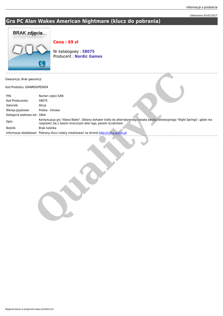 Informacje o produkcie Utworzono 03-03-2017 Gra PC Alan Wakes American Nightmare (klucz do pobrania) Cena : 69 zł Nr katalogowy : 58075 Producent : Nordic Games Gwarancja: Brak gwarancji Numer części EAN Kod Producenta: 58075 Gatunek: Akcja Wersja językowa: Polska - kinowa Kategoria wiekowa od:: 18lat yP P/N: C Kod Produktu: GIANRDGPE0004 Opis: Kontynuacja gry "Alana Wake". Główny bohater trafia do alternatywnego świata serialu telewizyjnego "Night Springs", gdzie ma rozprawić się z swoim mrocznym alter ego, panem Scratchem. Nośnik: Brak nośnika Q ua lit Informacje dodatkowe: Pobrany klucz należy zrealizować na stronie http://cyfra.action.pl Wygenerowano w programie www.oscGold.com