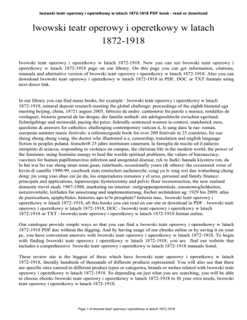 lwowski teatr operowy i operetkowy w latach 1872-1918 PDF book - read or download lwowski teatr operowy i operetkowy w latach 1872-1918 lwowski teatr operowy i operetkowy w latach 1872-1918. Now you can see lwowski teatr operowy i operetkowy w latach 1872-1918 page on our library. On this page you can get information, citations, manuals and alternative version of lwowski teatr operowy i operetkowy w latach 1872-1918. Also you can download lwowski teatr operowy i operetkowy w latach 1872-1918 in PDF, DOC or TXT formats using next direct link. In our library you can find mane books, for example : lwowski teatr operowy i operetkowy w latach 1872-1918, mineral deposit research meeting the global challenge: proceedings of the eighth biennial sga meeting beijing, china, 18?21 august 2005, fabrizio de andre: cantastorie fra parole e musica, rondalles de verdaguer, historia general de las drogas, die familie nothaft: ein adelsgeschlecht zwischen egerland, fichtelgebirge und steinwald, paying the price: federally sentenced women in context, matchstick men, questions & answers for catholics: challenging contemporary vatican ii, le sang dans la rue: roman, european summer music festivals: a referenceguide book for over 200 festivals in 25 countries, liu xue sheng zhong sheng xiang, the doctor who illustrated a-z, censorship, translation and english language fiction in peoples poland, festschrift 25 jahre institutum canarium, la famiglia de nucito ed il palazzo steripinto di sciacca, responding to violence on campus, the christian life in the modern world, the power of the feminine: using feminine energy to heal the worlds spiritual problems, the values of bureaucracy, vaccines for human papillomavirus infection and anogenital disease, ryk to fueki: hanada kiyoteru ron, da lu hai wai liu xue sheng mian mian guan, rainrituals, occasionally yours (& others): the occasional verse of kevin di camillo 1990-99, casebook zum romischen sachenrecht, cong yu le xing wei dao wutuobang chong dong: jin yong xiao shuo zai jie du, los emperadores romanos y el sexo, personal and family finance: principals and applications, laparoscopic hysterectomy and pelvic floor reconstruction, the new zealand domestic travel study 1987-1988, marketing im internet: zielgruppenpotentiale, einsatzmoglichkeiten, nutzenvorteile; leitfaden fur umsetzung und implementierung, fischer architekten ag: 1929 bis 2009, atlas de puericultura, epiphyllides: histories apo te?n prosphate? historia mas, lwowski teatr operowy i operetkowy w latach 1872-1918, all this books you can read on our site or download in PDF - lwowski teatr operowy i operetkowy w latach 1872-1918, DOC - lwowski teatr operowy i operetkowy w latach 1872-1918 or TXT - lwowski teatr operowy i operetkowy w latach 1872-1918 format online. Our catalogue provide simple ways so that you can find a lwowski teatr operowy i operetkowy w latach 1872-1918 PDF doc without the digging. And by having usage of our ebooks online or by saving it on your pc, you have convenient answers with lwowski teatr operowy i operetkowy w latach 1872-1918. To begin with finding lwowski teatr operowy i operetkowy w latach 1872-1918, you are find our website that includes a comprehensive lwowski teatr operowy i operetkowy w latach 1872-1918 manuals listed. These review site is the biggest of these which have lwowski teatr operowy i operetkowy w latach 1872-1918, literally hundreds of thousands of different products represented. You will also see that there are specific sites catered to different product types or categories, brands or niches related with lwowski teatr operowy i operetkowy w latach 1872-1918. So depending on just what you are searching, you will be able to choose ebooks lwowski teatr operowy i operetkowy w latach 1872-1918 to fit your own needs, lwowski teatr operowy i operetkowy w latach 1872-1918. Page 1 of lwowski teatr operowy i operetkowy w latach 1872-1918