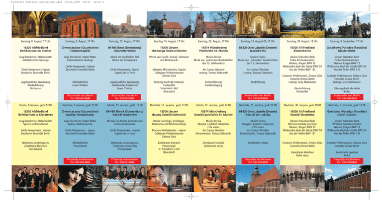 Faltblatt Kulturbr cke-aktuell.qxd Kloster Altfriedland 29.06.2009 08:00 Seite 2 Chwarszczany Johanniterkirche Slonsk Komtureikirche Lietzen Marienkirche Müncheberg Jacobikirche Osno Lubuskie Klostersee Altfriedland Kloster Paradies Samstag, 8. August, 17 Uhr Sonntag, 9. August, 17 Uhr Samstag, 15. August, 17 Uhr Sonntag, 16. August, 17 Uhr Samstag, 22. August, 17 Uhr Sonntag, 23. August 09, 17 Uhr Sonntag, 30. August, 18 Uhr Sonntag, 6. September, 17 Uhr 15320 Altfriedland Refektorium im Kloster Chwarszczany (Quartschen) Templerkapelle 66-436 Slonsk (Sonnenburg) Johanniterkirche 15306 Lietzen ehemalige Komtureikirche 15374 Müncheberg Pfarrkirche St. Marien 68-220 Osno Lubuskie (Drossen) Jacobikirche 15320 Altfriedland Klosterkirche Goscikowo/Paradyz (Paradies) Klosterkirche Luigi Boccherini: Stabat Mater mittelalterliche Gesänge Luigi Boccherini: Stabat Mater mittelalterliche Gesänge Musik am kastilischen Hof Werke der Renaissance Werke von Corelli, Vivaldi, Telemann und Mielczewski Musica Divina Musik aus polnischen Handschriften des 15. Jahrhunderts Musica Divina Musik aus polnischen Handschriften des 15. Jahrhunderts Cécile Kempenaers, Sopran Capella de la Torre Marzena Michalowska, Sopran Collegium Viridimontanum Zielona Góra Ars Cantus Wroclaw Leitung: Tomasz Dobranski Ars Cantus Wroclaw Leitung: Tomasz Dobranski Johann Sebastian Bach Frühe Kirchenkantaten Weinen, Klagen BWV 12 Widerstehe doch der Sünde BWV 54 Aus der Tiefen BWV 131 Johann Sebastian Bach Frühe Kirchenkantaten Weinen, Klagen BWV 12 Widerstehe doch der Sünde BWV 54 Aus der Tiefen BWV 131 Mittelalterfest Essen /Trinken vogelkundliche Wanderung traditionelles Fischerfest Essen /Trinken Führung durch die Komturei Fischbuffet Schechtert’s Hof (Marxdorf) Kirchenführung Turmbesteigung Stadtführung Cantores Viridimontani, Zielona Góra Concerto Grosso Berlin Leitung: Jerzy Markiewicz Cantores Viridimontani, Zielona Góra Concerto Grosso Berlin Leitung: Jerzy Markiewicz Klosterführung Fischbuffet Führung durch die Abtei Buffet Bustransfer von Berlin Tel: 030-6914844 Bustransfer von Berlin Tel: 030-6914844 Sobota, 8 sierpnia, godz.17.00 Niedziela, 9 sierpnia, godz.17.00 Sobota, 15. sierpnia, godz. 17.00 Niedziela, 16. sierpnia, godz.17.00 Sobota, 22. sierpnia, godz.17.00 Niedziela, 23. sierpnia, godz.17.00 Niedziela, 30. sierpnia, godz.18.00 Niedziela, 6. wrzesnia, godz.17.00 15320 Altfriedland Refektorium w Klasztorze Chwarszczany (Quartschen) Kaplica Templariuszy 66-436 Slonsk (Sonnenburg) Kosciól Joannitów 15306 Lietzen dawny Kosciól komturski 15374 Müncheberg Kosciól parafialny St. Marien 68-220 Osno Lubuskie (Drossen) Kosciól sw. Jakuba 15320 Altfriedland Kosciól klasztorny Goscików /Paradyz (Paradies) Kosciól klasztorny Luigi Boccherini: Stabat Mater Spiewy sredniowieczne Luigi Boccherini: Stabat Mater Spiewy sredniowieczne Muzyka na dworze kastylianskim Dziela renesansowe Dziela Corelliego, Vivaldiego, Telemanna und Mielczewskiego Cécile Kempenaers - sopran Boccherini Ensemble Berlin Cécile Kempenaers - sopran Boccherini Ensemble Berlin Cécile Kempenaers - sopran Capella de la Torre Marzena Michalowska - sopran Collegium Viridimontanum Zielona Góra Musica Divina Muzyka z polskich rekopisów z XV wieku Ars Cantus Wroclaw Kierownictwo: Tomasz Dobranski Musica Divina Muzyka z polskich rekopisów z XV wieku Ars Cantus Wroclaw Kierownictwo: Tomasz Dobranski Johann Sebastian Bach Wczesne kantaty koscielne Weinen, Klagen BWV 12 Widerstehe doch der Sünde BWV 54 Aus der Tiefen BWV 131 Johann Sebastian Bach Wczesne Kantaty koscielne Weinen, Klagen BWV 12 Widerstehe doch der Sünde BWV 54 Aus der Tiefen BWV 131 Wedrówka ornitologiczna Zwiedzanie klasztoru Poczestunek Mittelalterfest Poczestunek Wedrówka ornitologiczna Tradycyjne swieto ryby Poczestunek Zwiedzania Komturii Poczestunek w Schechtert's Hof (Marxdorf) Zwiedzanie kosciola Zwiedzanie wiezy Zwiedzanie miasta Cantores Viridimontani, Zielona Góra Concerto Grosso Berlin Cantores Viridimontani, Zielona Góra Concerto Grosso Berlin Zwiedzanie klasztoru Bufet rybny Zwiedzanie opactwa Bufet Cécile Kempenaers Sopran Boccherini Ensemble Berlin vogelkundliche Wanderung Klosterführung Fischessen Cécile Kempenaers, Sopran Boccherini Ensemble Berlin Przejazdy autobusowe Tel: 030-6914844 Boccherini-Ensemble Cécile Kempenaers Bustransfer von Berlin Tel: 030-6914844 Przejazdy autobusowe Tel: 030-6914844 Capella de la Torre Bustransfer von Berlin Tel: 030-6914844 Przejazdy autobusowe Tel: 030-6914844 Przejazdy autobusowe Tel: 030-6914844 Marzena Michalowska Komtureikirche Lietzen Ars Cantus Jacobikirche Osno Lubuskie Cantores Viridimontani Kloster Paradies Faltblatt Kulturbr cke-aktuell.qxd 29.06.2009 08:00 Seite 1 ÜBERSICHT / PRZEGLAD BUSTRANSFER /PRZEJAZDY AUTOBUSOWE von Berlin zu den Veranstaltungen in Polen Sonntag 9. August 12 Uhr 13.15 Uhr 19 Uhr Chwarszczany Abfahrt Berlin, Fehrbelliner Platz Zustiegsmöglichkeit Müncheberg Rückfahrt nach dem Konzert Bustransfer 35,00 Euro Samstag 15. August 12 Uhr 13.15 Uhr 19 Uhr Slonsk Abfahrt Berlin, Fehrbelliner Platz Zustiegsmöglichkeit Müncheberg Rückfahrt nach dem Konzert Bustransfer 35,00 Euro Sonntag 23. August 12 Uhr 13.15 Uhr 19 Uhr Osno Lubuskie Abfahrt Berlin, Fehrbelliner Platz Zustiegsmöglichkeit Müncheberg Rückfahrt nach dem Konzert Bustransfer 35,00 Euro Sonntag 6. September 12 Uhr 13.15 Uhr 20 Uhr Goscikowo/Paradyz Abfahrt Berlin, Fehrbelliner Platz Zustiegsmöglichkeit Müncheberg Rückfahrt nach dem Konzert Bustransfer 40,00 Euro Anmeldung Telefon Mail Konto Po obu stronach Odry rozciaga sie miedzy Frankfurtem a Kostrzynem Ziemia Lubuska. To stary region kulturowy, który dzis jest przedzielony rzeka graniczna na czesc niemiecka i czesc polska. Od czasów sredniowiecza region ten byl jednorodny kulturowo. Z tych czasów istnieja liczne dobrze zachowane zabytki, miedzy innymi caly rzad gotyckich kosciolów, klasztorów i kaplic. Projekt KULTUROWY MOST NAD ODRA powstal z zamyslem zo